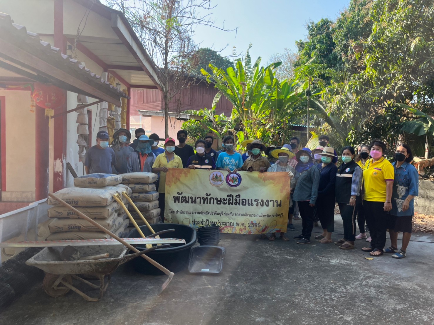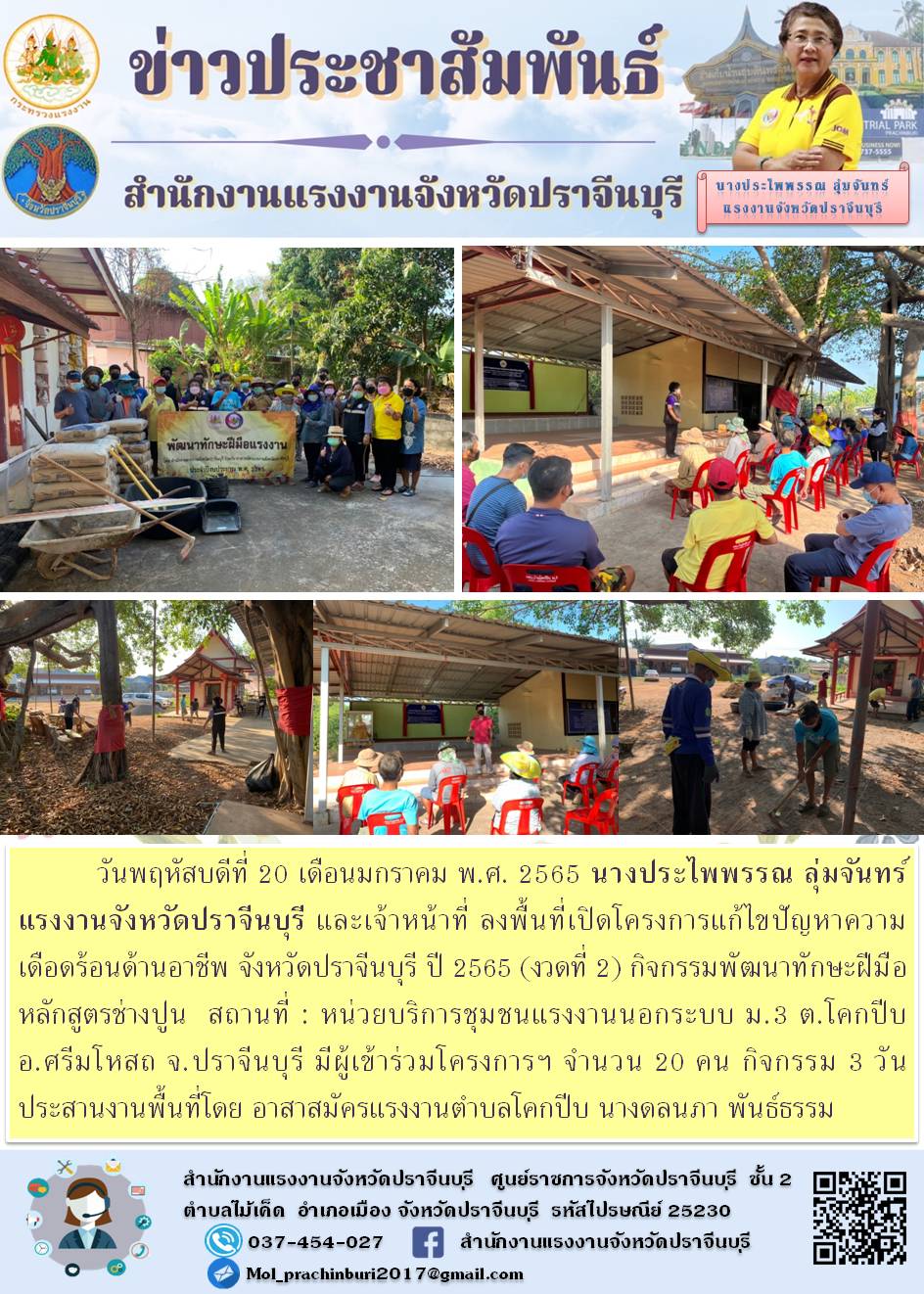 วันพฤหัสบดีที่ 20 เดือนมกราคม พ.ศ. 2565 นางประไพพรรณ ลุ่มจันทร์ แรงงานจังหวัดปราจีนบุรี และเจ้าหน้าที่ ลงพื้นที่เปิดโครงการแก้ไขปัญหาความเดือดร้อนด้านอาชีพ จังหวัดปราจีนบุรี ปี 2565 (งวดที่ 2) กิจกรรมพัฒนาทักษะฝีมือ หลักสูตรช่างปูน สถานที่ : หน่วยบริการชุมชนแรงงานนอกระบบ ม.3 ต.โคกปีบ อ.ศรีมโหสถ จ.ปราจีนบุรี มีผู้เข้าร่วมโครงการฯ จำนวน 20 คน กิจกรรม 3 วัน ประสานงานพื้นที่โดย อาสาสมัครแรงงานตำบลโคกปีบ นางดลนภา พันธ์ธรรม