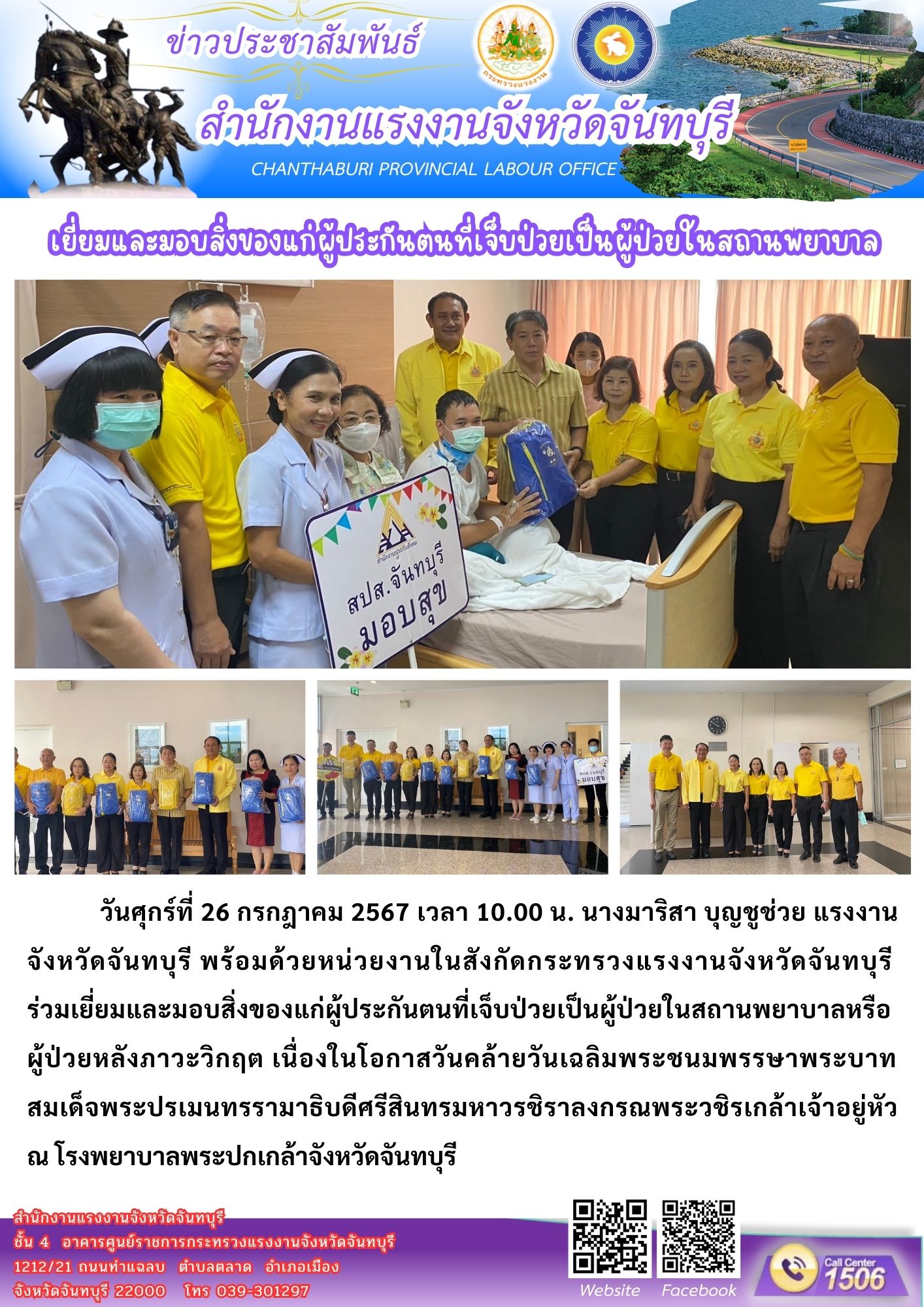 นางมาริสา บุญชูช่วย แรงงานจังหวัดจันทบุรี พร้อมด้วยหน่วยงานในสังกัดกระทรวงแรงงานจังหวัดจันทบุรี ร่วมเยี่ยมและมอบสิ่งของแก่ผู้ประกันตนที่เจ็บป่วยเป็นผู้ป่วยในสถานพยาบาล