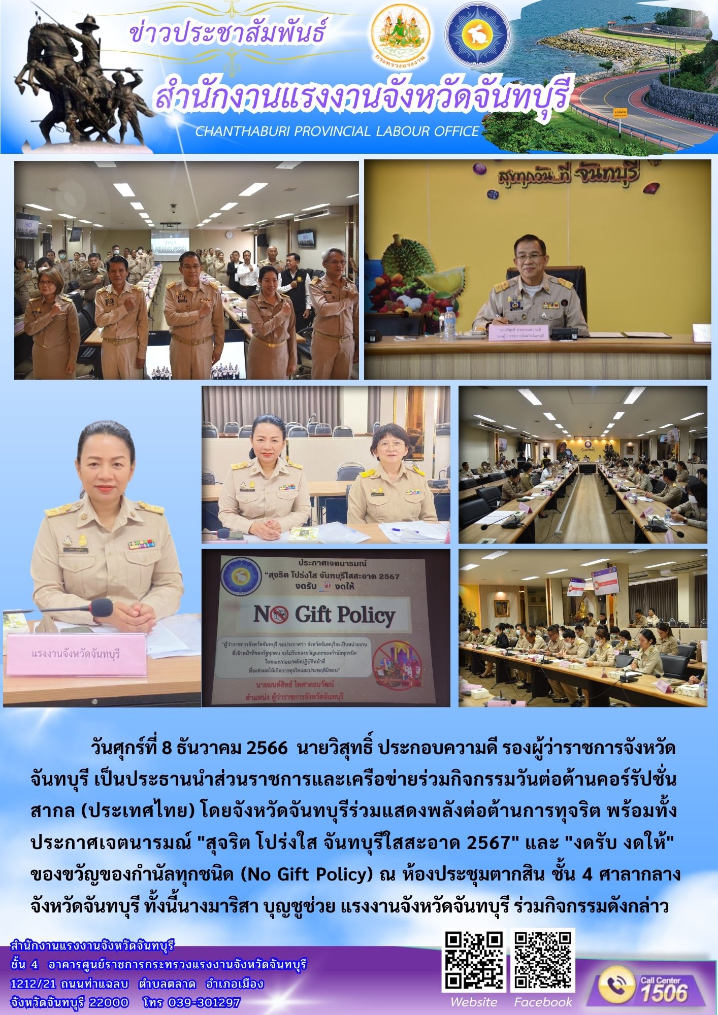 สรจ.จันทบุรี ร่วมกิจกรรมวันต่อต้านคอร์รัปชั่นสากล (ประเทศไทย) โดยจังหวัดจันทบุรีร่วมแสดงพลังต่อต้านการทุจริต พร้อมทั้งประกาศเจตนารมณ์ “สุจริต โปร่งใส จันทบุรีใสสะอาด 2567” และ “งดรับ งดให้”ของขวัญของกำนัลทุกชนิด (No Gift Policy)