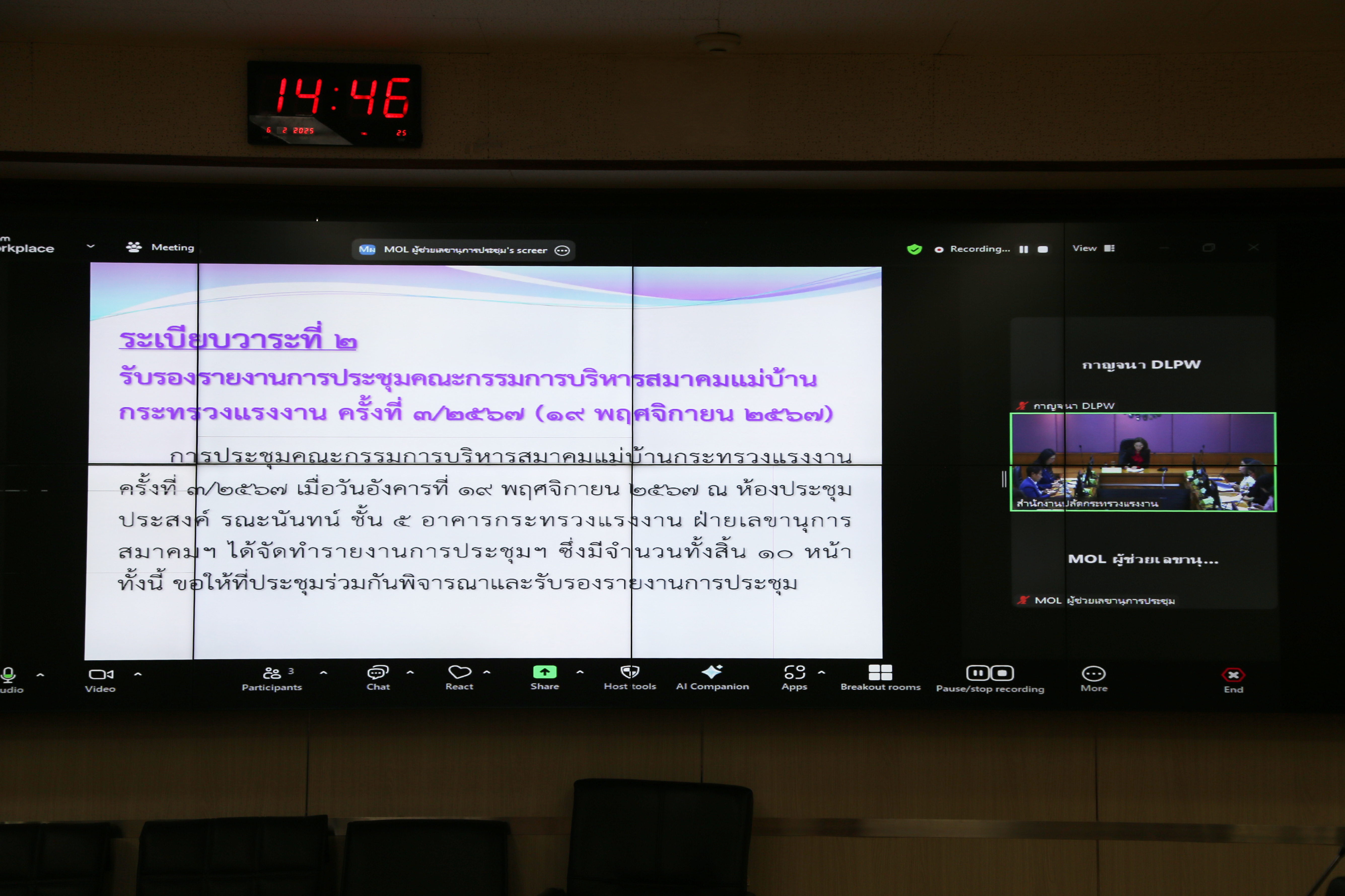 วันที่ 6 กุมภาพันธ์ 2568 เวลา 14.30 น. นางสาวเทียนแข ทัพชัยยุทธ์ นายกสมาคมแม่บ้านกระทรวงแรงงาน เป็นประธานการประชุมคณะกรรมการบริหารของสมาคมแม่บ้านกระทรวงแรงงาน ครั้งที่ 1/2568 ณ ห้องประชุมประสงค์ รณะนันทน์ ชั้น 5 อาคารกระทรวงแรงงาน