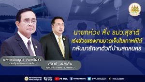 “ท่านนายกรัฐมนตรีห่วงใยมาก และกำชับให้กระทรวงแรงงานเร่งประสานความช่วยเหลือและติดตามสิทธิประโยชน์ตามกฎหมายโดยด่วน เพื่อให้ได้เดินทางกลับมาพักรักษาตัวกับครอบครัว กรณีนี้ถือเป็นตัวอย่างของแรงงานไทยที่เดินทางไปทำงานอย่างถูกต้องตามกฎหมาย และได้สมัครเป็นสมาชิกกองทุนเพื่อช่วยเหลือคนหางานไปทำงานในต่างประเทศ หากประสบเหตุไม่คาดคิดในต่างประเทศ เงินสงเคราะห์ในส่วนนี้จะเป็นประโยชน์มากในการดูแลคุ้มครองสิทธิประโยชน์และบรรเทาความเดือดร้อนในเบื้องต้นได้” นายสุชาติ กล่าวในท้ายสุด
