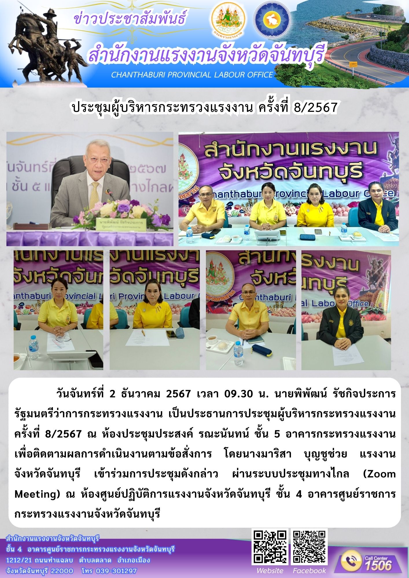นายพิพัฒน์ รัชกิจประการ รัฐมนตรีว่าการกระทรวงแรงงาน เป็นประธานการประชุมผู้บริหารกระทรวงแรงงาน ครั้งที่ 8/2567