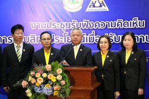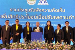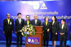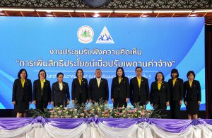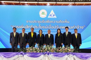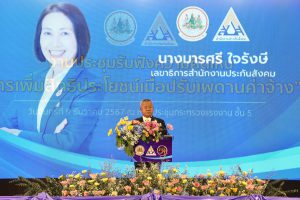 ด้าน นางมารศรี ใจรังษี เลขาธิการสำนักงานประกันสังคม กล่าวว่า สำนักงานประกันสังคมได้ปรับปรุงสิทธิประโยชน์ ที่ไม่ได้อิงกับฐานเพดานค่าจ้าง ให้แก่ผู้ประกันตนตลอดมา เพื่อความเหมาะสมและสอดคล้องกับสภาพเศรษฐกิจ เช่น กรณีคลอดบุตร ในปี พ.ศ. 2538 ได้รับสิทธิประโยชน์เป็นเงินจำนวน 4,000 บาท/ครั้ง ในปัจจุบันเพิ่มเป็นเงินจำนวน 15,000 บาท/ครั้ง เงินสงเคราะห์บุตร ในปี พ.ศ. 2541 ได้รับสิทธิประโยชน์เป็นเงินจำนวน 150 บาท/เดือน/บุตร 1 คน สูงสุด 2 คน ในปัจจุบันเพิ่มเป็น 800 บาท/เดือน/บุตร 1 คน สูงสุด 3 คน และในกรณีตาย เงินค่าทำศพ ในปี พ.ศ. 2538 จ่ายเป็นจำนวนเงิน 20,000 บาท ปัจจุบันเงินเพิ่มเป็นค่าทำศพ 50,000 บาท เป็นต้น ส่วนสิทธิประโยชน์ที่อิงกับฐานเพดานค่าจ้าง ไม่ว่าจะเป็น เงินทดแทนการขาดรายได้กรณีเจ็บป่วย กรณีทุพพลภาพ กรณีว่างงาน เงินสงเคราะห์การหยุดงานเพื่อการคลอดบุตร เงินสงเคราะห์กรณีเสียชีวิต และเงินบำเหน็จ – บำนาญชราภาพ เมื่อไม่มีการปรับฐานเพดานค่าจ้าง ทำให้ผู้ที่มีค่าจ้างมากกว่า 15,000 บาท ถูกจำกัดสิทธิประโยชน์ไว้ และไม่สอดคล้องกับค่าจ้างจริงในปัจจุบัน จึงสมควรปรับปรุงฐานเพดานค่าจ้างให้เหมาะสม เพื่อให้ผู้ประกันตนได้รับสิทธิประโยชน์ที่เพิ่มขึ้น และสอดคล้องกับสภาพเศรษฐกิจ อันเป็นที่มาของการประชุมรับฟังความคิดในวันนี้ เพื่อเป็นแนวทางในการพัฒนาและยกระดับคุณภาพชีวิตให้แก่ผู้ประกันตนต่อไปในอนาคต