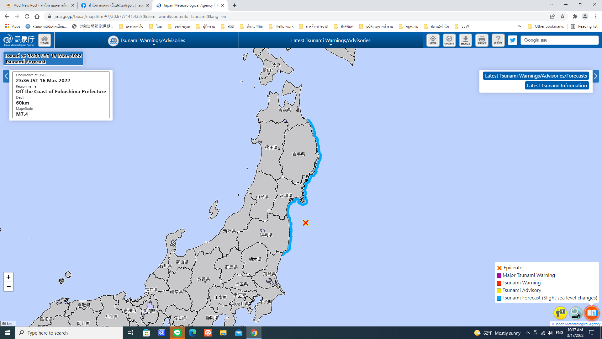 ตามที่สำนักงานแรงงานในประเทศญี่ปุ่นได้ประกาศแจ้งเตือนภัยสึนามิในพื้นที่จังหวัดมิยางิและฟุคุชิมะในสื่อสังคมออนไลน์ โดยอ้างอิงข้อมูลจากกรมอุตุนิยมวิทยาญี่ปุ่น เนื่องจากช่วงดึกของวันที่ 16 มีนาคม 2565 เวลาประมาณ 23:36 น. ตามเวลาท้องถิ่นประเทศญี่ปุ่น เกิดแผ่นดินไหวขนาดรุนแรง M 7.3 (วัดแรงสั่นสะเทือนได้สูงสุดระดับ 6+ ตามมาตรวัดญี่ปุ่น) มีศูนย์กลางในทะเลใกล้จังหวัดฟุคุชิมะ ความลึก 60 กิโลเมตร รู้สึกได้หลายพื้นที่ตามแนวชายฝั่งทะเลของญี่ปุ่น