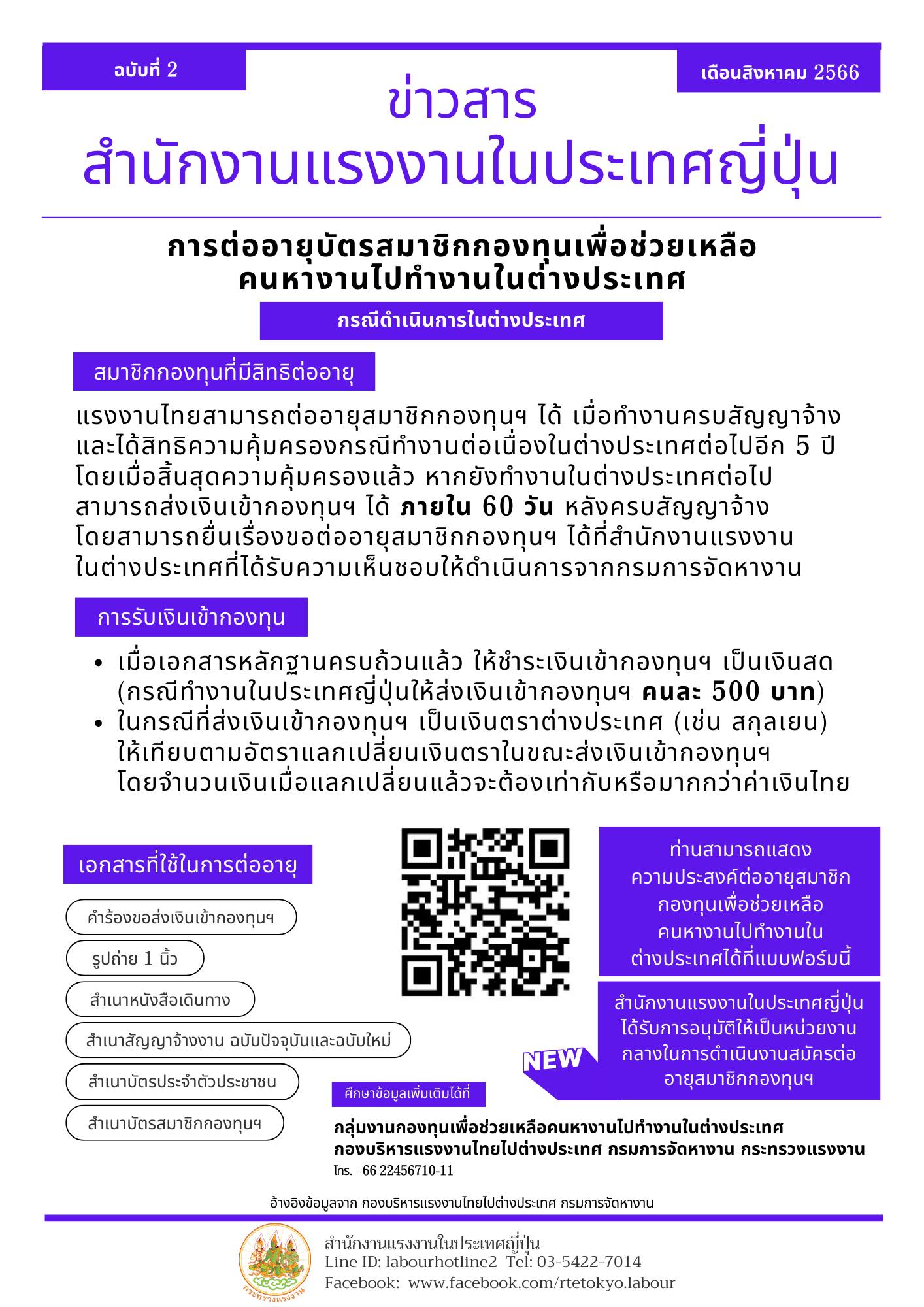 สมาชิกกองทุนเพื่อช่วยเหลือคนหางานไปทำงานในต่างประเทศสามารถต่ออายุสมาชิกกองทุนฯ ได้ที่สำนักงานแรงงานในประเทศญี่ปุ่นแล้ว ผู้สนใจกรุณาให้ข้อมูลเพื่อเจ้าหน้าที่จะได้ติดต่อกลับที่ https://forms.office.com/r/vVg67sreHv