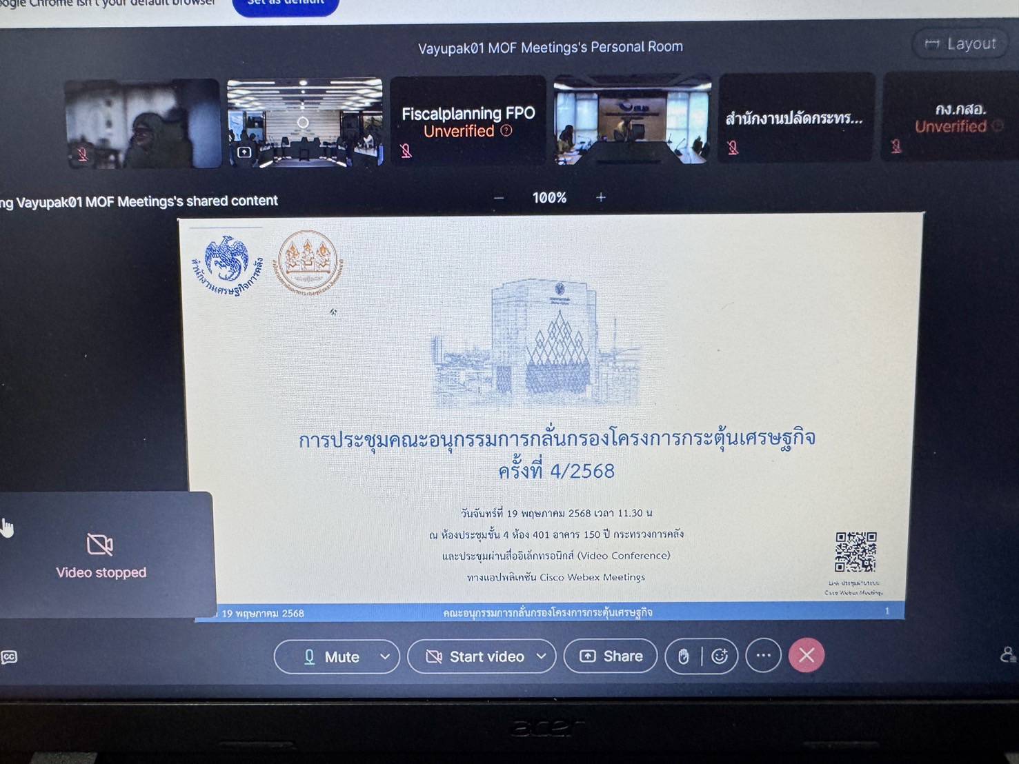 วันที่ 19 พฤษภาคม 2568 เวลา 11.30 น. นายบุญสงค์ ทัพชัยยุทธ์ ปลัดกระทรวงแรงงาน มอบหมายให้ นางสาวกรจิรัฏฐ์ พงจันทร์ศธร ผู้ช่วยปลัดกระทรวงแรงงาน ร่วมประชุมคณะอนุกรรมการกลั่นกรองโครงการกระตุ้นเศรษฐกิจ ครั้งที่ 4/2568 โดยมี นายพิชัย ชุณหวชิร รองนายกรัฐมนตรีและรัฐมนตรีว่าการกระทรวงการคลัง เป็นประธานการประชุม และมีหน่วยงานที่เกี่ยวข้องเข้าร่วมการประชุม ผ่านสื่ออิเล็กทรอนิกส์ (VIDEO Conference) ทางแอปพลิเคชั่น Cisco Webex Meeting