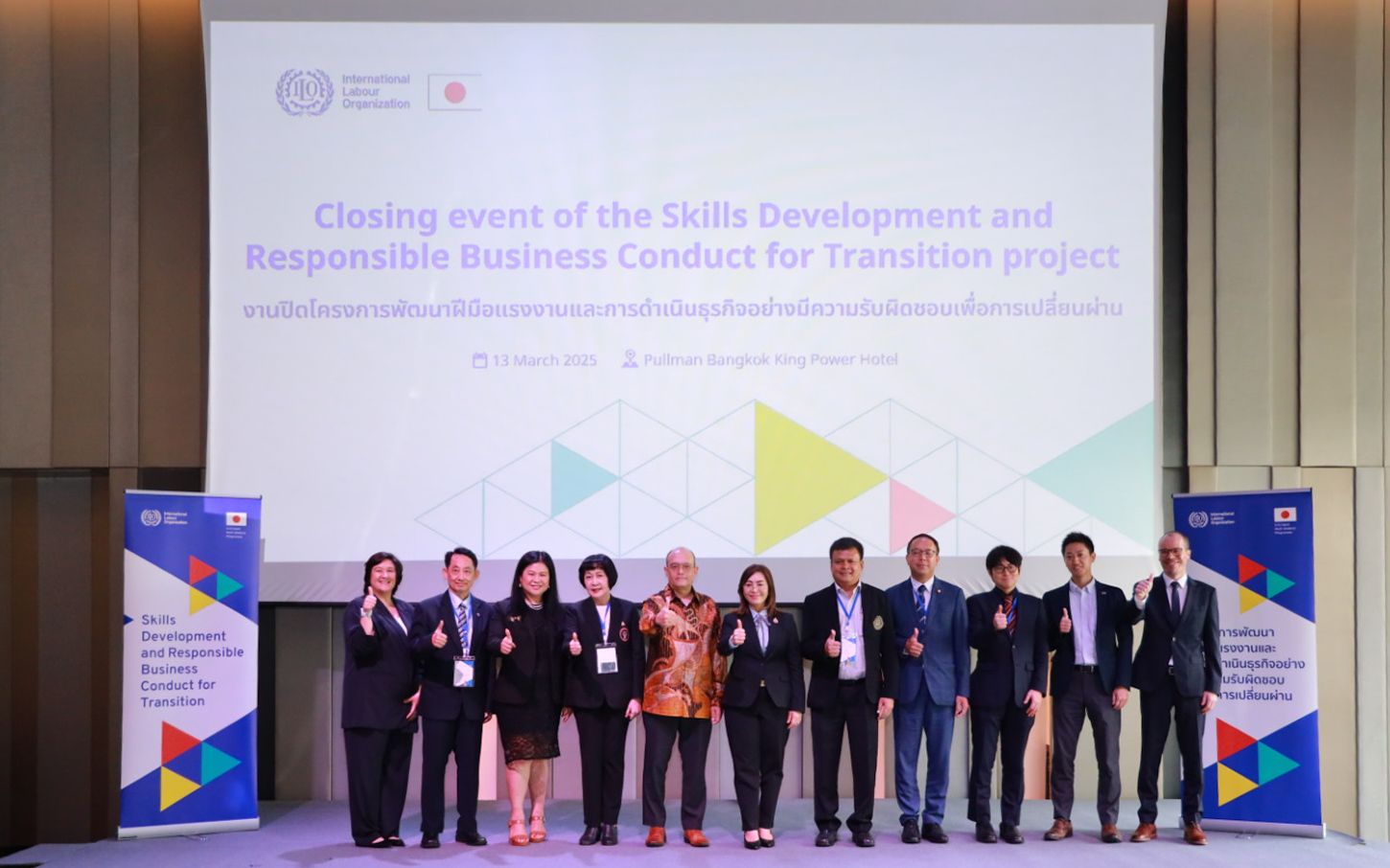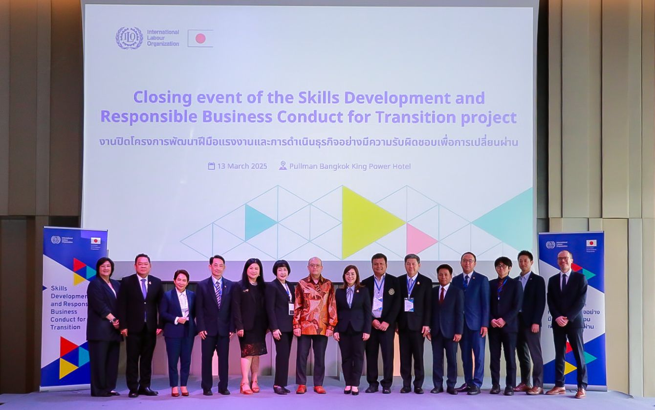 วันที่ 13 มีนาคม 2568 เวลา 10.30 น. นายบุญสงค์ ทัพชัยยุทธ์ ปลัดกระทรวงแรงงาน มอบหมายให้ นางสาวบุปผา เรืองสุด รองปลัดกระทรวงแรงงาน เป็นประธานปิดโครงการพัฒนาฝีมือแรงงานและการดำเนินธุรกิจอย่างมีความรับผิดชอบ เพื่อการเปลี่ยนผ่านในประเทศไทย โดยมี คุณอ๊อคตาเวียนโต้ พาซาริบู รองผู้อำนวยการสำนักงานแรงงานระหว่างประเทศ ประจำประเทศไทย กัมพูชา และ สปป. ลาว คุณสิริวัน ร่วมฉัตรทอง เลขาธิการสภาองค์การนายจ้างแห่งประเทศไทย คุณมานพ เกื้อรัตน์ เลขาธิการสมาพันธ์แรงงานรัฐวิสาหกิจสัมพันธ์ ร่วมเสวนา นายศักดินาถ สนธิศักดิ์โยธิน ผู้ช่วยปลัดกระทรวงแรงงาน ผู้เข้าร่วมประชุม พร้อมด้วยหน่วยงานที่เกี่ยวข้อง เข้าร่วม ณ โรงแรมพูลแมน คิง พาวเวอร์ ถนนรางน้ำ เขตราชเทวี กรุงเทพมหานคร