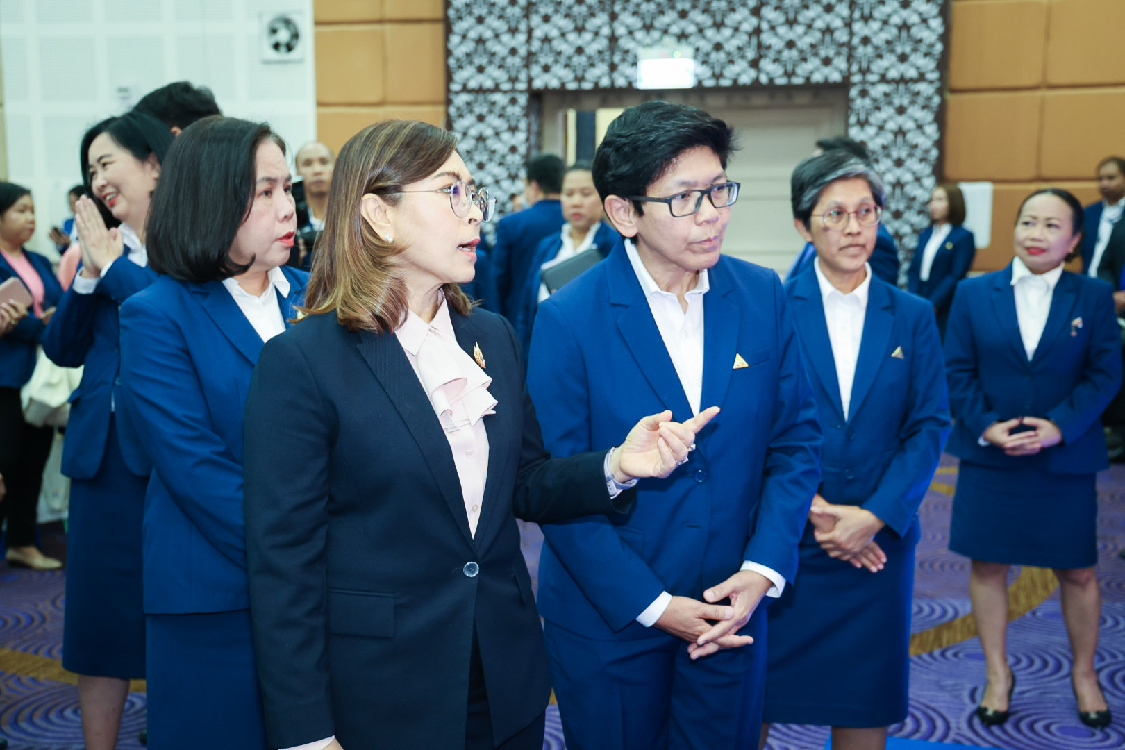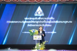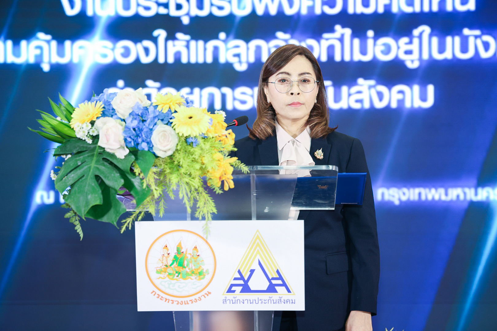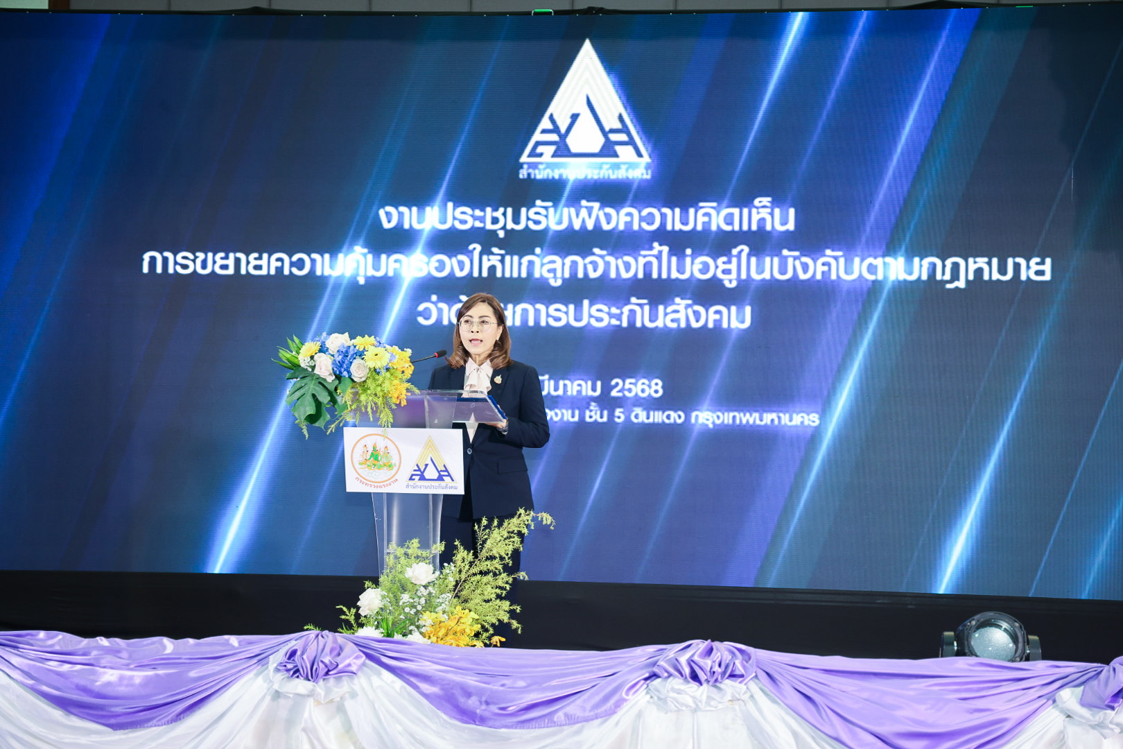ด้าน นางมารศรี ใจรังษี เลขาธิการสำนักงานประกันสังคม กล่าวประชาสัมพันธ์เชิญชวนนายจ้าง ลูกจ้าง ประชาชนทั่วไปว่า สำนักงานประกันสังคมได้เปิดรับฟังความคิดเห็นเพื่อขยายความคุ้มครอง ในช่วงวันที่ 7 กุมภาพันธ์ 2568 ถึงวันที่ 25 มีนาคม 2568 โดยเปิดรับฟังความคิดเห็นผ่านช่องทางต่าง ๆ จัดรับฟังความคิดเห็นผ่านระบบกลางทางกฎหมาย ในช่วงวันที่ 1 – 15 มีนาคม 2568 จัดรับฟังความคิดเห็นผ่านเว็บไซต์สำนักงานประกันสังคม ในช่วงวันที่ 1 – 15 มีนาคม 2568 และจัดประชุมรับฟังความคิดเห็นในรูปแบบ Focus Group 2 ครั้ง ได้แก่ รับฟังความคิดเห็นจากลูกจ้างในครัวเรือนที่ทำงานให้กับนายจ้างส่วนบุคคล และการค้าแผงลอย ณ สำนักงานประกันสังคม ในวันที่ 26 กุมภาพันธ์ 2568 จำนวน 50 คน และกลุ่มนายจ้าง ลูกจ้างของกิจการเพาะปลูก ประมง ป่าไม้ เลี้ยงสัตว์ ณ สำนักงานประกันสังคมจังหวัดสมุทรสาคร ในวันที่ 11 มีนาคม 2568 จำนวน 50 คน สำหรับกำหนดการประชุมรับฟังความคิดเห็นในวันนี้ จะเป็นการเสวนาในหัวข้อ “การขยายความคุ้มครองให้แก่ลูกจ้างที่ไม่อยู่ในบังคับตามกฎหมายว่าด้วยการประกันสังคม” จากวิทยากรผู้ทรงคุณวุฒิ จากนั้นจะได้เปิดเวทีเพื่อรับฟังความคิดเห็น และแลกเปลี่ยนความคิดเห็นระหว่างผู้เข้าร่วมประชุมและคณะวิทยากร การประชุมในวันนี้มีผู้เข้าร่วมประชุม จำนวน 300 คน ประกอบด้วยผู้แทนจากภาคส่วนต่างๆ ดังนี้ ผู้บริหารกระทรวงแรงงานและผู้บริหารสำนักงานประกันสังคม คณะกรรมการประกันสังคมผู้แทนฝ่ายนายจ้างและผู้แทนฝ่ายลูกจ้าง ผู้อำนวยการสถาบันส่งเสริมความปลอดภัย อาชีวอนามัย และสภาพแวดล้อมในการทำงาน กรรมการผู้แทนฝ่ายนายจ้าง กรรมการผู้แทนฝ่ายลูกจ้าง นายจ้างและลูกจ้างในกิจการทั้ง สามกลุ่มที่เกี่ยวข้องและผู้แทนสื่อมวลชน