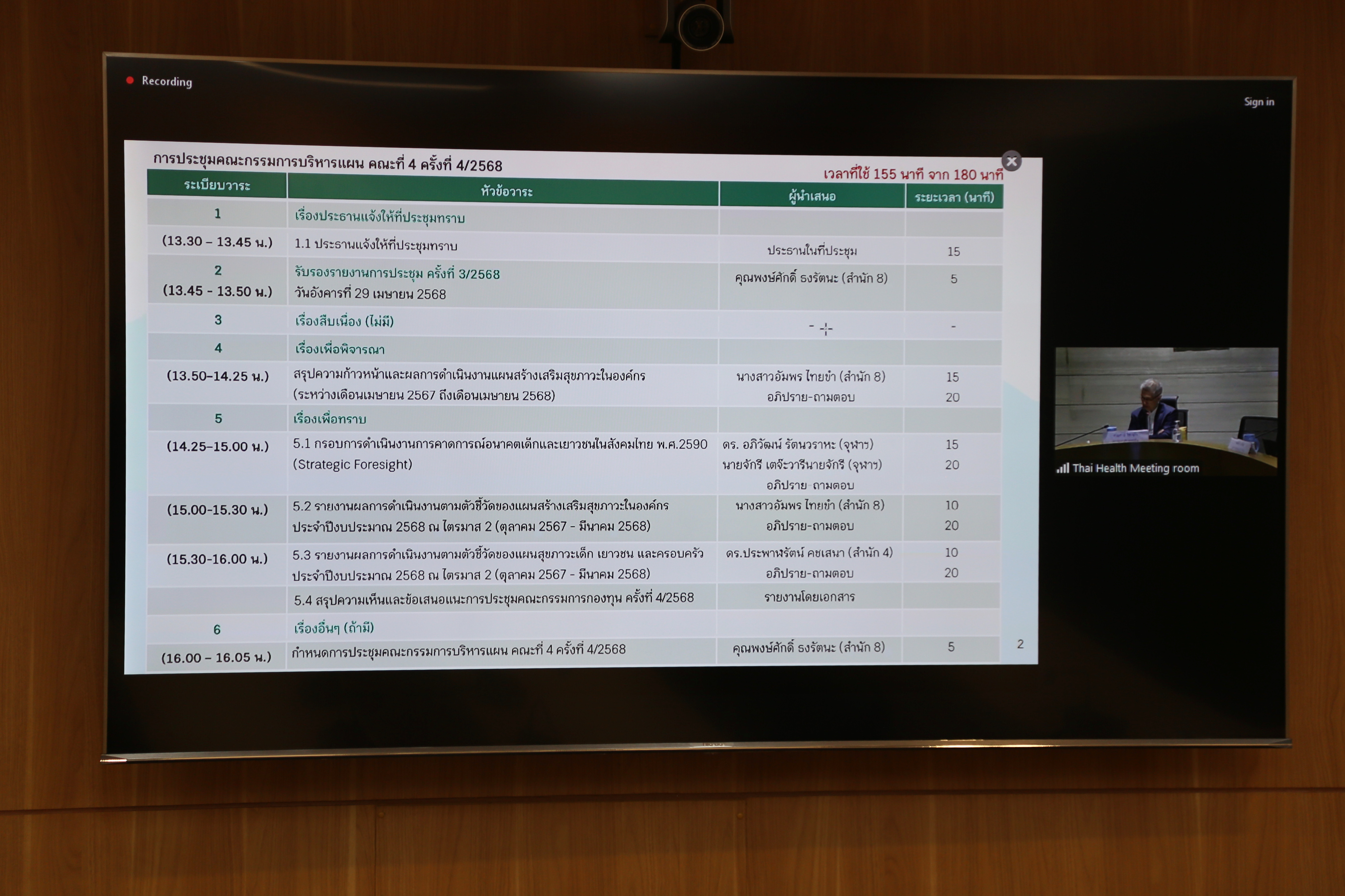 สำหรับการประชุมในครั้งนี้ คณะกรรมการบริหารแผน คณะที่ 4/2568 ได้พิจารณาสรุปความก้าวหน้าและผลการดำเนินงานแผนสร้างเสริมสุขภาวะในองค์กร (ระหว่างเดือนเมษายน 2567 ถึงเดือนเมษายน 2568) และได้แจ้งให้ทราบ อาทิ กรอบการดำเนินงาน การคาดการณ์อนาคตเด็กและเยาวชนในสังคมไทย พ.ศ.2590 รายงานผลการดำเนินงานตามตัวชี้วัดของแผนสร้างเสริมสุขภาวะในองค์กร ประจำปีงบประมาณ 2568 ณ ไตรมาส 2 (ตุลาคม 2567 -มีนาคม 2568) เป็นต้น