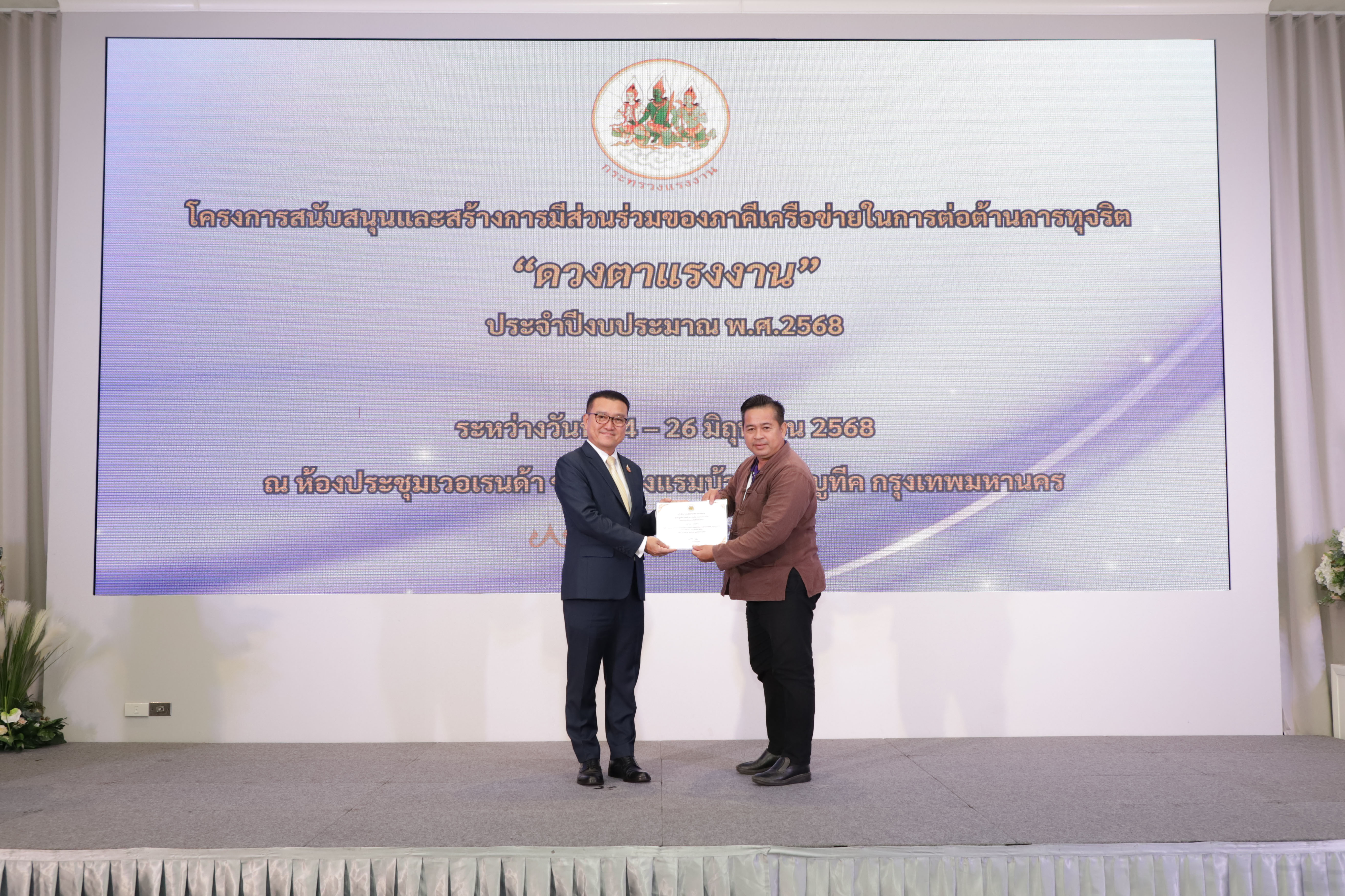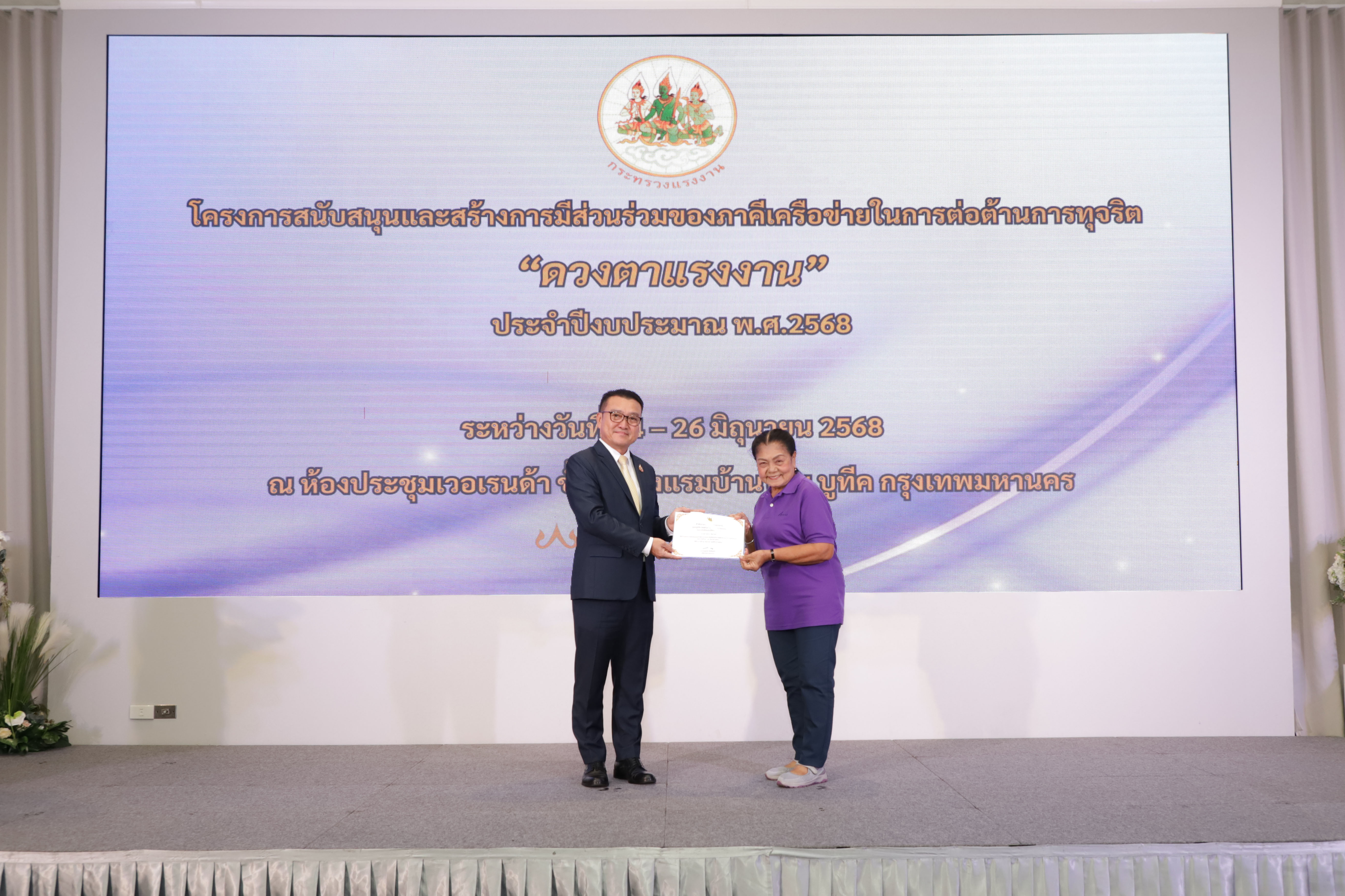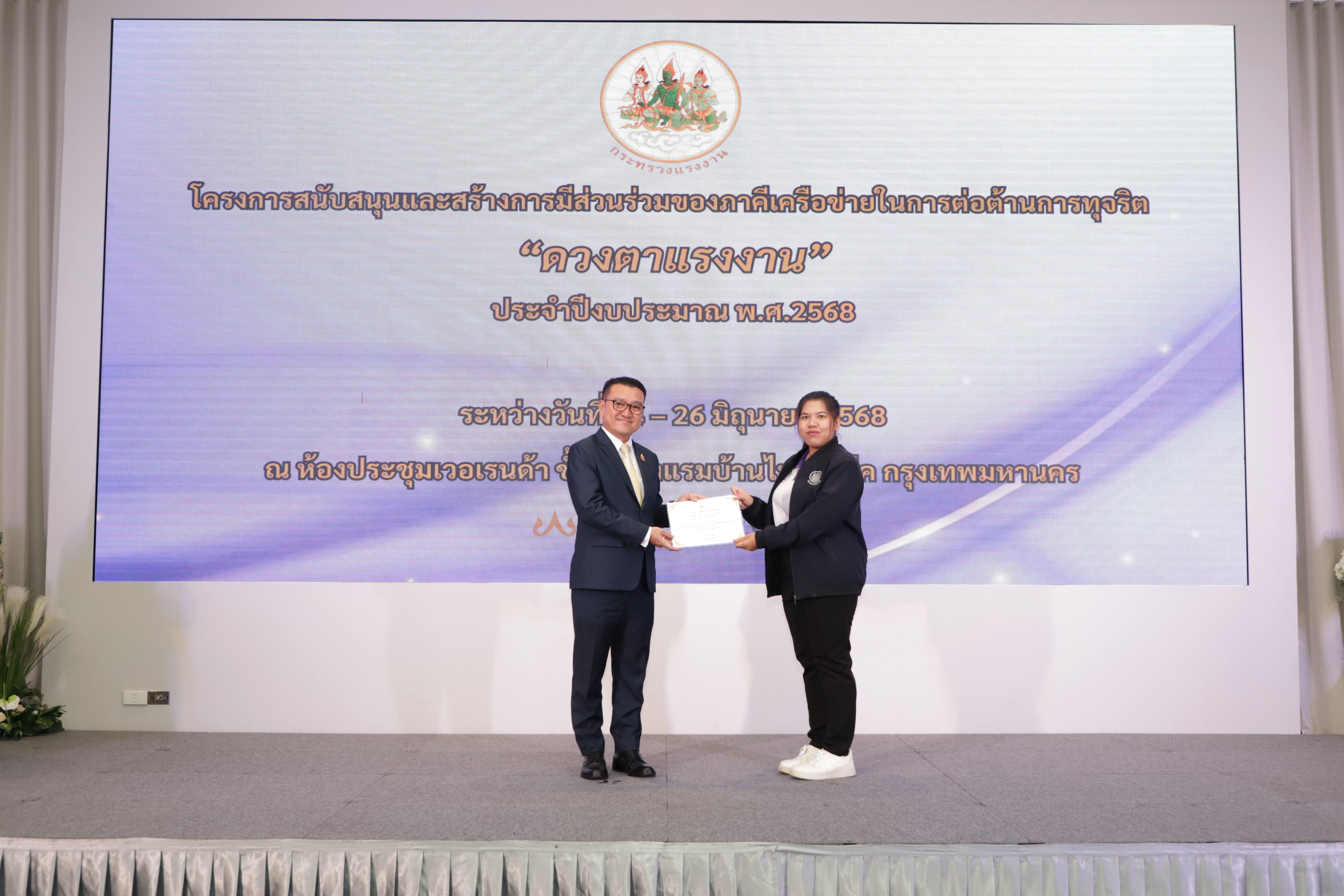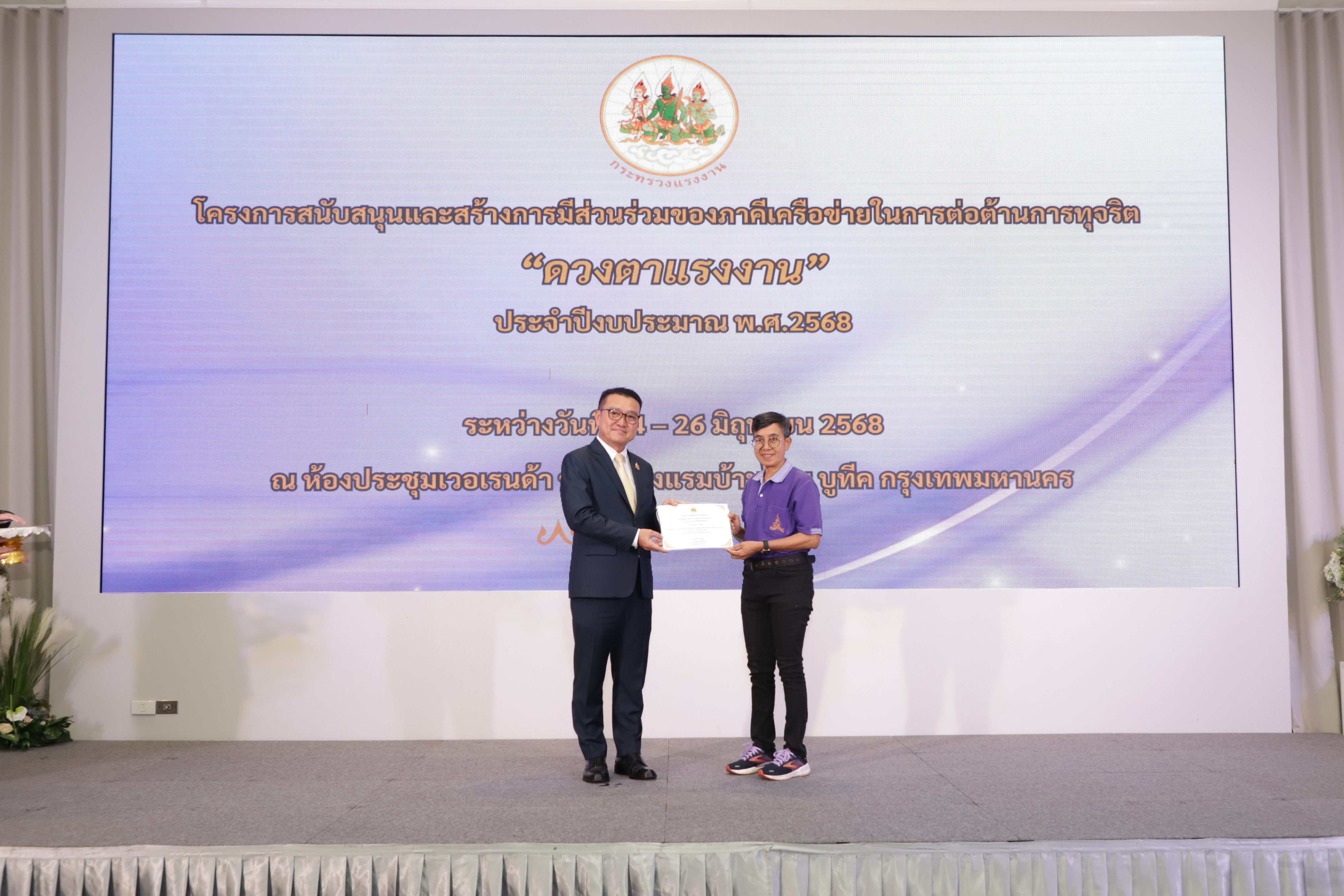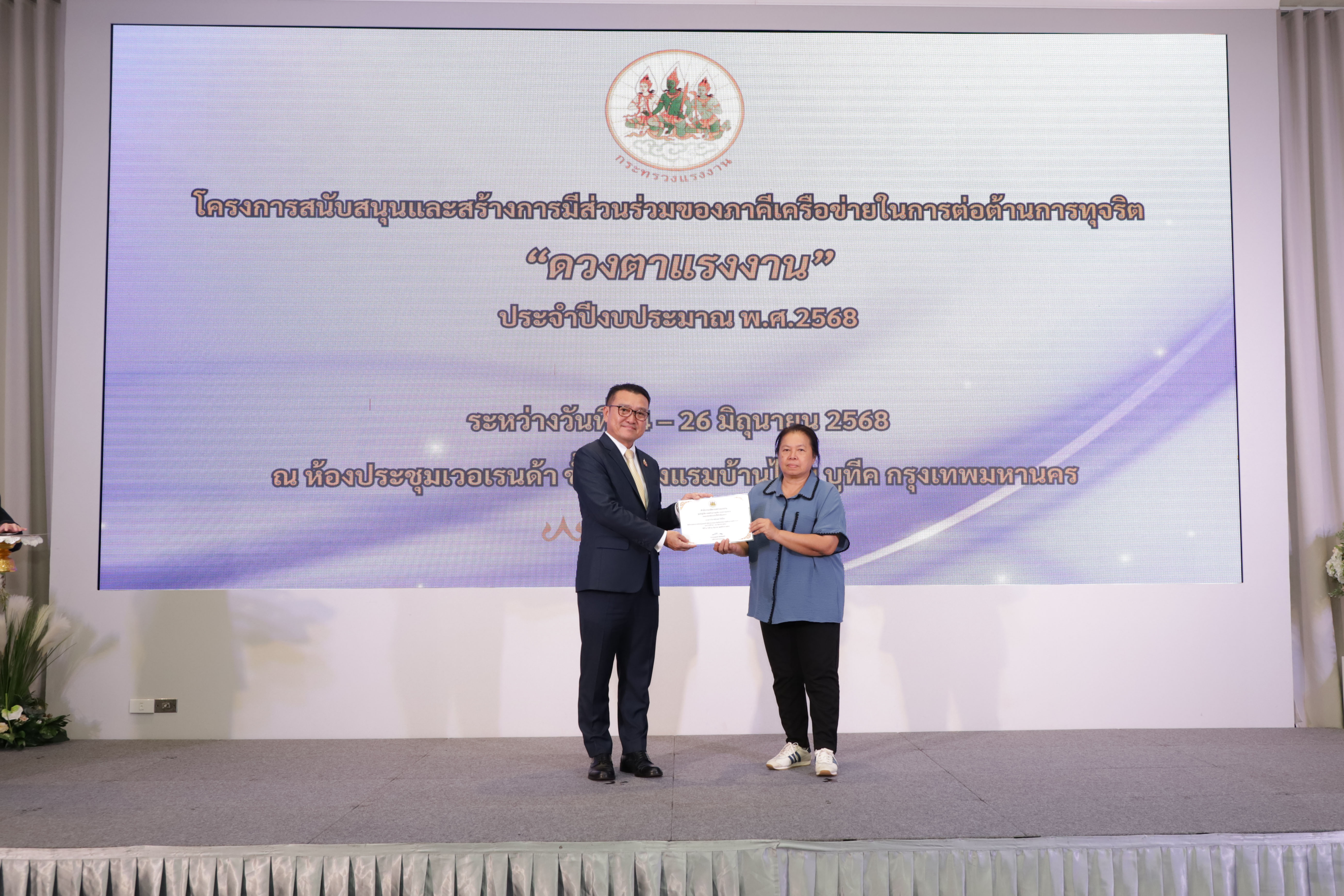 วันที่ 26 มิถุนายน 2568 เวลา 13.30 น. นายบุญสงค์ ทัพชัยยุทธ์ ปลัดกระทรวงแรงงาน มอบหมายให้ นายสันติ นันตสุวรรณ รองปลัดกระทรวงแรงงาน เป็นประธานมอบประกาศนียบัตรและปิดการอบรมโครงการสนับสนุนและสร้างการมีส่วนร่วมของภาคีเครือข่ายในการต่อต้านการทุจริต “ดวงตาแรงงาน” ประจำปีงบประมาณ พ.ศ. 2568 โดยมี นางสาวกรจิรัฏฐ์ พงจันทร์ศธร ผู้ช่วยปลัดกระทรวงแรงงาน ร่วมเป็นเกียรติ ณ โรงแรม บ้านไทย บูทีค กรุงเทพฯ