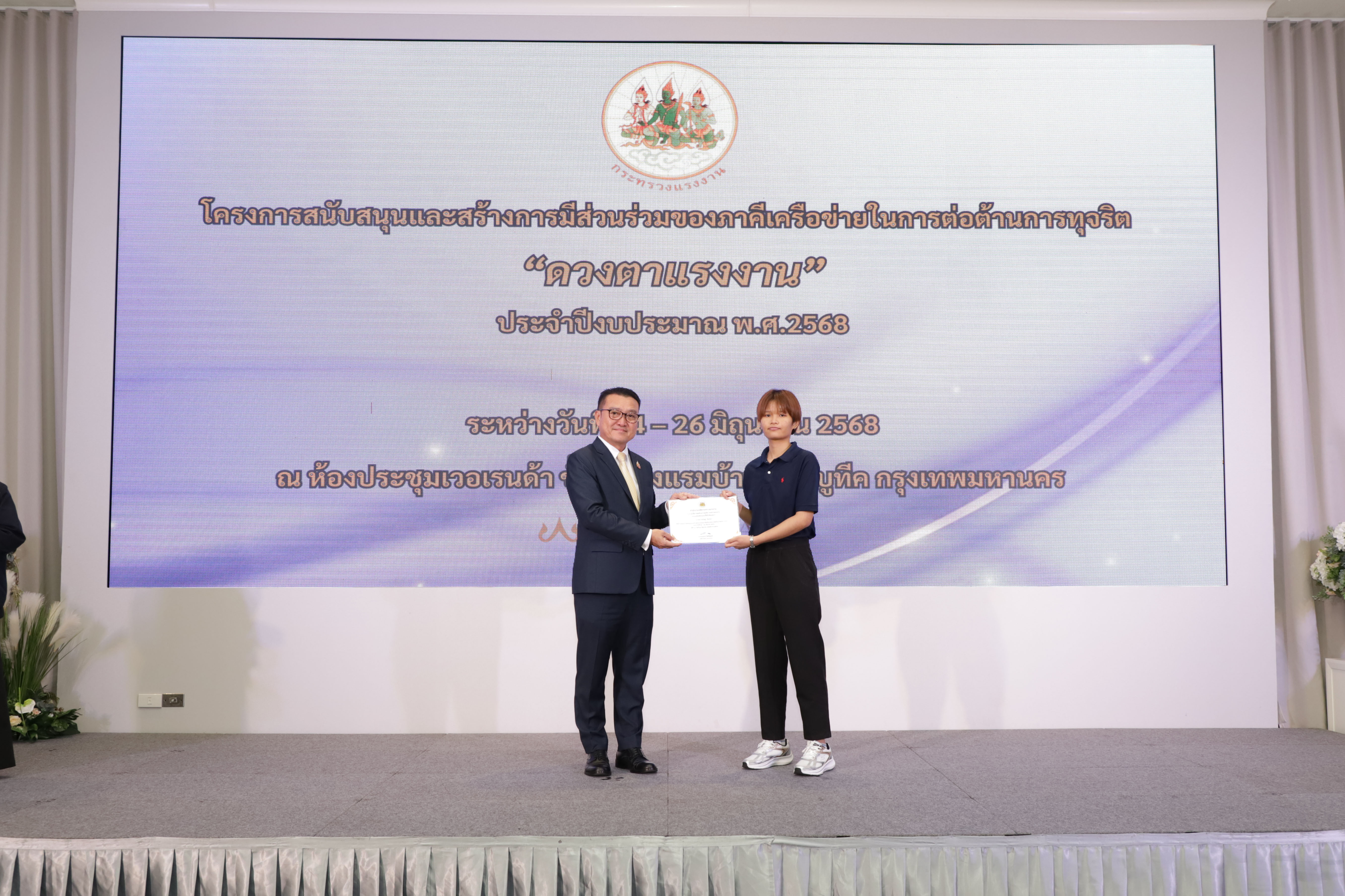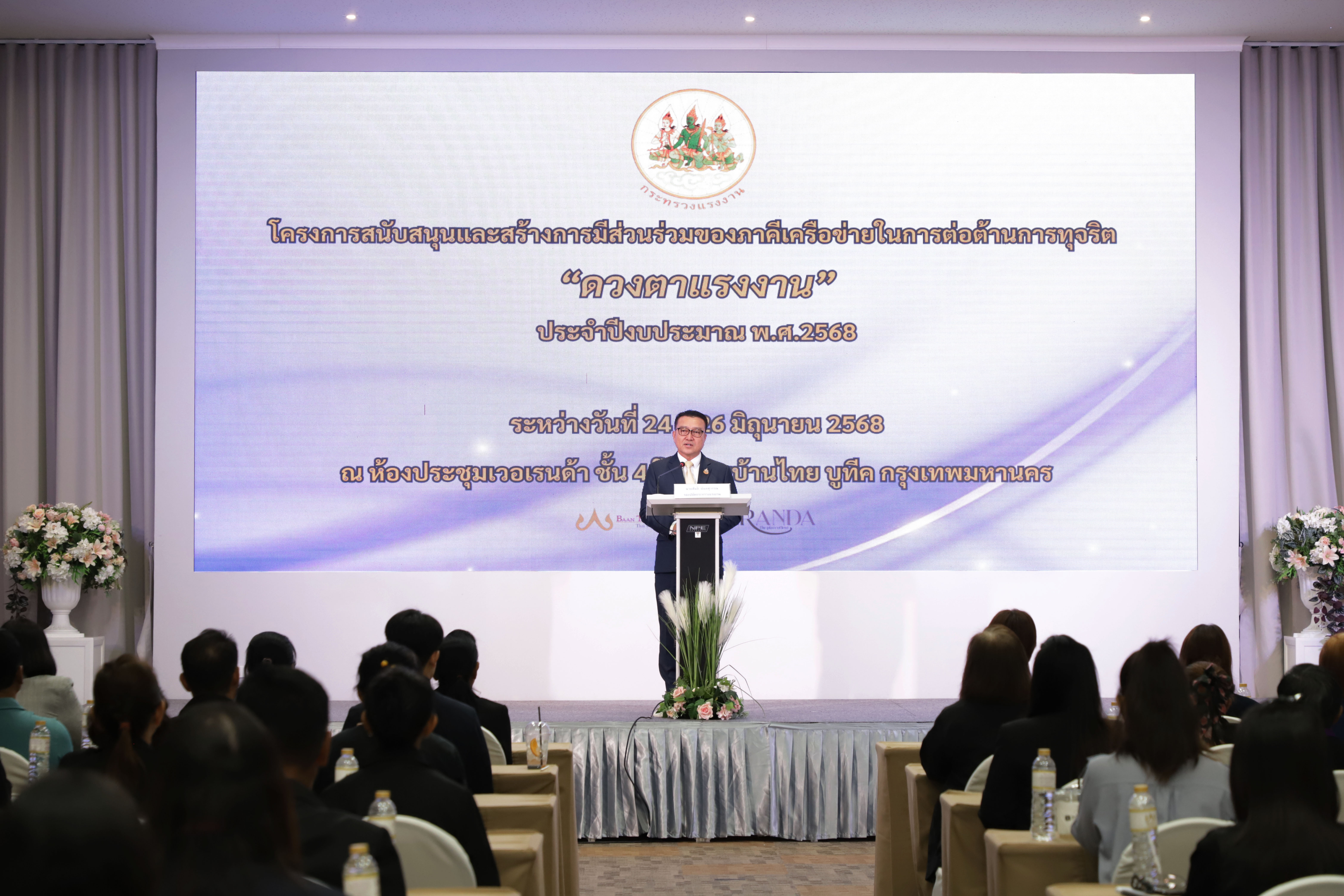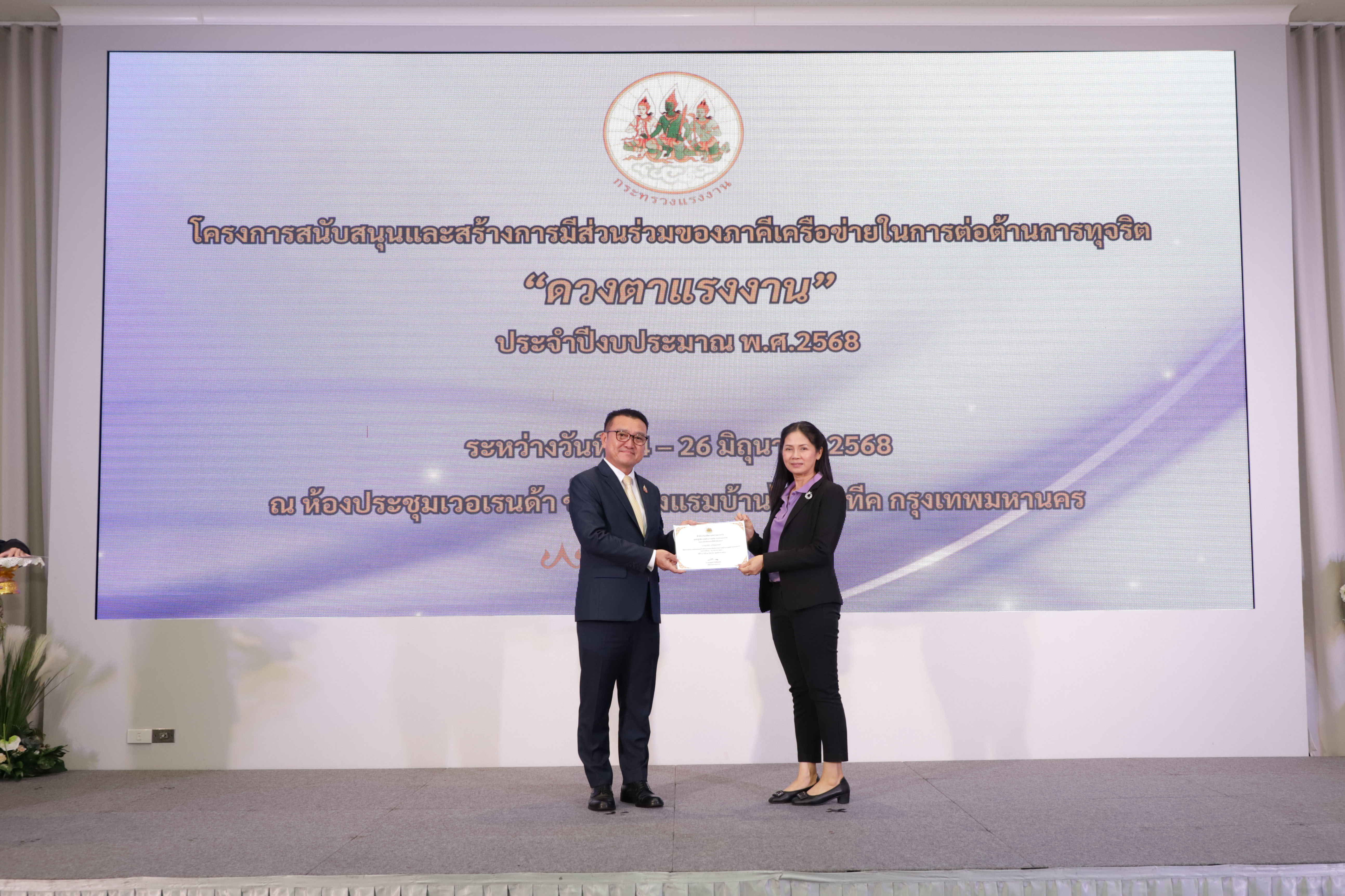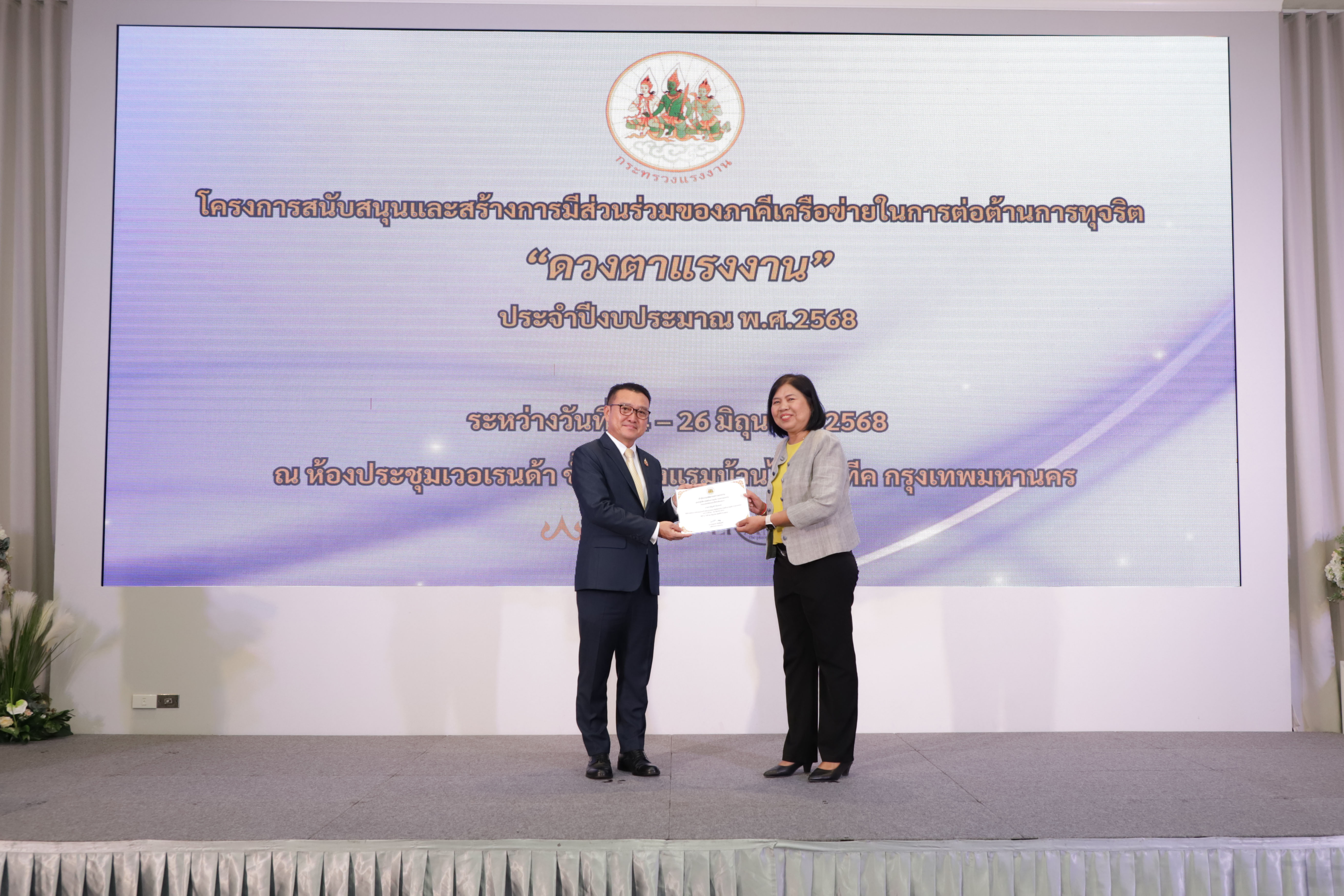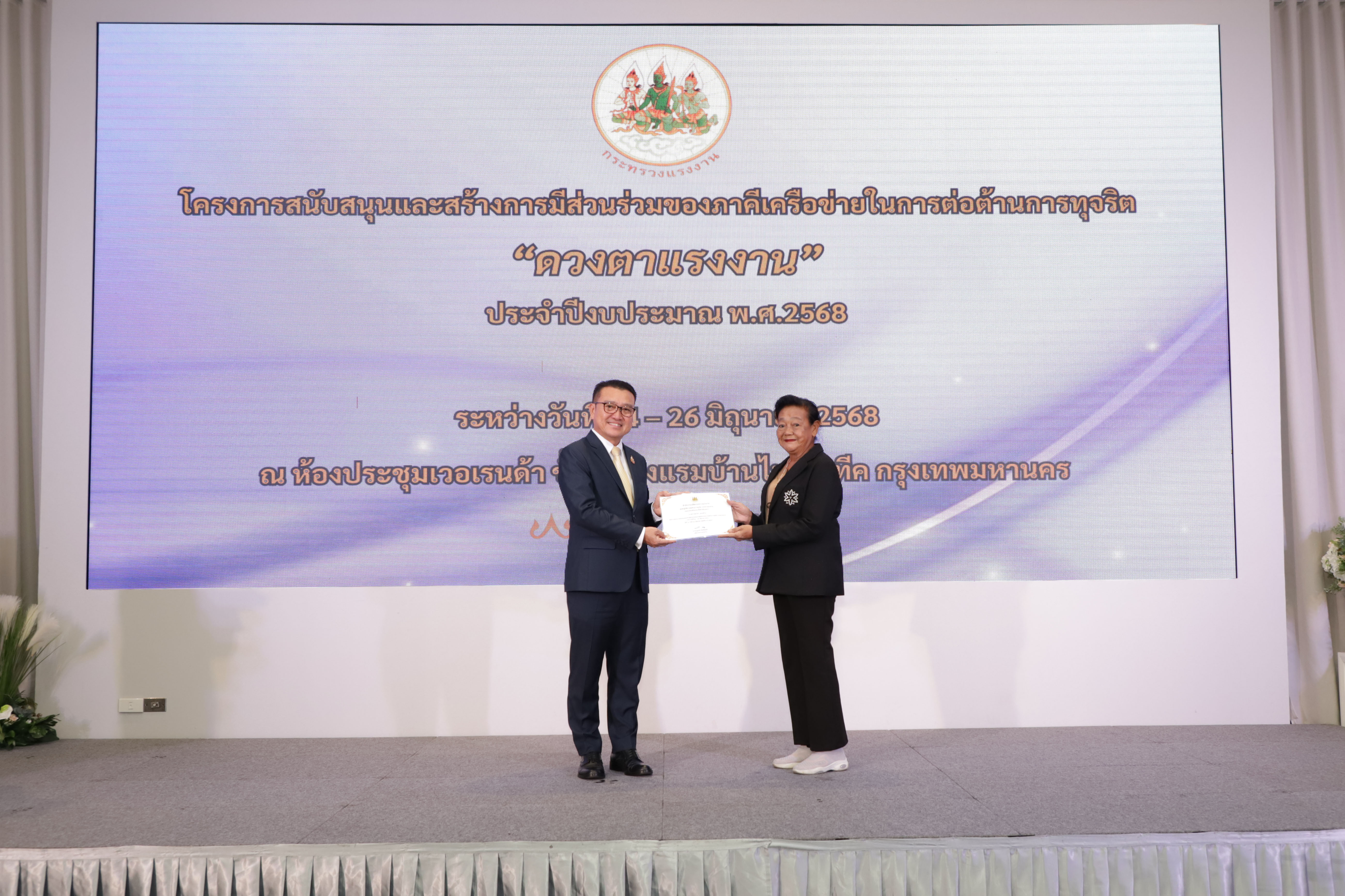 วันที่ 26 มิถุนายน 2568 เวลา 13.30 น. นายบุญสงค์ ทัพชัยยุทธ์ ปลัดกระทรวงแรงงาน มอบหมายให้ นายสันติ นันตสุวรรณ รองปลัดกระทรวงแรงงาน เป็นประธานมอบประกาศนียบัตรและปิดการอบรมโครงการสนับสนุนและสร้างการมีส่วนร่วมของภาคีเครือข่ายในการต่อต้านการทุจริต “ดวงตาแรงงาน” ประจำปีงบประมาณ พ.ศ. 2568 โดยมี นางสาวกรจิรัฏฐ์ พงจันทร์ศธร ผู้ช่วยปลัดกระทรวงแรงงาน ร่วมเป็นเกียรติ ณ โรงแรม บ้านไทย บูทีค กรุงเทพฯ