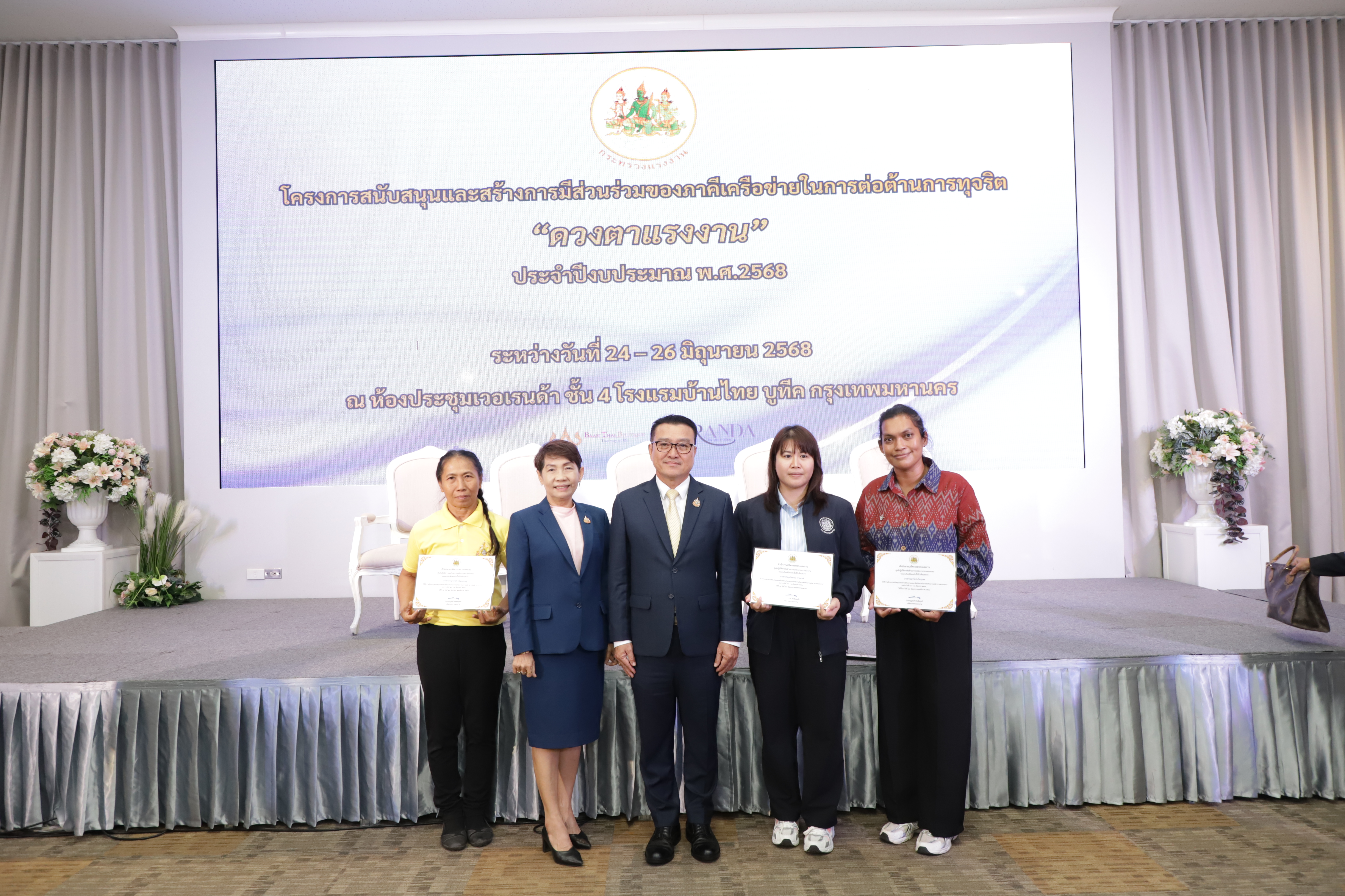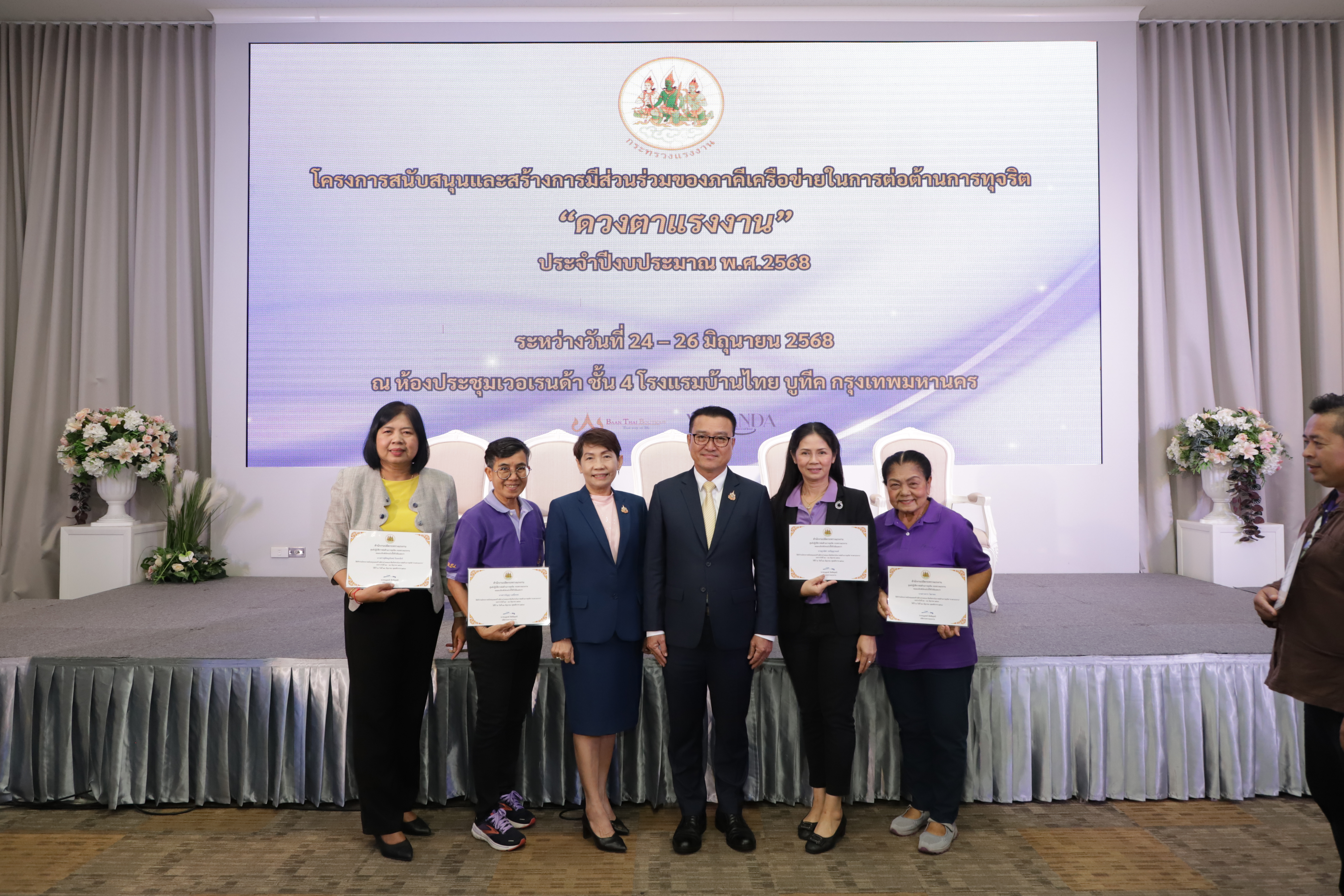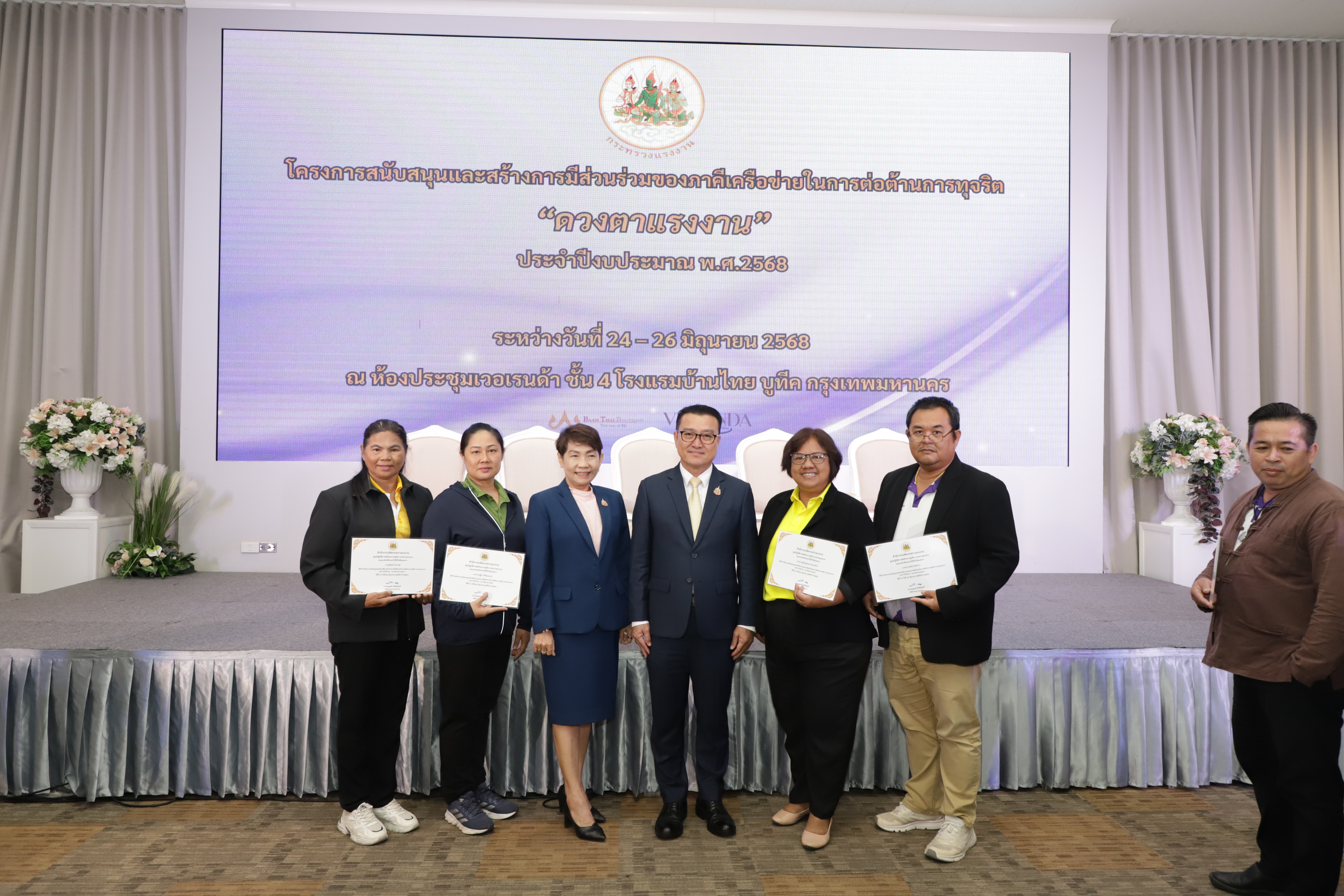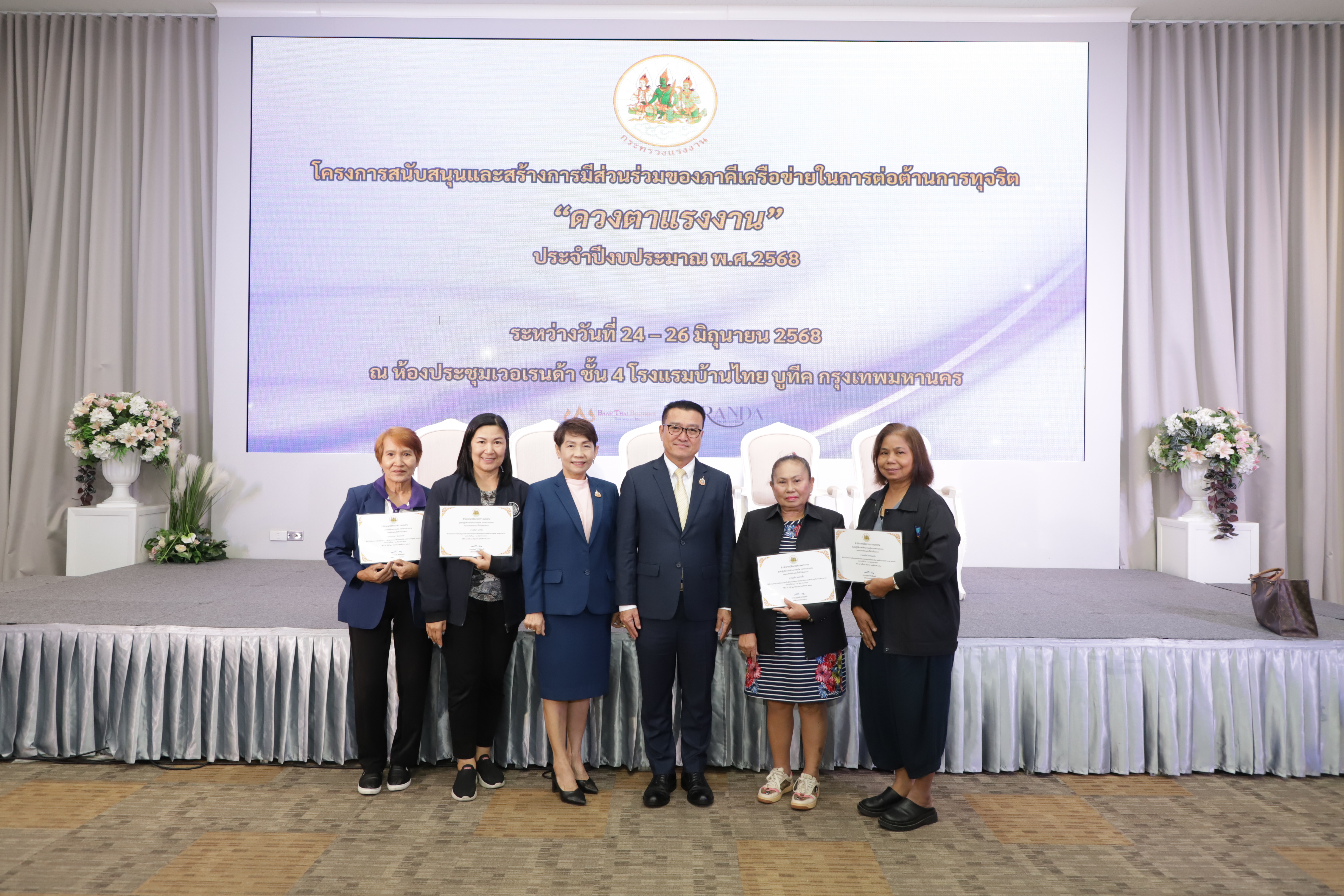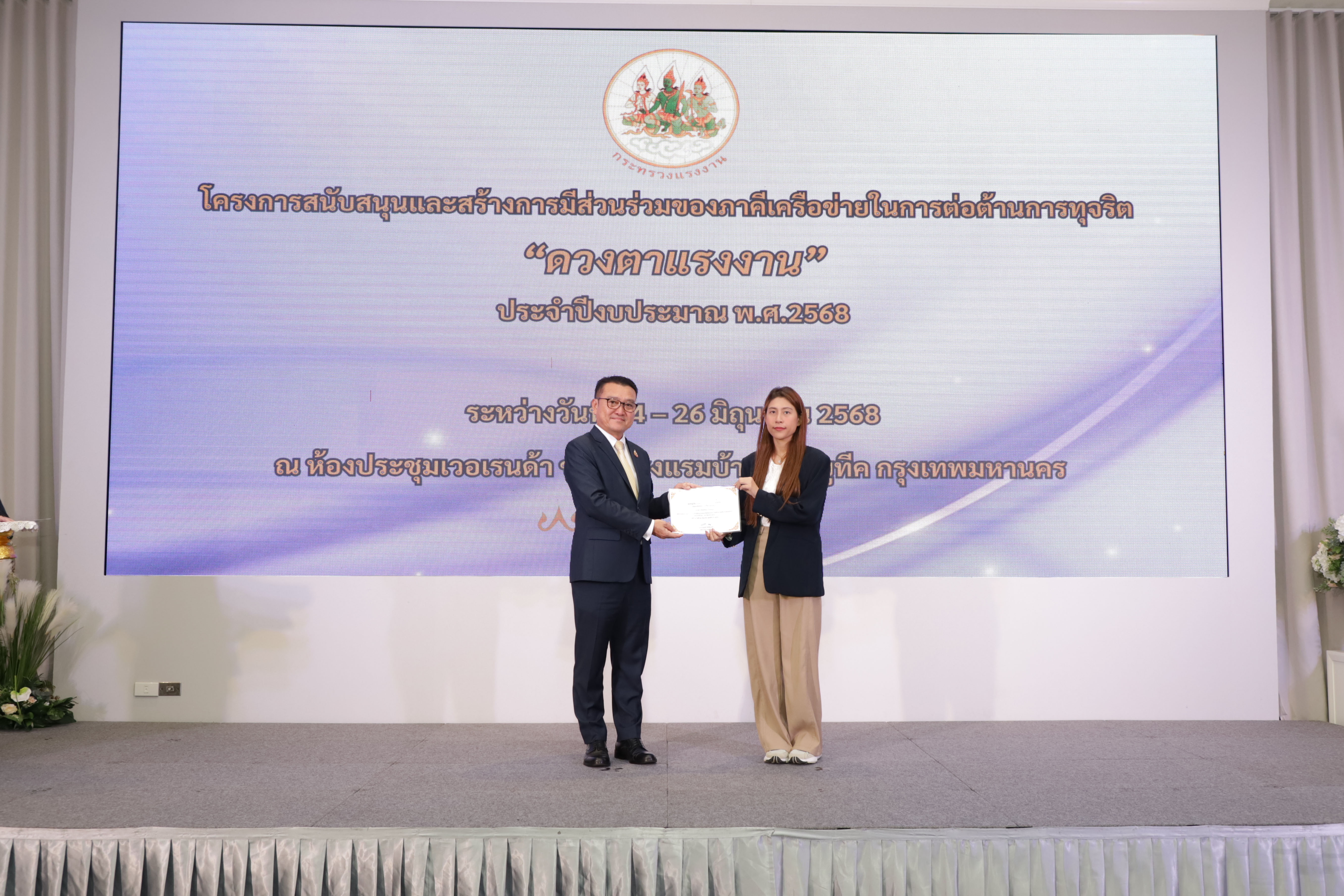 วันที่ 26 มิถุนายน 2568 เวลา 13.30 น. นายบุญสงค์ ทัพชัยยุทธ์ ปลัดกระทรวงแรงงาน มอบหมายให้ นายสันติ นันตสุวรรณ รองปลัดกระทรวงแรงงาน เป็นประธานมอบประกาศนียบัตรและปิดการอบรมโครงการสนับสนุนและสร้างการมีส่วนร่วมของภาคีเครือข่ายในการต่อต้านการทุจริต “ดวงตาแรงงาน” ประจำปีงบประมาณ พ.ศ. 2568 โดยมี นางสาวกรจิรัฏฐ์ พงจันทร์ศธร ผู้ช่วยปลัดกระทรวงแรงงาน ร่วมเป็นเกียรติ ณ โรงแรม บ้านไทย บูทีค กรุงเทพฯ