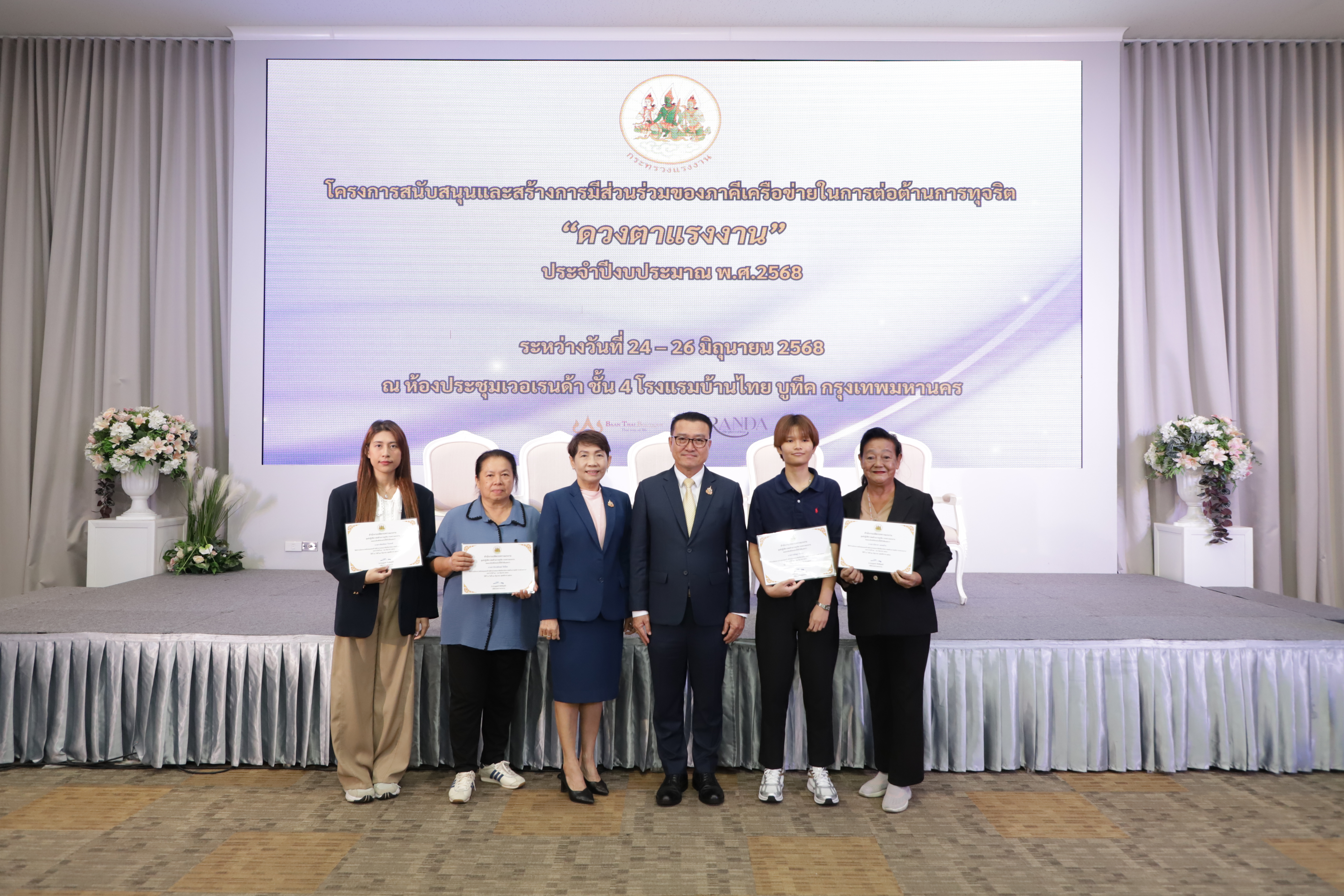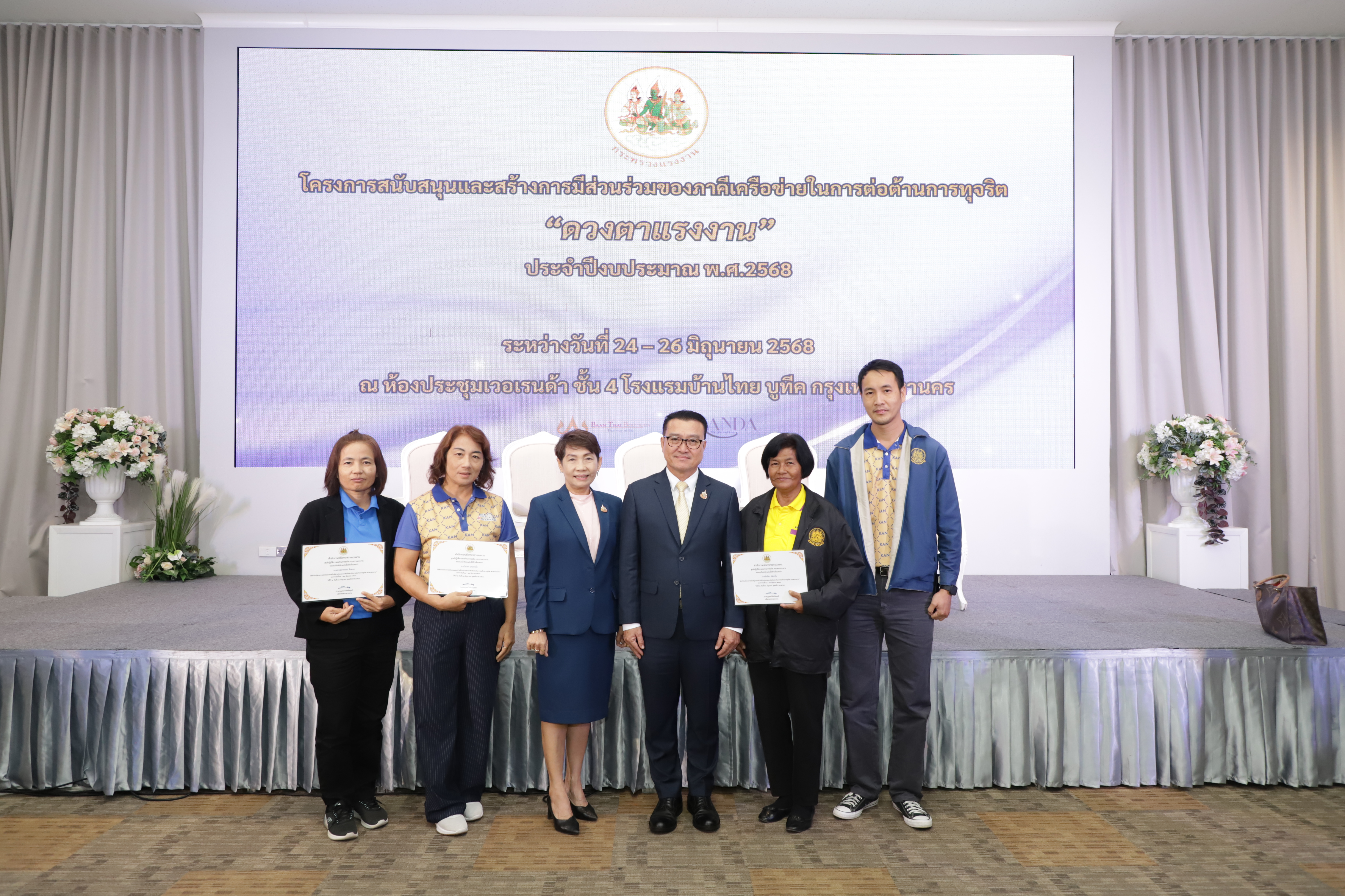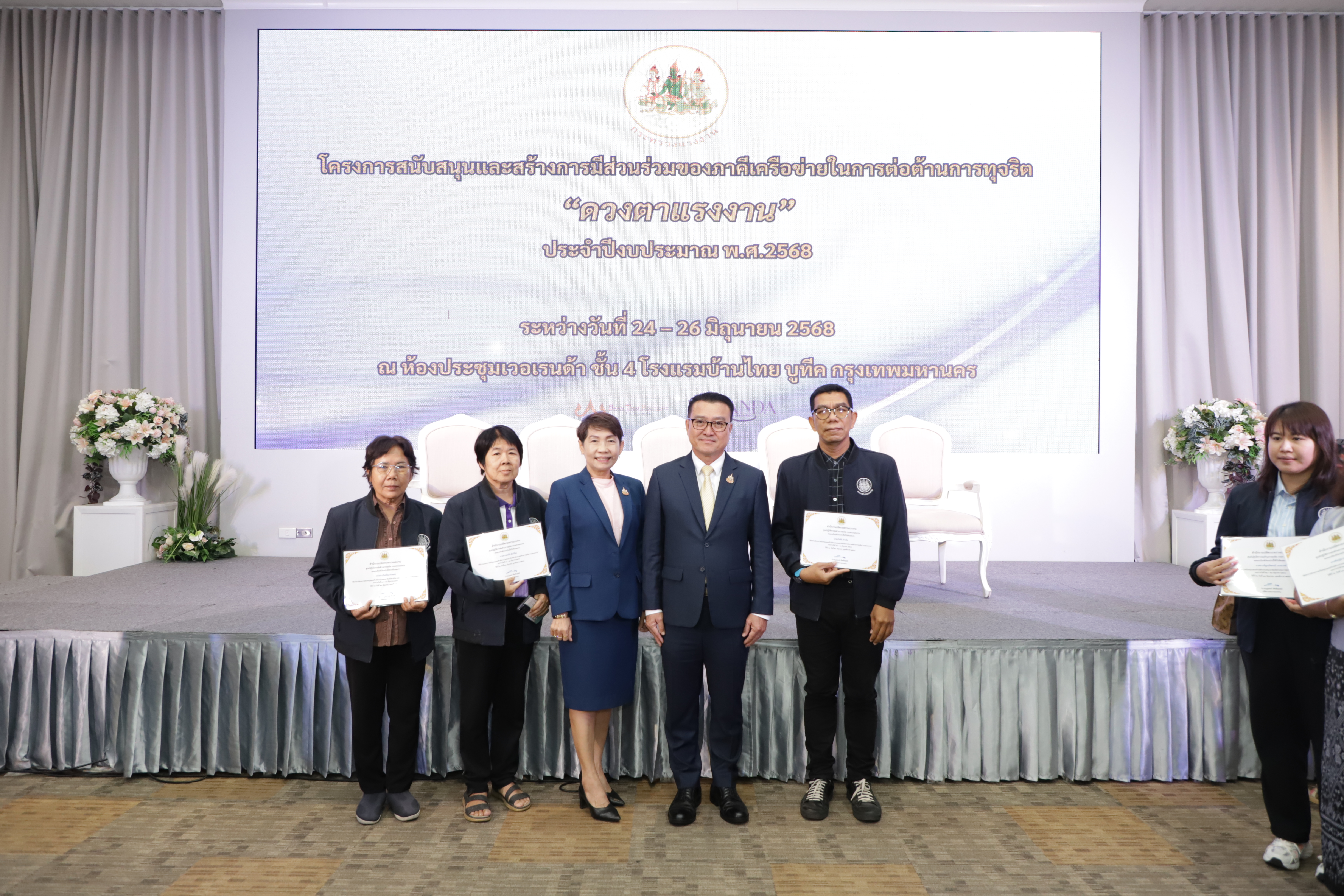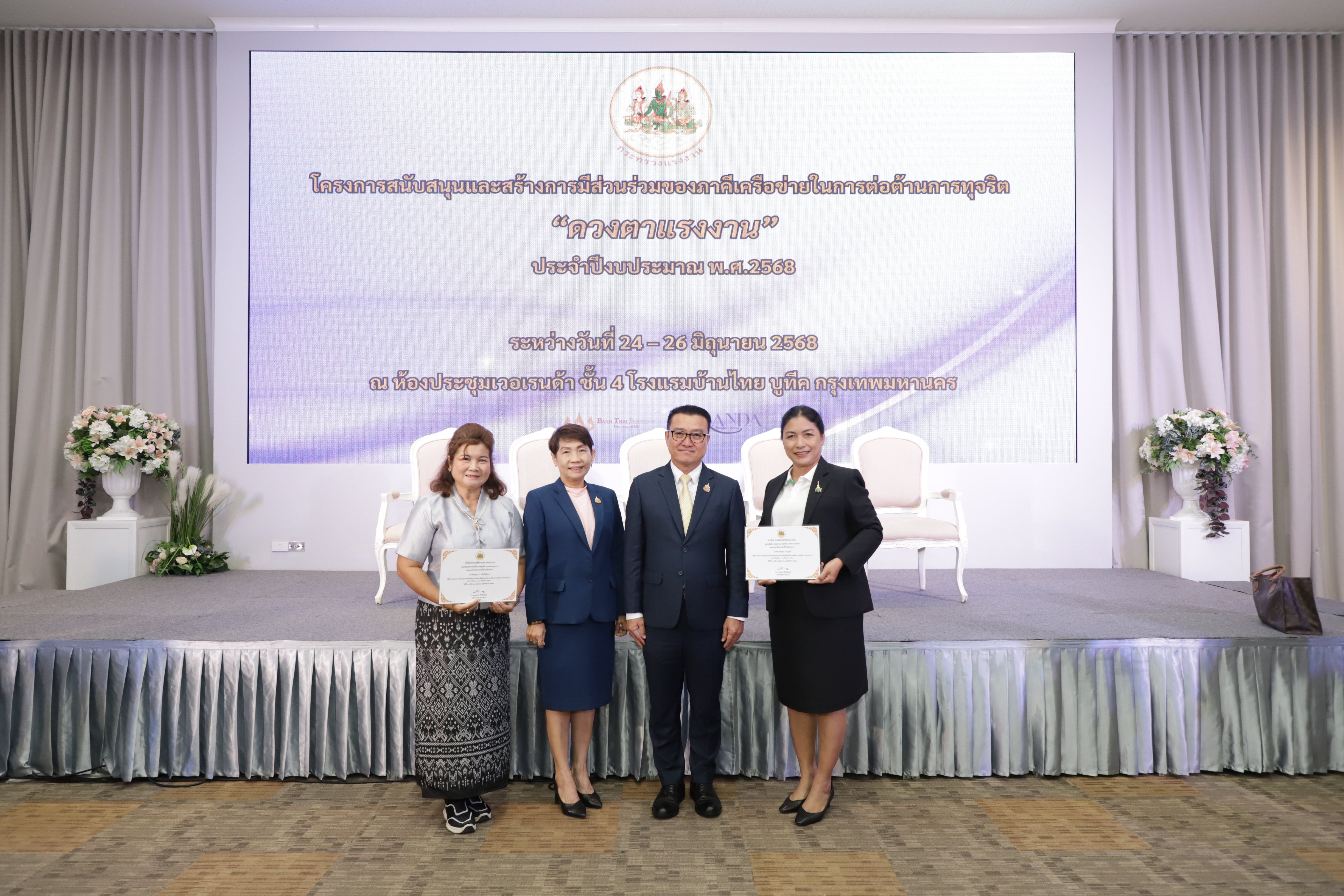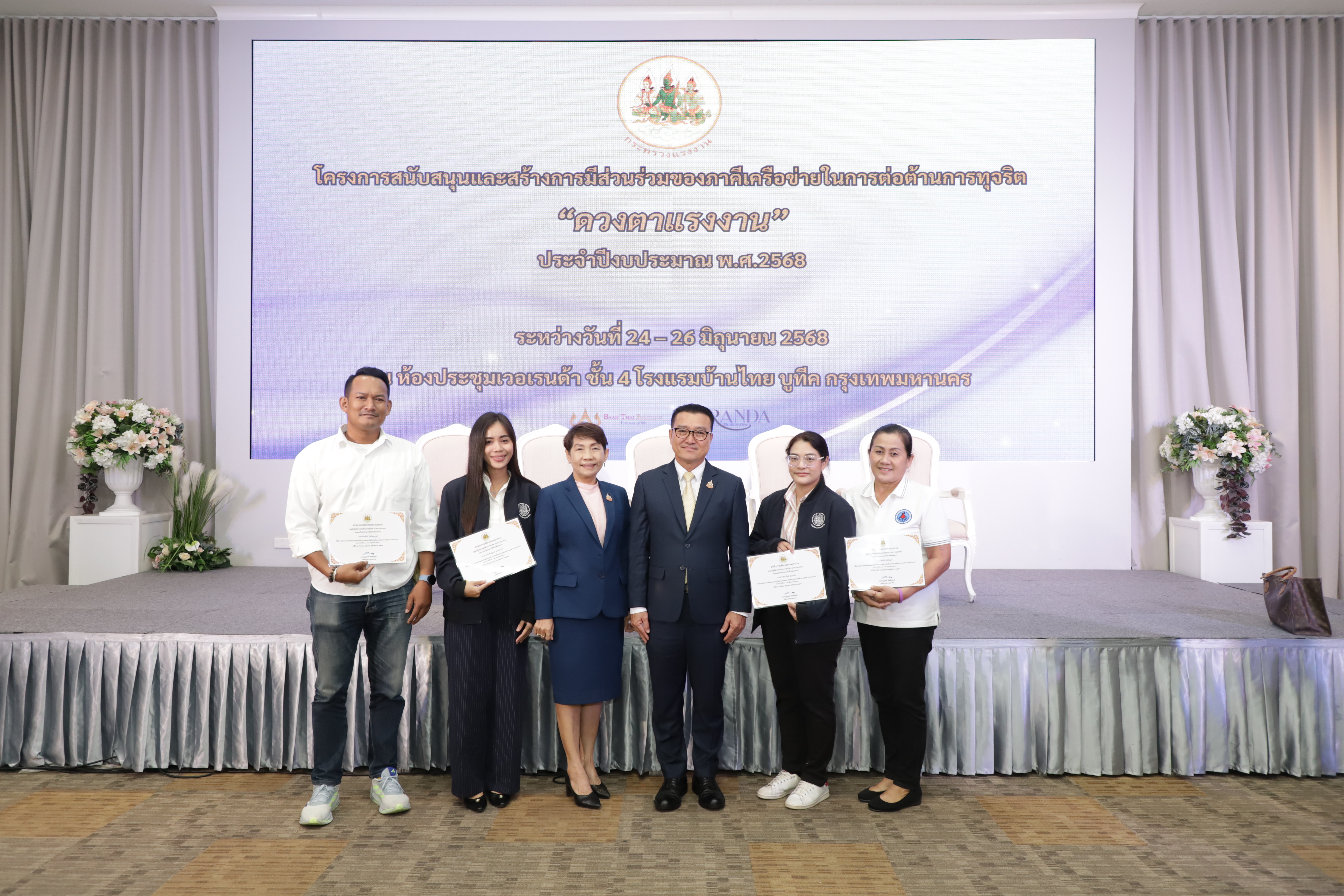 วันที่ 26 มิถุนายน 2568 เวลา 13.30 น. นายบุญสงค์ ทัพชัยยุทธ์ ปลัดกระทรวงแรงงาน มอบหมายให้ นายสันติ นันตสุวรรณ รองปลัดกระทรวงแรงงาน เป็นประธานมอบประกาศนียบัตรและปิดการอบรมโครงการสนับสนุนและสร้างการมีส่วนร่วมของภาคีเครือข่ายในการต่อต้านการทุจริต “ดวงตาแรงงาน” ประจำปีงบประมาณ พ.ศ. 2568 โดยมี นางสาวกรจิรัฏฐ์ พงจันทร์ศธร ผู้ช่วยปลัดกระทรวงแรงงาน ร่วมเป็นเกียรติ ณ โรงแรม บ้านไทย บูทีค กรุงเทพฯ