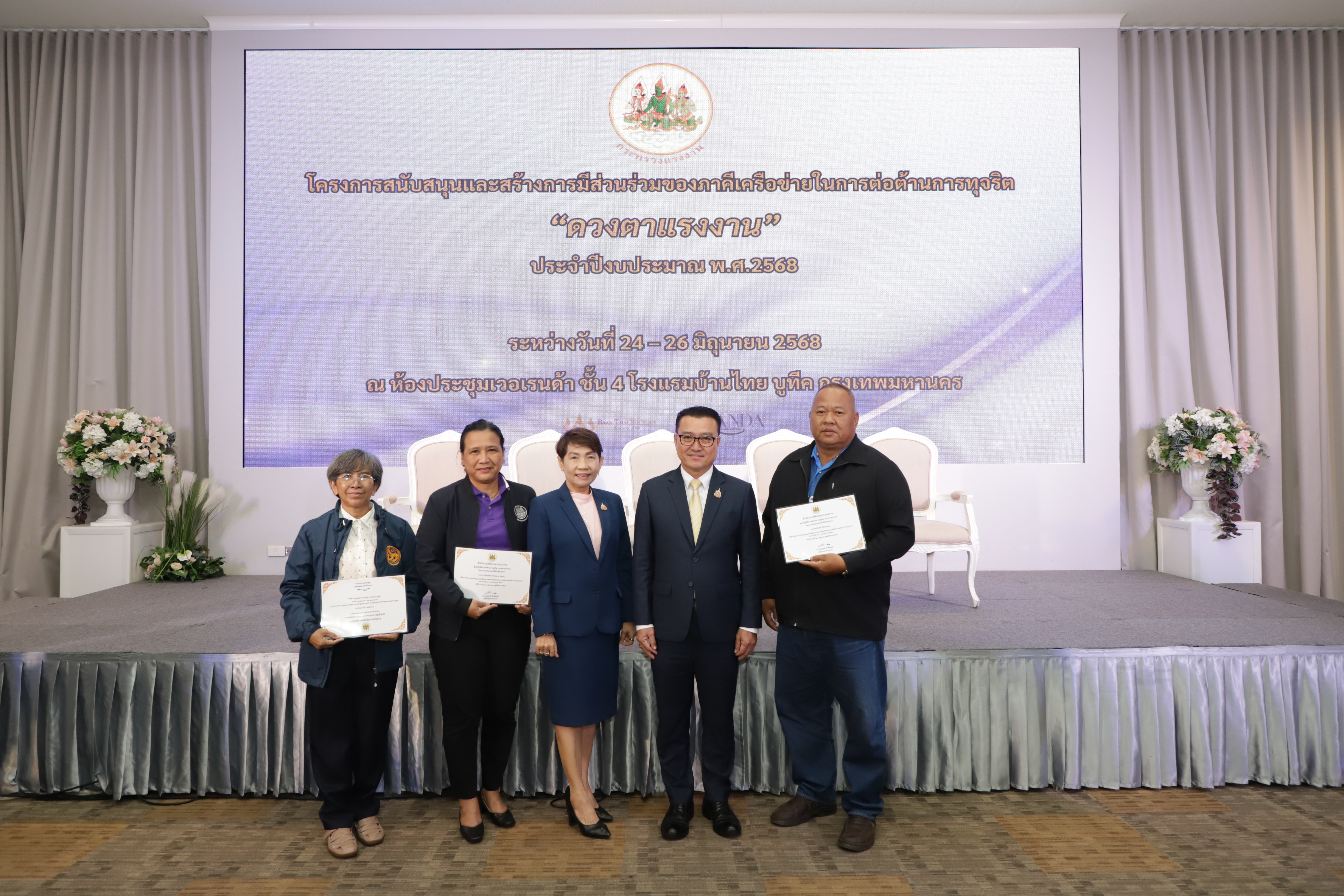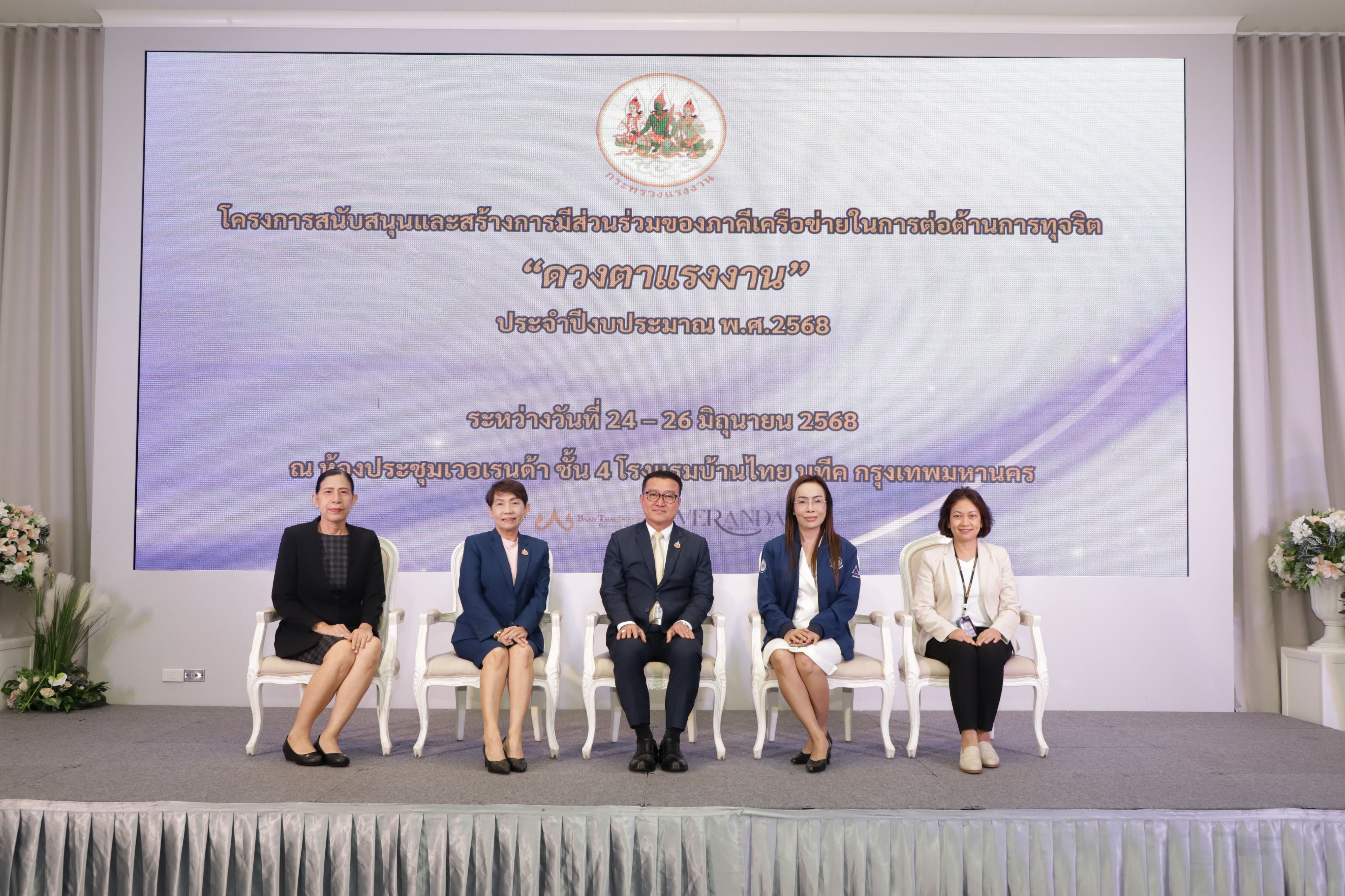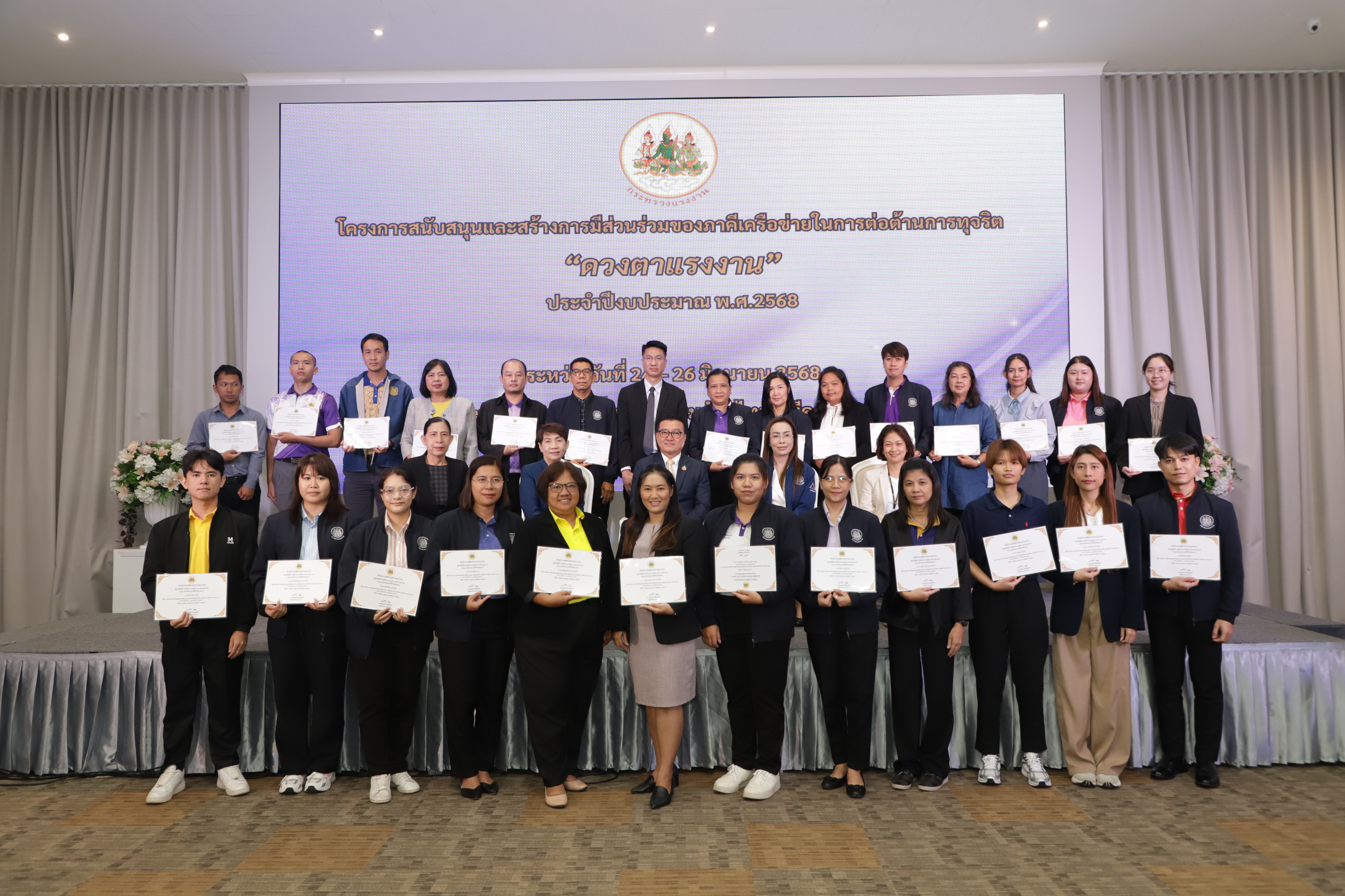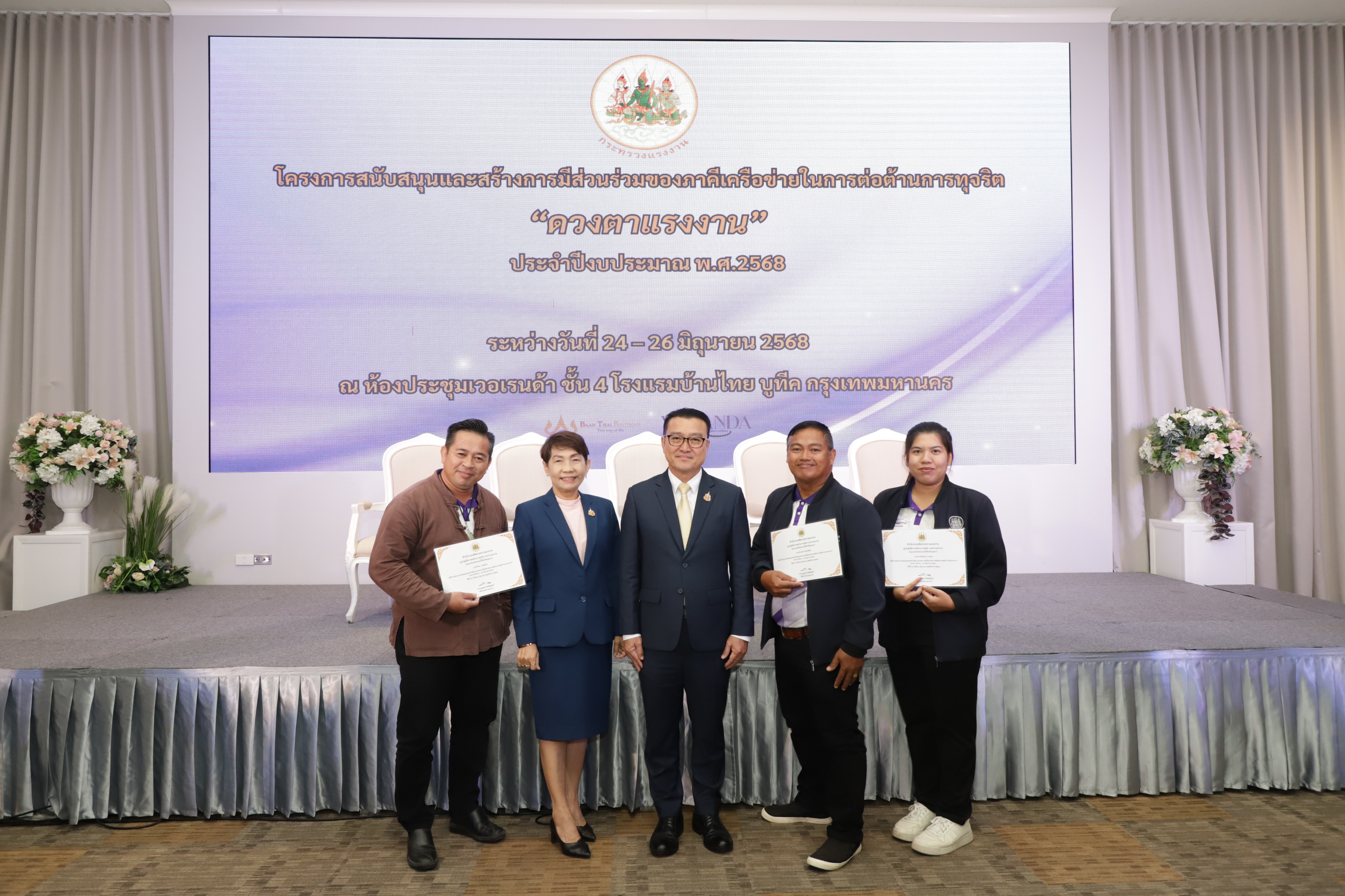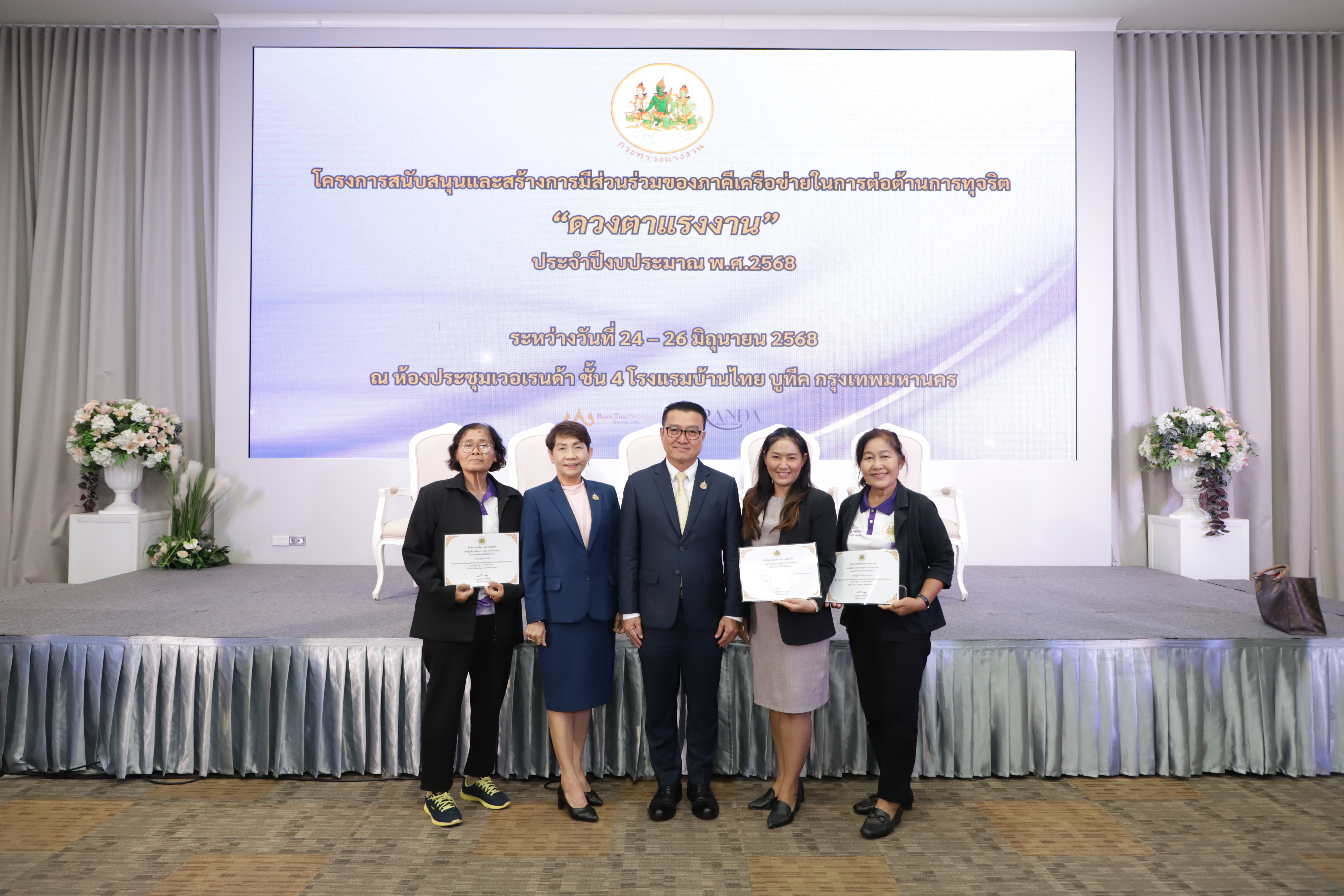 วันที่ 26 มิถุนายน 2568 เวลา 13.30 น. นายบุญสงค์ ทัพชัยยุทธ์ ปลัดกระทรวงแรงงาน มอบหมายให้ นายสันติ นันตสุวรรณ รองปลัดกระทรวงแรงงาน เป็นประธานมอบประกาศนียบัตรและปิดการอบรมโครงการสนับสนุนและสร้างการมีส่วนร่วมของภาคีเครือข่ายในการต่อต้านการทุจริต “ดวงตาแรงงาน” ประจำปีงบประมาณ พ.ศ. 2568 โดยมี นางสาวกรจิรัฏฐ์ พงจันทร์ศธร ผู้ช่วยปลัดกระทรวงแรงงาน ร่วมเป็นเกียรติ ณ โรงแรม บ้านไทย บูทีค กรุงเทพฯ