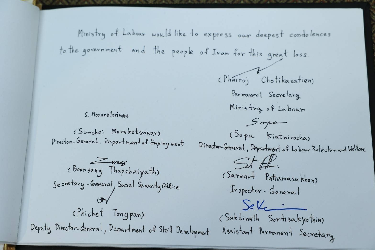 วันที่ 24 พฤษภาคม 2567 เวลา 10.00 น. นายไพโรจน์ โชติกเสถียร ปลัดกระทรวงแรงงาน ร่วมลงนามในสมุดแสดงความเสียใจต่อการถึงแก่อสัญกรรมของนายซัยยิด อิบรอฮีม เราะอีซี ประธานาธิบดีแห่งสาธารณรัฐอิสลามอิหร่าน (His Excellency Dr.Seyyed Ebrahim Raisi) โดยมี นายพิพัฒน์ รัชกิจประการ รัฐมนตรีว่าการกระทรวงแรงงาน เป็นผู้นำคณะ และนายสมาสภ์ ปัทมะสุคนธ์ ผู้ตรวจราชการกระทรวงแรงงาน นายศักดินาถ สนธิศักดิ์โยธิน ผู้ช่วยปลัดกระทรวงแรงงาน ร่วมลงนามด้วย ณ สถานเอกอัครราชทูตสาธารณรัฐอิสลามอิหร่านประจำประเทศไทย ถนนสุขุมวิท เขตวัฒนา กรุงเทพมหานคร