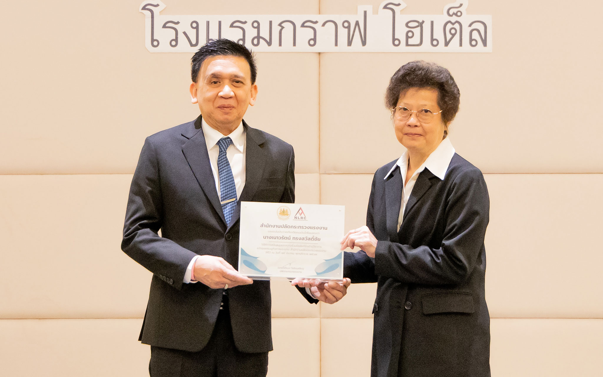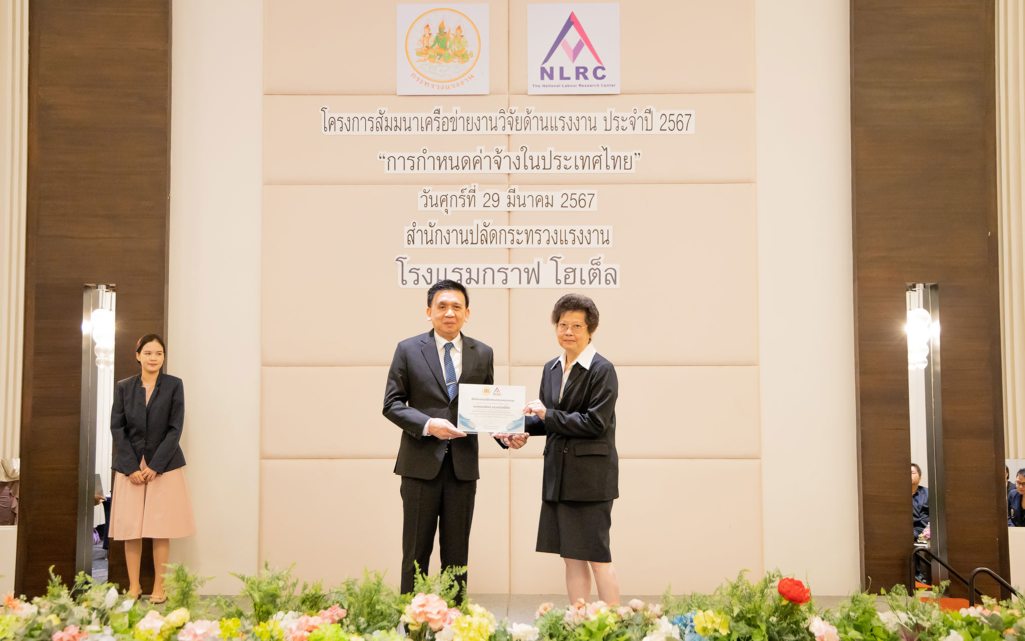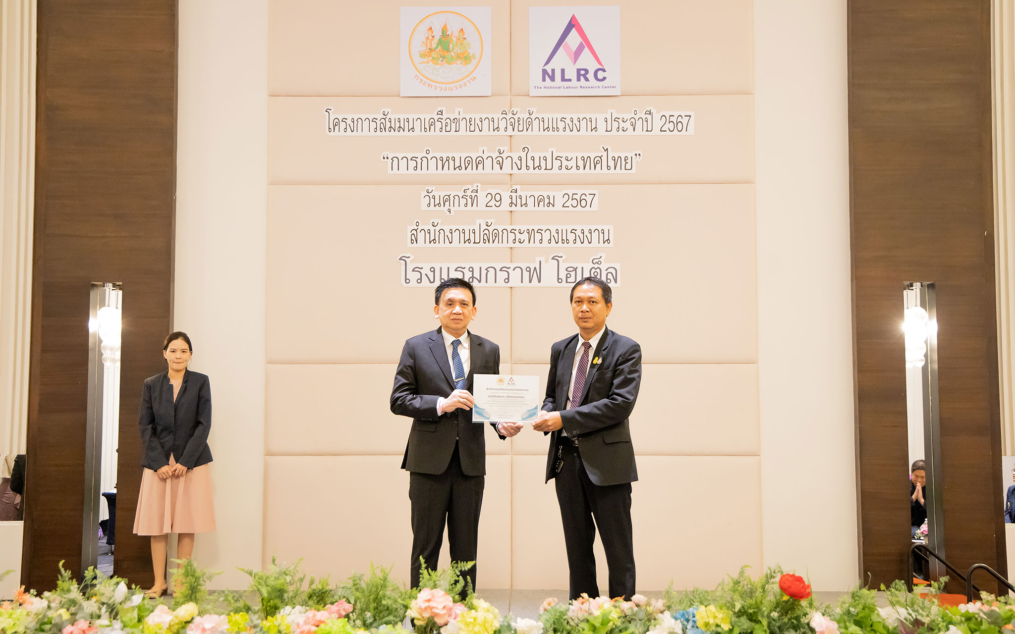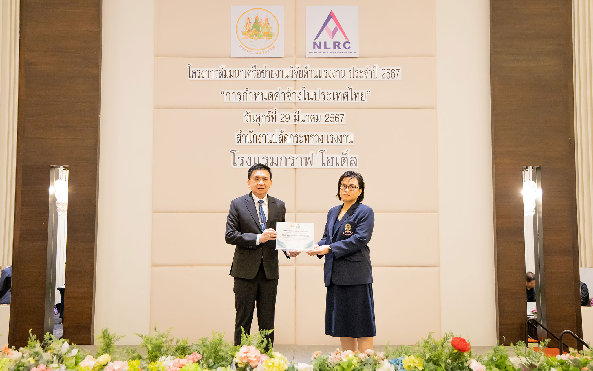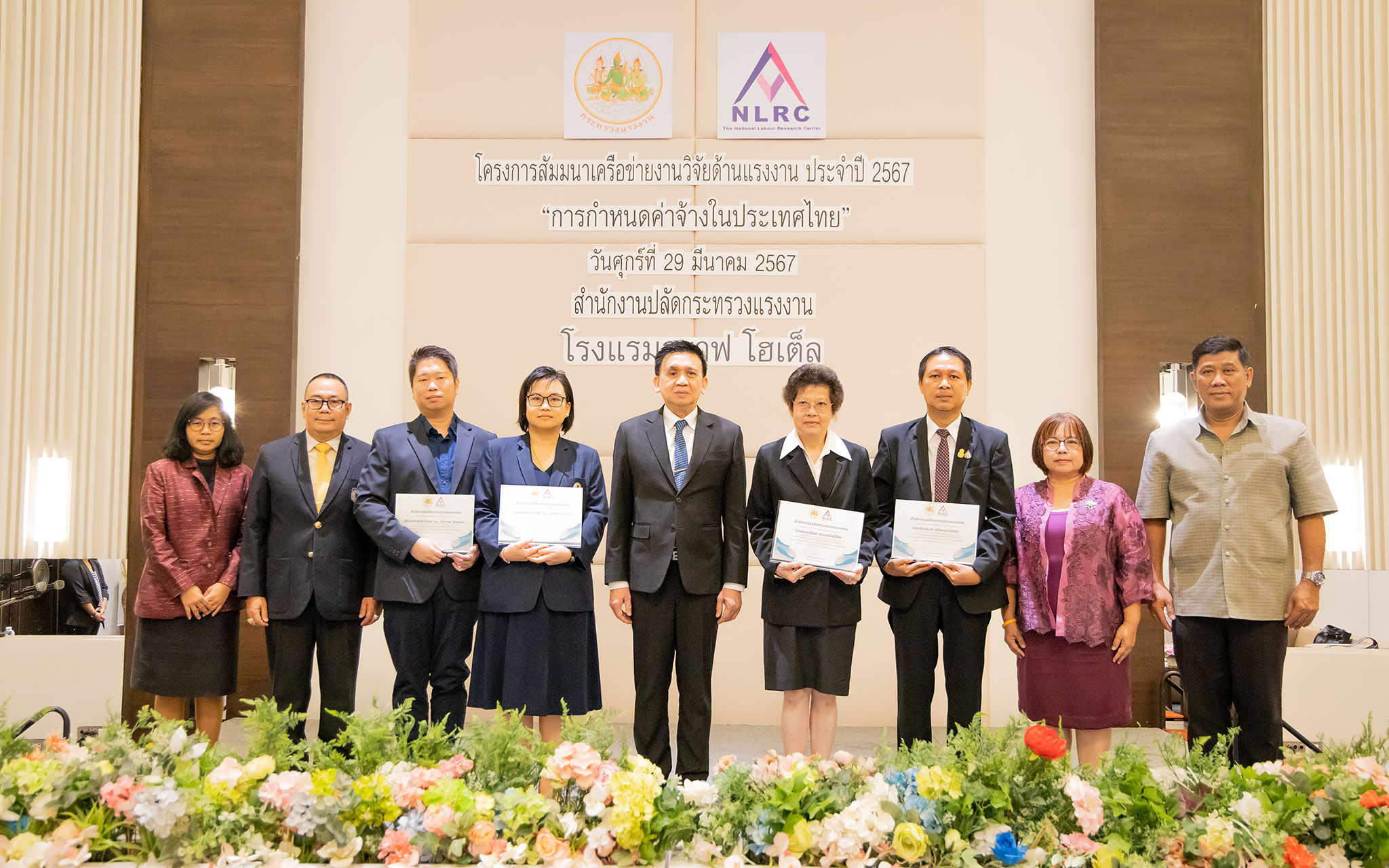 On March 29, 2024, at 08.30 hours, the Permanent Secretary of Labour, Mr. Pairoj Chotikasathien, chaired the opening of the 2024 Labour Research Network Seminar Project on “Wage Setting in Thailand” at the Grand Room 2, 2nd floor, Building 2, Graf Hotel Bangkok, and online via Zoom. He also presented certificates of honour to four people who have supported and provided academic cooperation to the Labour Economics Division: 1. Ms. Naowarat Songsawatchai, Vice President and Deputy Director of Administration and Finance, Oriental Garment Co., Ltd. 2. Mr. Kampanat Sripanomwan, Quality Inspection Officer, Hitachi Astemo Korat Brake Systems Co., Ltd. 3. Assistant Professor Dr. Thirapap Fakthak, Faculty of Economics Thammasat University, and 4. Associate Professor Dr. Rattiya Phulao, Deputy Dean of the College of Population Studies, Chulalongkorn University.