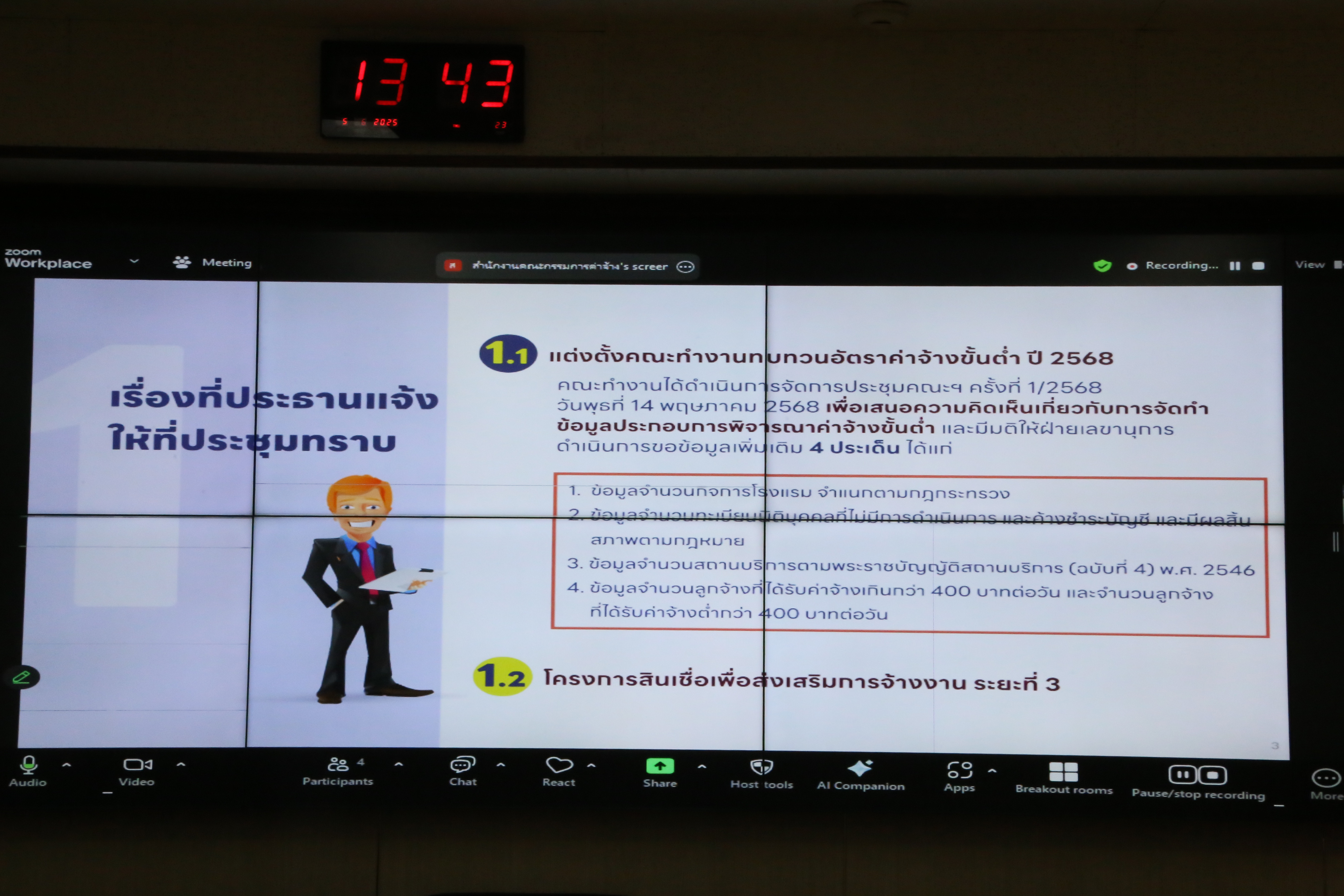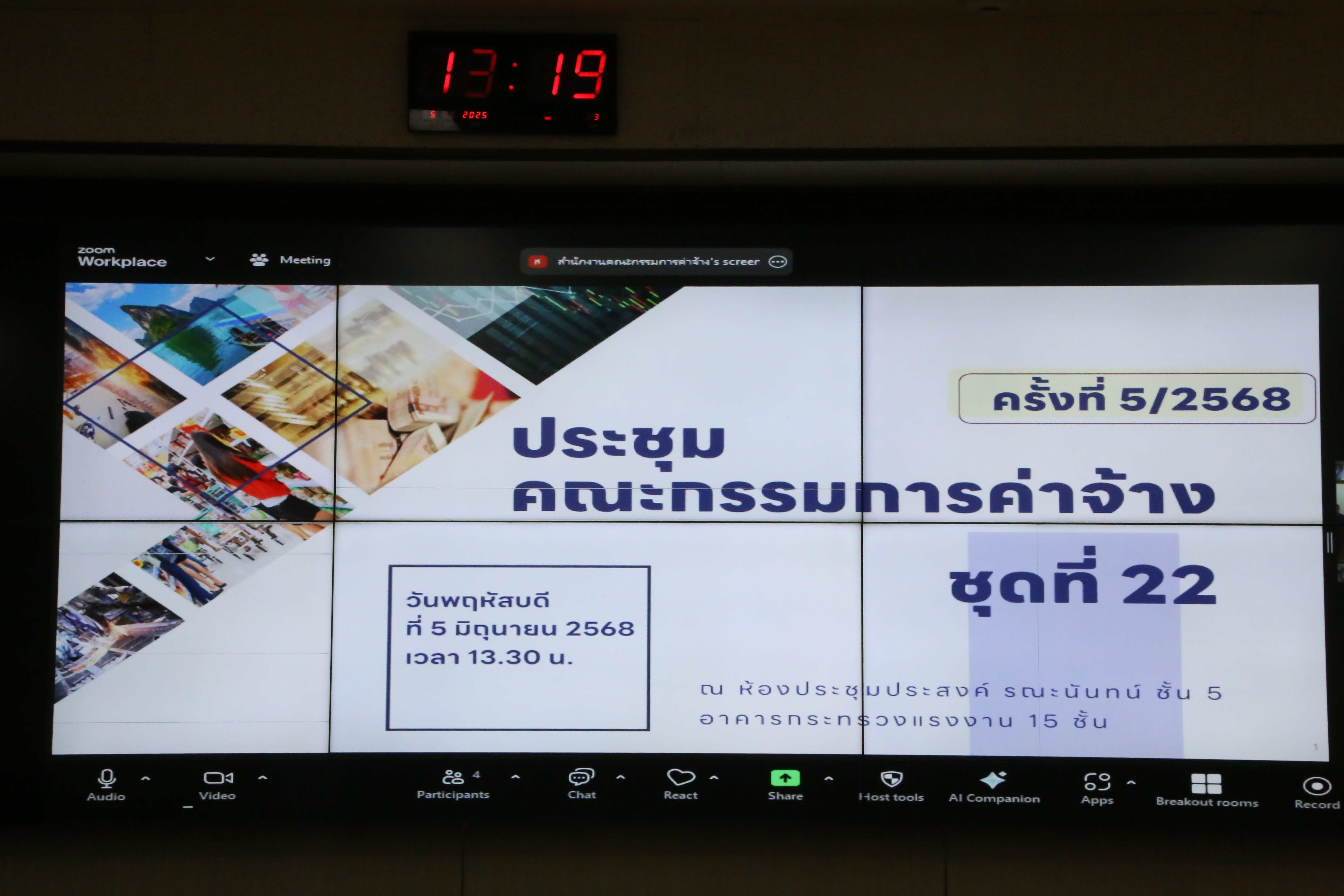 วันที่ 5 มิถุนายน 2568 เวลา 13.30 น. นายบุญสงค์ ทัพชัยยุทธ์ ปลัดกระทรวงแรงงาน เป็นประธานการประชุมคณะกรรมการค่าจ้าง ชุดที่ 22 ครั้งที่ 5/2568 โดยมี นายสันติ นันตสุวรรณ รองปลัดกระทรวงแรงงาน นายณัฐวุฒิ ภัทรประยูร จัดหางานจังหวัดร้อยเอ็ด รักษาการในตำแหน่งที่ปรึกษาวิชาการแรงงาน ผู้แทนฝ่ายลูกจ้าง ผู้แทนฝ่ายรัฐบาล และเจ้าหน้าที่ที่เกี่ยวข้องเข้าร่วมประชุม ณ ห้องประชุมประสงค์ รณะนันท์ ชั้น 5 อาคารกระทรวงแรงงาน