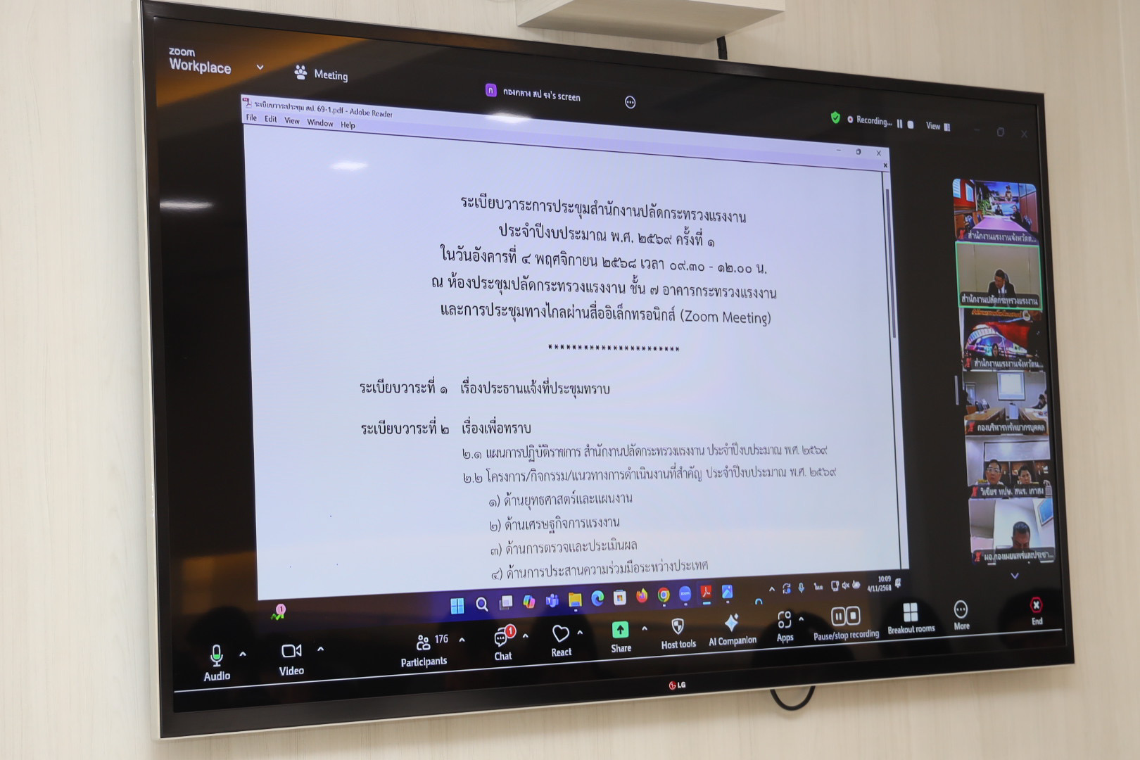สำหรับการประชุมดังกล่าว ที่ประชุมได้แจ้งเรื่องเพื่อทราบ ในประเด็นแผนการปฏิบัติราชการ สำนักงานปลัดกระทรวงแรงงาน ประจำปีงบประมาณ พ.ศ. 2569 และแผนงาน โครงการ กิจกรรม แนวทางการดำเนินงานที่สำคัญ ประจำปีงบประมาณ พ.ศ. 2569 ด้าน 1) ด้านยุทธศาสตร์และแผนงาน 2) ด้านเศรษฐกิจการแรงงาน 3) ด้านการตรวจและประเมินผล 4) ด้านการประสานความร่วมมือระหว่างประเทศ 5) ด้านแรงงานนอกระบบ 6) ด้านการป้องกันการค้ามนุษย์ด้านแรงงาน และ 7) ด้านเทคโนโลยีสารสนเทศและการสื่อสาร โดย ปลัดกระทรวงแรงงานได้มอบนโยบายให้ หน่วยงานในสังกัดสำนักงานปลัดกระทรวงแรงงานสะท้อนการดำเนินงานต่างๆ ปัญหาอุปสรรคในการดำเนินงาน แนวทางการแก้ไข ทั้งนี้ เพื่อให้สามารถสื่อสารสร้างการรับรู้ในมิติเดียวกัน สามารถนำข้อมูลมากำหนดทิศทางในเชิงยุทธศาสตร์ เพื่อให้สอดคล้องกับนโยบายของกระทรวงแรงงานในการบริหารจัดการแรงงานของประเทศต่อไปได้