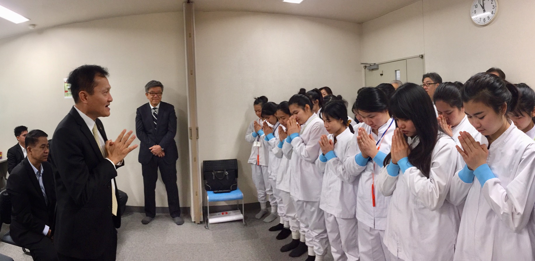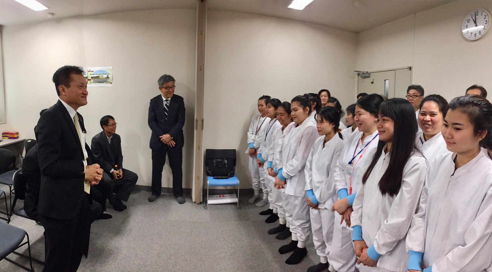 ปลัดกระทรวงแรงงาน ได้ให้โอวาท พบปะ พูดคุยรวมทั้งเชิญชวนและพร้อมสนับสนุนผู้ฝึกงาน กรณีที่ทำงานในญี่ปุ่นครบ 3 ปี และเดินทางกลับประเทศไทยแล้ว ว่าสามารถกลับเข้ามาทำงานในญี่ปุ่นในสถานะ” แรงงานที่มีทักษะเฉพาะ” ซึ่งเป็นวีซ่ารูปแบบใหม่ โดยหากเข้าไปทำงานในสาขาเดิมจะไม่ต้องผ่านการทดสอบภาษาและทักษะ นอกจากนี้และมอบอาหารแห้งจากประเทศไทยเพื่อสร้างขวัญและกำลังใจแก่ผู้ฝึกงานด้วย