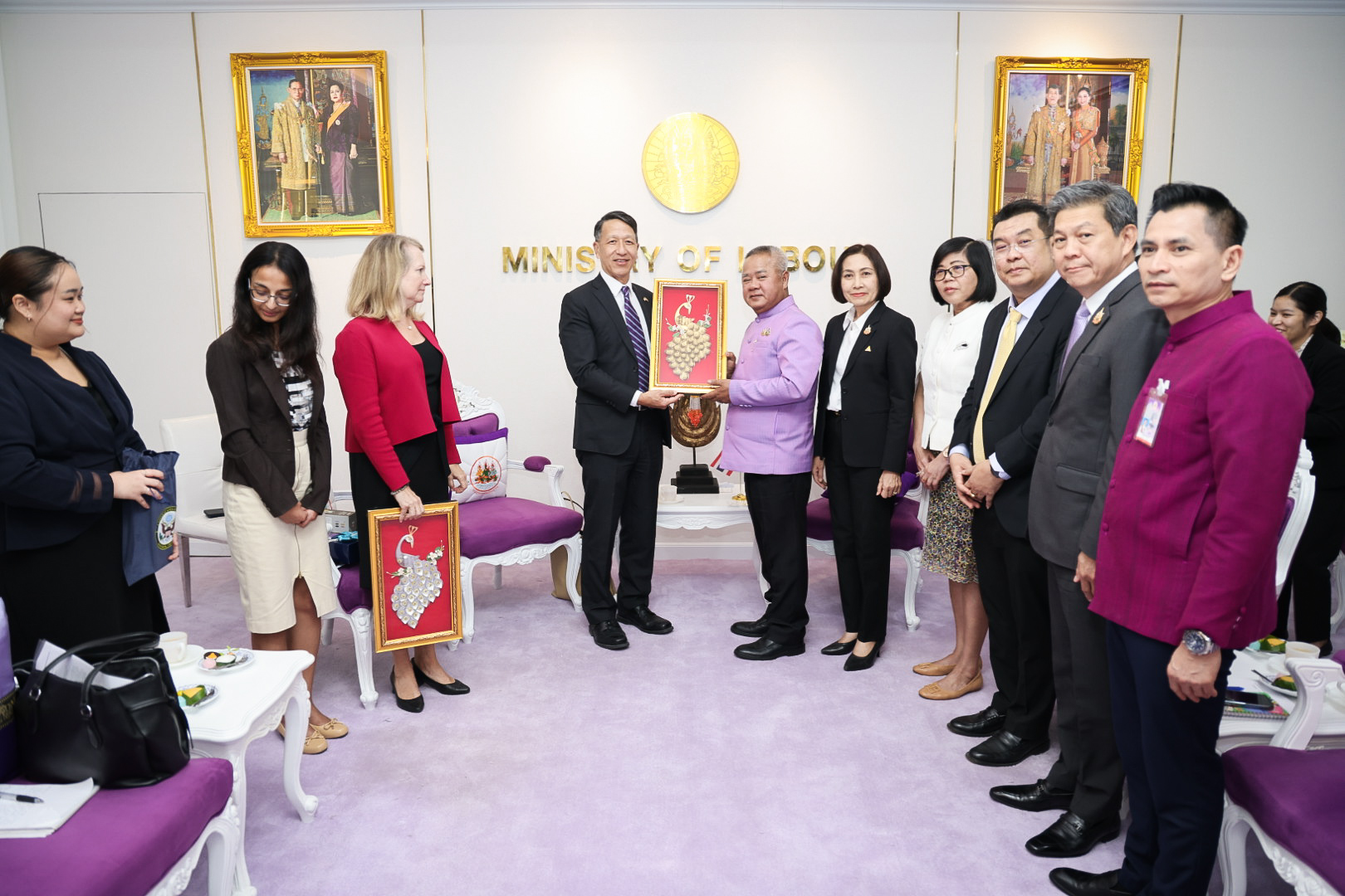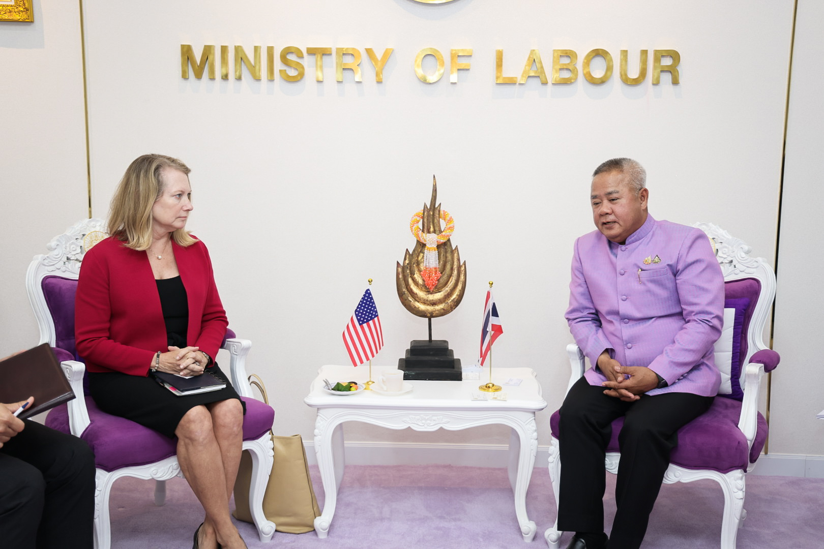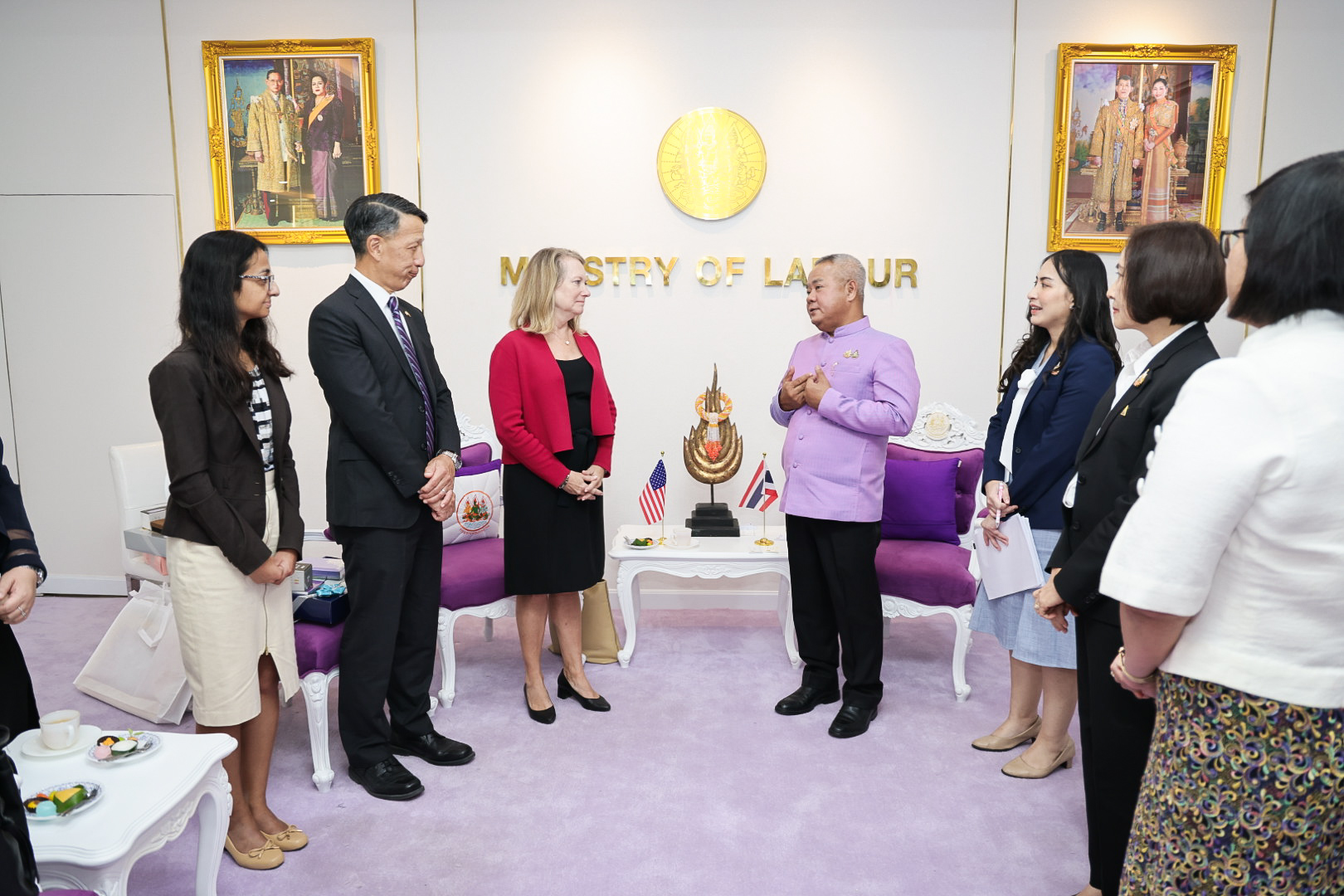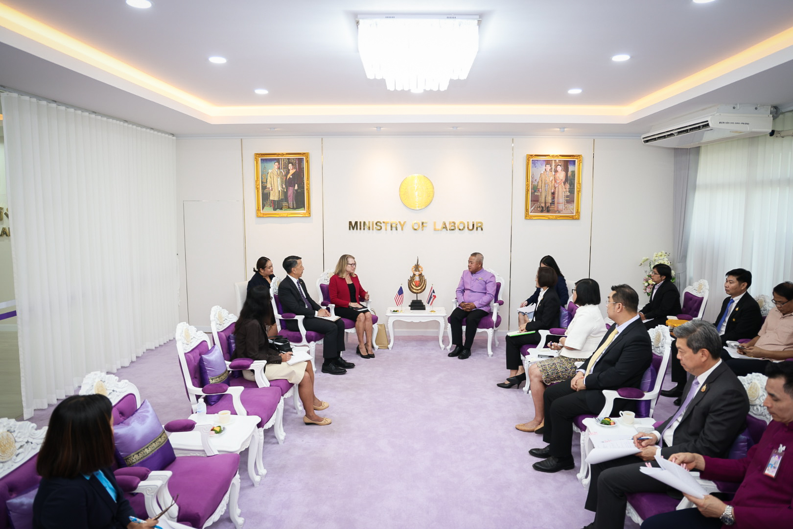 ให้การต้อนรับ คุณดิน่า บราวน์โลว์ (Ms. Dena Brownlow) ที่ปรึกษาฝ่ายการเมือง สถานเอกอัครราชทูตสหรัฐอเมริกาประจำประเทศไทย (Political Counselor) และ คุณแอนดรูว์ ชอว์ (Mr. Andrew Shaw)ที่ปรึกษาฝ่ายเศรษฐกิจ (Economic Counselor) ในโอกาสเข้าเยี่ยมคารวะและหารือข้อราชการเกี่ยวกับสถานการณ์แรงงานในประเทศไทย ณ ห้องรับรองปลัดกระทรวงแรงงาน ชั้น 7 อาคารกระทรวงแรงงาน