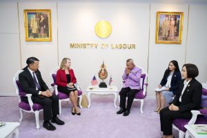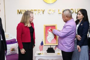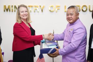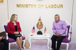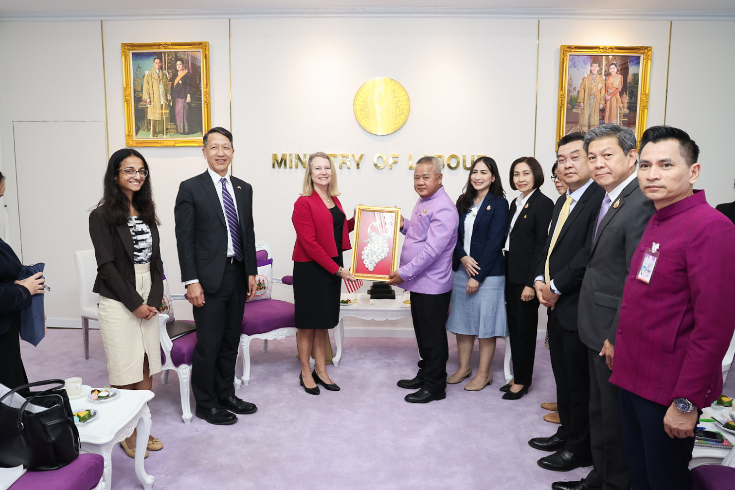 ด้าน คุณดิน่า บราวน์โลว์ ที่ปรึกษาฝ่ายการเมือง สถานเอกอัครราชทูตสหรัฐอเมริกาประจำประเทศไทย กล่าวว่า ขอบคุณท่านปลัดกระทรวงแรงงาน และคณะ ที่ให้โอกาสเข้าพบในวันนี้ และยินดีที่กลุ่มแรงงานได้รับการปล่อยตัว เราพยายามอย่างยิ่งในฐานะผู้ประสานงาน และขอบคุณกระทรวงแรงงานในการพัฒนามาตรฐานการคุ้มครองแรงงาน และให้ความร่วมมือในทุกด้านเป็นอย่างดี ครอบคลุมถึงความร่วมมือในการรวบรวมรายงานต่างๆ ตลอดจนความร่วมมือในอนาคตต่อไปด้วย