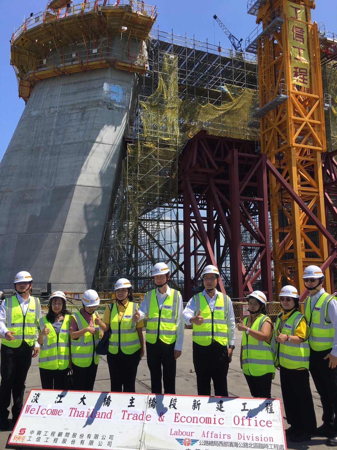 On September 11, 2023, at 11.15 hours, the Permanent Secretary of Labour, Mr. Boonchob Suttamanaswong, the executive team, and staff paid a visit and gave gifts to encourage Thai workers at the construction site for a bridge across the Danjiang River in New Taipei City. The bridge is being built by KUNG ENGINEERING CORPORATION, which employs approximately 300 Thai workers. Today, the Permanent Secretary of Labour encouraged the workers, advising and reminding them to follow Taiwan’s regulations, including drug prevention, riding electric bicycles, and liquor, so that Thai workers can adjust their work and life safely. In addition, the Taipei Office of Labour Protection and Welfare has introduced channels for contacting the Taipei Office of Labour and benefits from the Taiwan Labor Insurance Fund. The employers and workers expressed appreciation and gratitude for this visit to the workers. In addition, the company has also expressed its desire to hire Thai workers to work on other projects. In the past year alone, it has applied to import over 700 Thai workers. The company is willing to cooperate to further expand the Thai labour market in Taiwan.