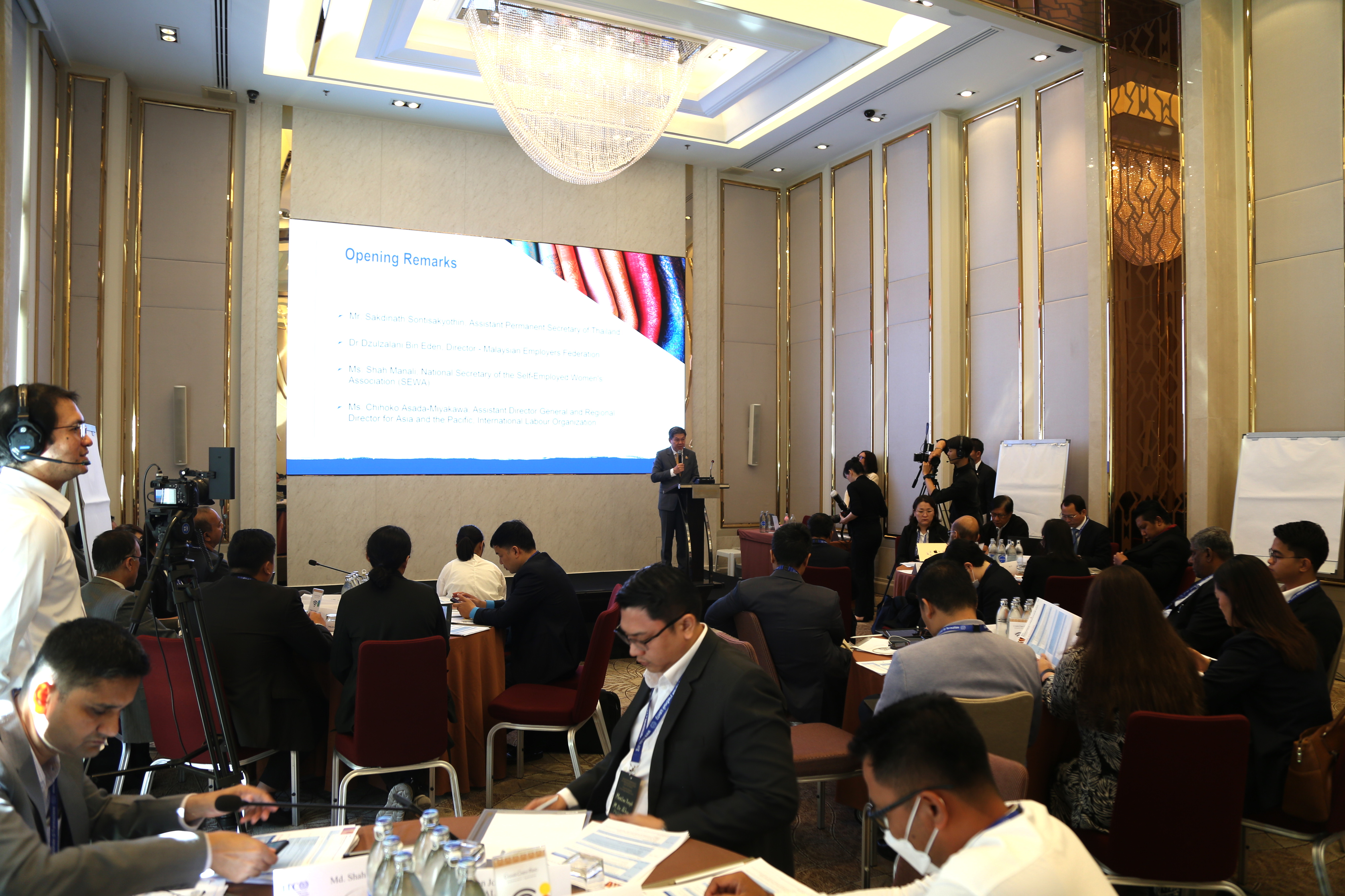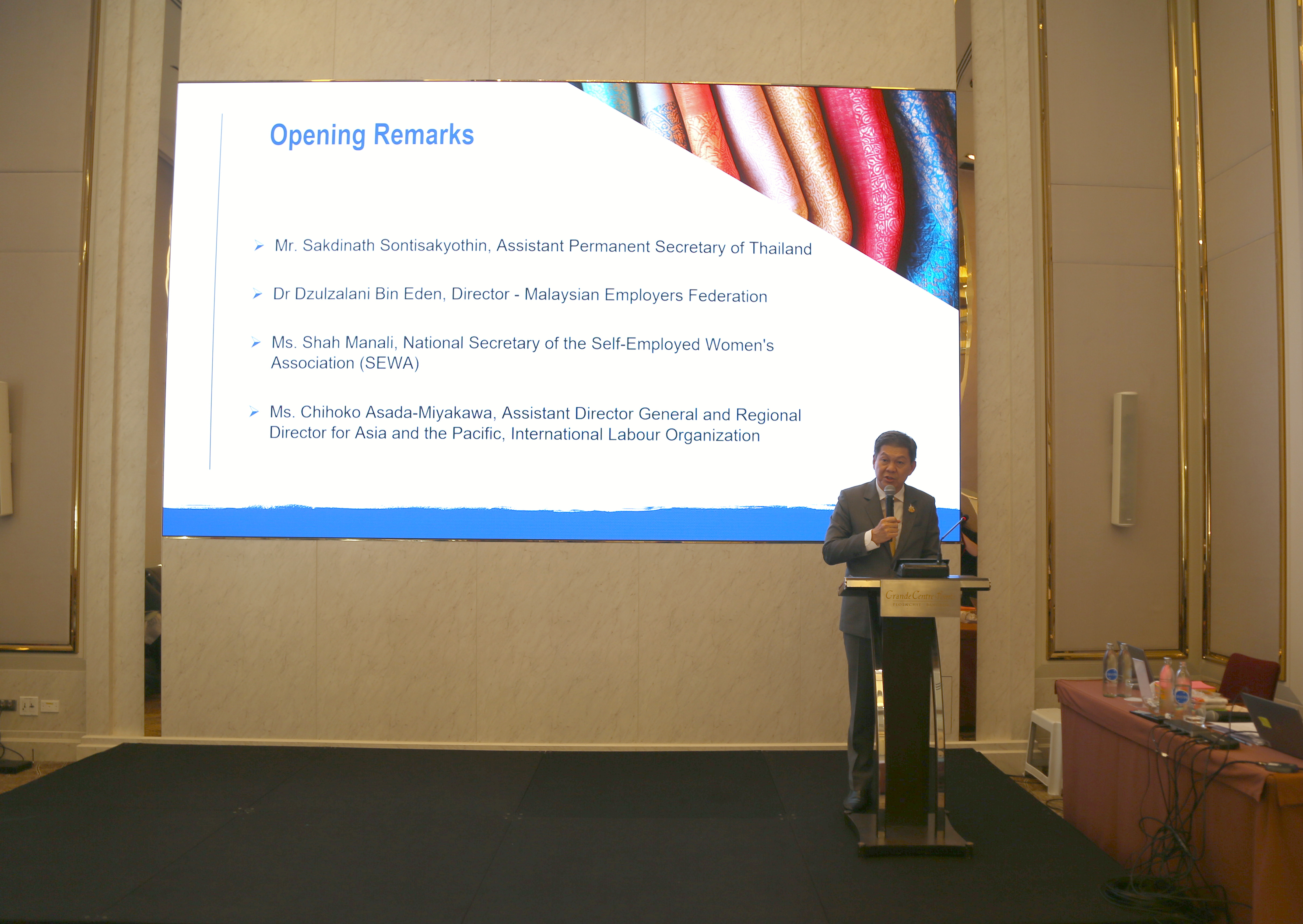 นายศักดินาถ กล่าวว่า ประเทศไทย มีความยินดีอย่างยิ่งที่ได้ต้อนรับทุกท่านเข้าสู่เวทีแลกเปลี่ยนเรียนรู้ไตรภาคีในระดับภูมิภาคเกี่ยวกับแนวทางเชิงนวัตกรรมในการส่งเสริมการเปลี่ยนผ่านไปสู่ระบบการจ้างงานที่เป็นทางการ ที่จัดขึ้นในวันนี้ ผมรู้สึกเป็นเกียรติอย่างยิ่งที่ได้มีโอกาสกล่าวเปิดงานในวันนี้ พร้อมขอต้อนรับผู้แทนจากทั่วทั้งภูมิภาค ไม่ว่าจะเป็นผู้นำ ผู้กำหนดนโยบาย หุ้นส่วนทางสังคม และผู้ปฏิบัติงานที่จะมาร่วมกันแลกเปลี่ยนมุมมองและความเชี่ยวชาญในประเด็นที่เกี่ยวข้องกับเวทีแลกเปลี่ยนนี้การที่ทุกท่านได้มีโอกาสมาร่วมงานในวันนี้ เป็นการสะท้อนให้เห็นถึงความสำคัญของการเปลี่ยนผ่านไปสู่ระบบการจ้างงานที่เป็นทางการ ซึ่งเป็นหนึ่งในเป้าหมายหลักของการพัฒนาอย่างยั่งยืน นอกจากนี้ การมารวมตัวในเวทีแห่งนี้ ยังถือเป็นการรับทราบร่วมกันว่า ปัญหาที่เกิดจากการจ้างงานนอกระบบเศรษฐกิจและตลาดแรงงานของโลก จำเป็นจะต้องได้รับการแก้ไขด้วยความร่วมมือที่สร้างสรรค์และมีความครอบคลุมประเทศไทยเองก็เป็นเหมือนกัประเทศอื่นๆ ที่ประสบปัญหาเกี่ยวกับการจ้างงานนอกระบบ ตลอดหลายทศวรรษที่ผ่านมา ตลาดแรงงานของประเทศไทยได้รับอิทธิพลจากกลไกระบบเศรษฐกิจสองภาคส่วน โดยมีแรงงานจำนวนมากที่อยู่ในภาคเศรษฐกิจนอกระบบ ตั้งแต่เกษตรรายย่อย ผู้ผลิตในครัวเรือน พ่อค้า แม่ค้าตามตลาด ไปจนถึงคนทำงานรับจ้างชั่วคราว อาจบอกได้ว่าเศรษฐกิจนอกระบบแทรกตัวอยู่ในทุกภาคส่วนของสังคมแม้ว่าการจ้างงานนอกระบบจะเปิดโอกาสในการจ้างงานและเพิ่มโอกาสทางเศรษฐกิจแก่คนจำนวนมาก อย่างไรก็ตาม การจ้างงานดังกล่าวยังคงมีความท้าทายที่ไม่อาจมองข้ามได้ แรงงานนอกระบบมักไม่ได้รับความคุ้มครองทางสังคม มีรายได้ที่ไม่มั่นคง และไม่ได้รับโอกาสในการพัฒนาทักษะในการประกอบอาชีพ สิ่งเหล่านี้ไม่เพียงแต่เป็นการจำกัดศักยภาพของแรงงานกลุ่มดังกล่าว แต่ยังเป็นการทำให้การเติบโตทางเศรษฐกิจโดยรวมมีการชะลอตัว สำหรับประเทศไทยเช่นเดียวกับหลายประเทศ การแก้ไขปัญหาการจ้างงานนอกระบบจึงไม่ใช่แค่ประเด็นด้านแรงงาน แต่เป็นความจำเป็นทางเศรษฐกิจและสังคมที่ต้องได้รับการแก้ไขในช่วงไม่กี่ปีที่ผ่านมา ประเทศไทยได้ดำเนินมาตรการเชิงรุกเพื่อจัดการกับปัญหาเหล่านี้ และได้มีการส่งเสริมการเปลี่ยนผ่านไปสู่ระบบการจ้างงานที่เป็นทางการ โดยมีความพยายามดังนี้ 1) การขยายความคุ้มครองทางประกันสังคม: โดยการเปิดรับสมัครผู้ประกันตนแบบสมัครใจ เพื่อให้แรงงานนอกระบบ