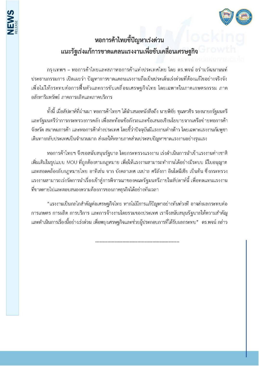 ขณะที่ด้านฝ่ายบริหารหอการค้าไทยและสภาหอการค้าแห่งประเทศไทย เผยต่อว่า ทางหน่วยงานพร้อมให้การสนับสนุนรัฐบาล ให้กระทรวงแรงงาน ดำเนินการนำเข้าแรงงานต่างชาติเพิ่มเติม เพื่อแก้ปัญหาขาดแคลนแรงงาน โดยทางฝ่ายเห็นถึงปัญหาในกรณีที่แรงงานกัมพูชาเดินทางกลับประเทศ ซึ่งแรงงานเหล่านี้จะเป็นกลไกสำคัญในการช่วยเต็มเติมความต้องการแรงงานให้ประเทศสามารถขับเคลื่อนเศรษฐกิจไปได้ หากไม่มีการแก้ปัญหาอย่างทันท่วงที อาจส่งผลกระทบต่อการเกษตร การผลิต การบริการ และการจ้างงานโดยรวมของประเทศ