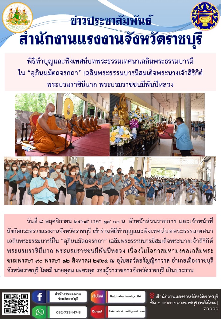 พิธีทำบุญและฟังเทศน์บทพระธรรมเทศนาเฉลิมพระธรรมบารมีใน “อุภินนมัตถจรกถา” เฉลิมพระธรรมบารมีสมเด็จพระนางเจ้าสิริกิต์ พระบรมราชินีนาถ พระบรมราชชนมีพันปีหลวง