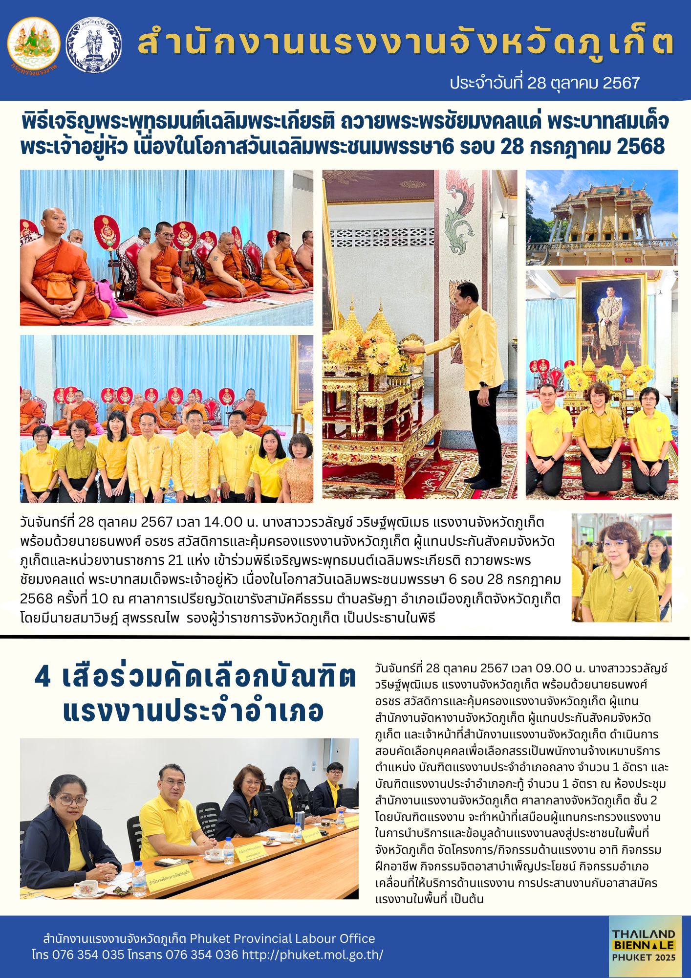 สรจ.ภูเก็ต พิธีเจริญพระพุทธมนต์เฉลิมพระเกียรติ ถวายพระพรชัยมงคลแด่ พระบาทสมเด็จพระเจ้าอยู่หัว เนื่องในโอกาสวันเฉลิมพระชนมพรรษา6 รอบ 28 กรกฎาคม 2568 และ 4 เสือร่วมคัดเลือกบัณฑิตแรงงานประจำอำเภอ