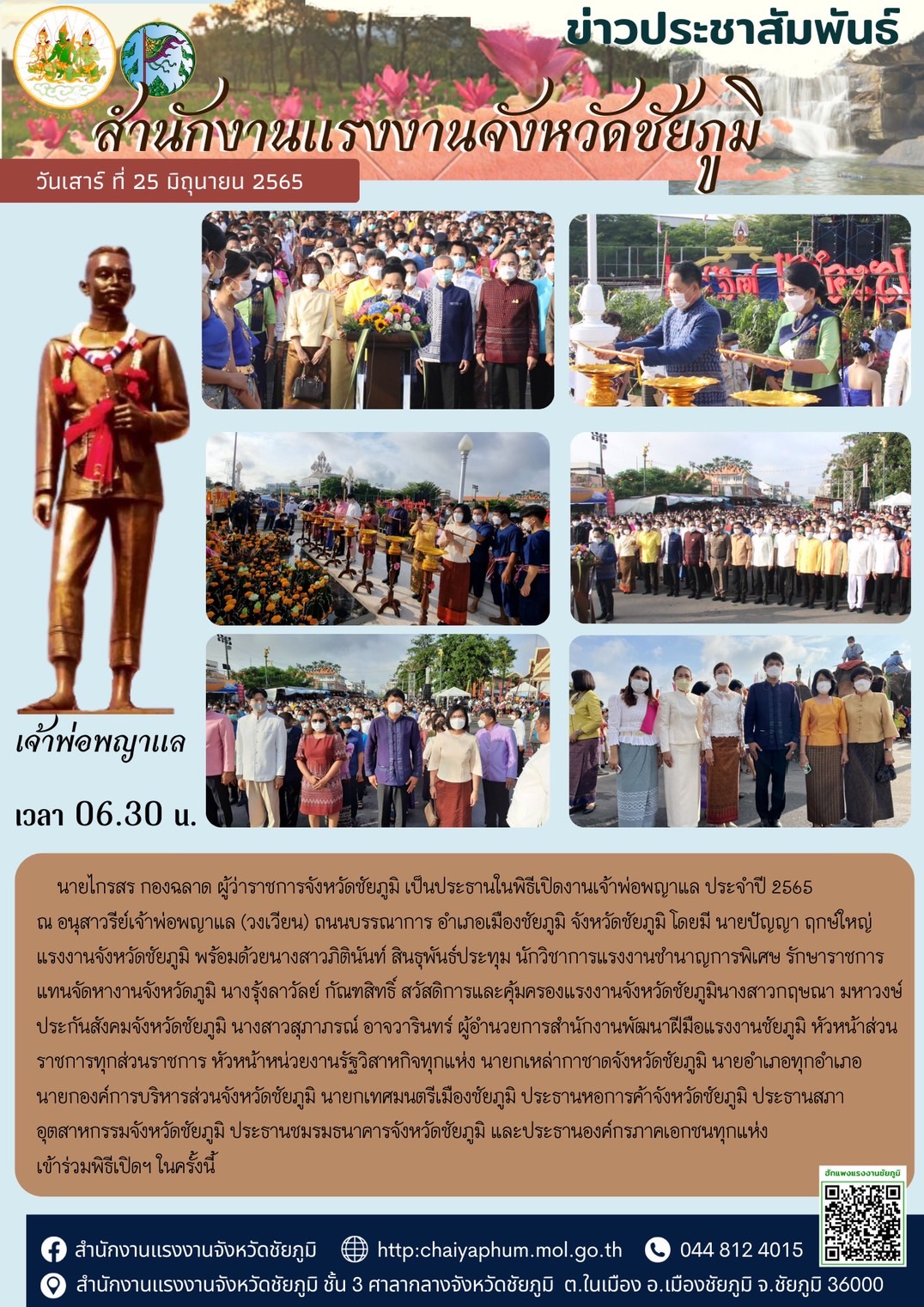 เวลา 06.30 น. นายไกรสร กองฉลาด ผู้ว่าราชการจังหวัดชัยภูมิ เป็นประธานในพิธีเปิดงานเจ้าพ่อพญาแล ประจำปี 2565ณ อนุสาวรีย์เจ้าพ่อพญาแล (วงเวียน) ถนนบรรณาการ อำเภอเมืองชัยภูมิ จังหวัดชัยภูมิ โดยมี นายปัญญา ฤกษ์ใหญ่แรงงานจังหวัดชัยภูมิ พร้อมด้วยนางสาวภิตินันท์ สินธุพันธ์ประทุม นักวิชาการแรงงานชำนาญการพิเศษ รักษาราชการแทนจัดหางานจังหวัดภูมิ นางรุ้งลาวัลย์ กัณฑสิทธิ์ สวัสดิการและคุ้มครองแรงงานจังหวัดชัยภูมินางสาวกฤษณา มหาวงษ์ประกันสังคมจังหวัดชัยภูมิ นางสาวสุภาภรณ์ อาจวารินทร์ ผู้อำนวยการสำนักงานพัฒนาฝีมือแรงงานชัยภูมิ หัวหน้าส่วนราชการทุกส่วนราชการ หัวหน้าหน่วยงานรัฐวิสาหกิจทุกแห่ง นายกเหล่ากาชาดจังหวัดชัยภูมิ นายอำเภอทุกอำเภอนายกองค์การบริหารส่วนจังหวัดชัยภูมิ นายกเทศมนตรีเมืองชัยภูมิ ประธานหอการค้าจังหวัดชัยภูมิ ประธานสภาอุตสาหกรรมจังหวัดชัยภูมิ ประธานชมรมธนาคารจังหวัดชัยภูมิ และประธานองค์กรภาคเอกชนทุกแห่งเข้าร่วมพิธีเปิดฯ ในครั้งนี้