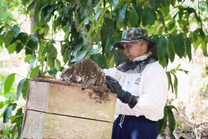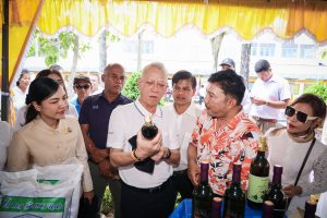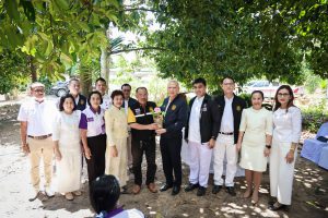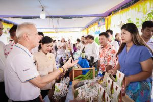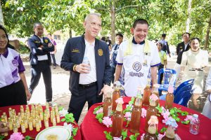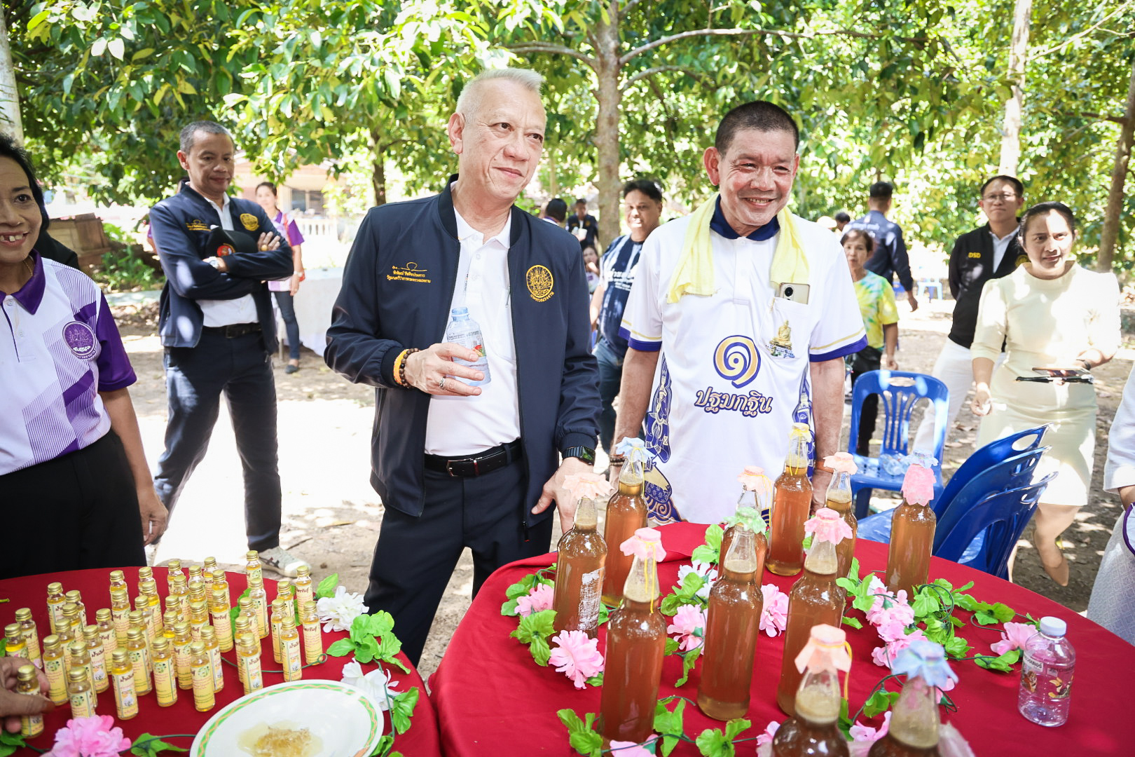 In the afternoon, Mr. Phiphat and the group visited the beekeeping process to see products obtained from bees, such as honey, honey soap, honey shampoo, honey hair conditioner, and beeswax balm mixed with herbs. The President of the Thai Beekeeping Community Enterprise Group, Mrs. Supaporn Sriperm, gave a brief on the process of raising hollow bees. Community leaders and group members welcomed them at the “Raising Thai Hollow Bees” community enterprise group, Lak Chang Subdistrict, Chang Klang District, Nakhon Si Thammarat Province. This group received support from agencies under the Ministry of Labour in Nakhon Si Thammarat Province, enabling them to generate income of approximately 2 million Baht per year.