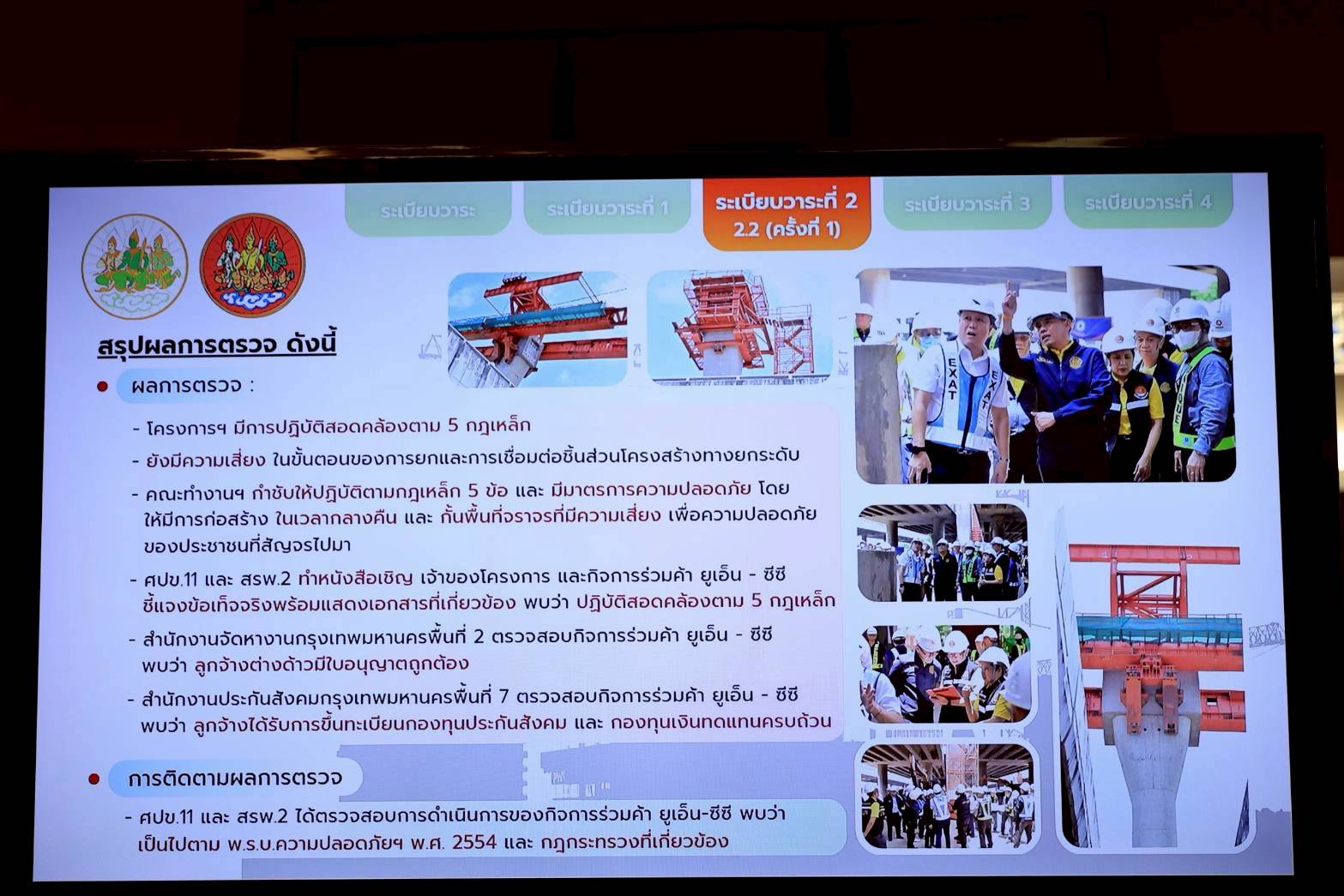 ด้าน เรือเอก สาโรจน์ คมคาย อธิบดีกรมสวัสดิการและคุ้มครองแรงงาน กล่าวว่า คณะทำงานฯ ได้เริ่มดำเนินการตรวจไซต์ก่อสร้างขนาดใหญ่ 3 แห่งในช่วงเมษายน–พฤษภาคมที่ผ่านมา ได้แก่ โครงการทางด่วนพระราม 3 จำนวน 2 จุด รถไฟฟ้าสายสีม่วง ช่วงเตาปูน–ราษฎร์บูรณะ พร้อมกำชับให้ผู้ประกอบการปฏิบัติตาม “5 กฎเหล็ก” อย่างเคร่งครัด ได้แก่ 1. กำหนดเขตอันตรายชัดเจน 2. ออกแบบโครงสร้างตามมาตรฐาน 3. ตรวจสอบเครื่องจักรหนัก 4. ควบคุมงานเข้มงวด 5. สวมใส่อุปกรณ์ป้องกันส่วนบุคคล