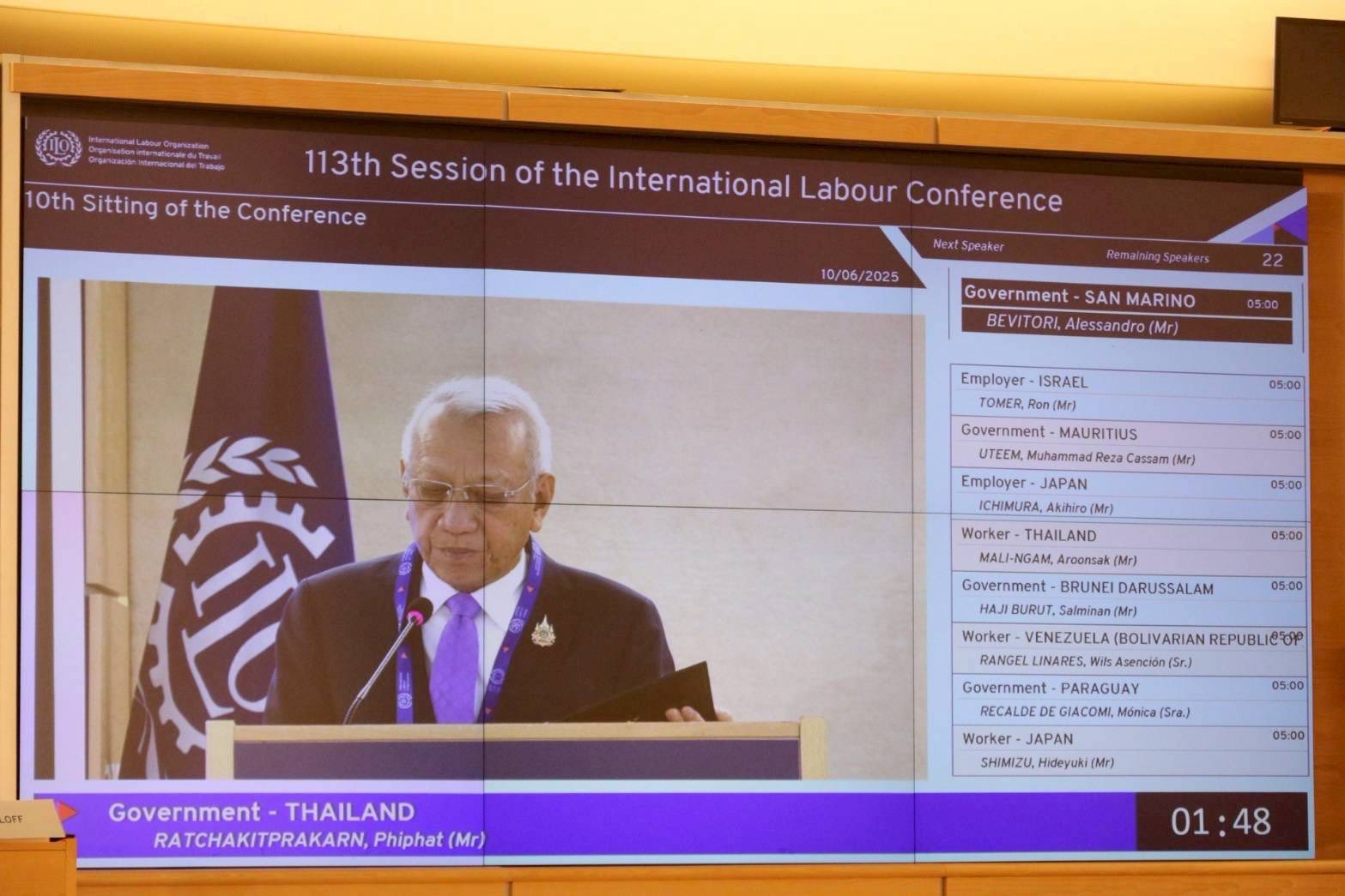 นครเจนีวา สมาพันธรัฐสวิส – วันที่ 12 มิถุนายน 2568 การประชุมใหญ่ประจำปีขององค์การแรงงานระหว่างประเทศ (ILO) สมัยที่ 113 ปิดฉากอย่างเป็นทางการ โดยประเทศไทยในนามกระทรวงแรงงาน นำโดยนายพิพัฒน์ รัชกิจประการ รัฐมนตรีว่าการกระทรวงแรงงาน นายบุญสงค์ ทัพชัยยุทธ์ ปลัดกระทรวงแรงงาน นายสมชาย มรกตศรีวรรณ อธิบดีกรมการจัดหางาน นายเดชา พฤกษ์พัฒนรักษ์ อธิบดีกรมพัฒนาฝีมือแรงงาน เรือเอกสาโรจน์คมคาย อธิบดีกรมสวัสดิการและคุ้มครองแรงงาน นางมารศรี ใจรังษี เลขาธิการสำนักงานประกันสังคม พร้อมด้วยผู้แทนฝ่ายนายจ้างและฝ่ายลูกจ้าง ได้ร่วมกล่าวถ้อยแถลงต่อที่ประชุมใหญ่ สะท้อนบทบาทเชิงรุกของไทยในเวทีแรงงานโลก และยืนยันพลังความร่วมมือแบบ “ไตรภาคี” ซึ่งเป็นรากฐานสำคัญของการขับเคลื่อนนโยบายแรงงานอย่างยั่งยืน