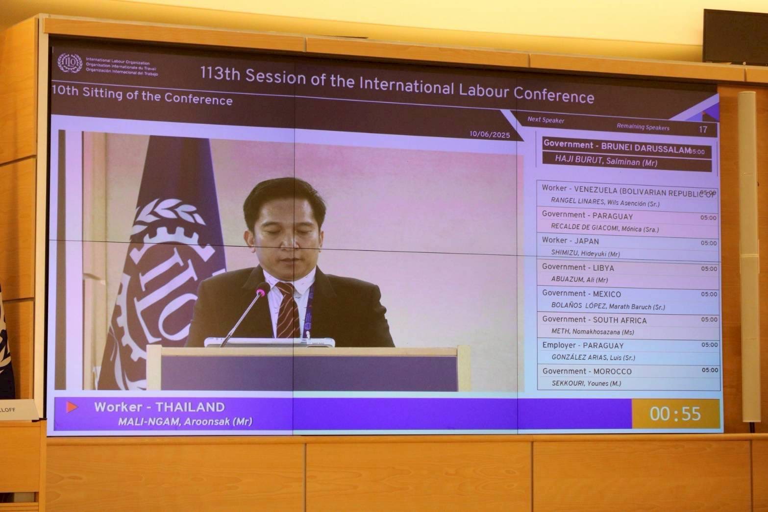 ด้านฝ่ายลูกจ้าง นายอรุณศักดิ์ มะลิงาม ผู้แทนแรงงานไทย ได้กล่าวถ้อยแถลงที่สะท้อนถึงความคาดหวังของแรงงานไทยต่อความเป็นธรรมในระบบแรงงาน โดยเน้นสิทธิการรวมตัวและการมีส่วนร่วมในกระบวนการไตรภาคีอย่างเท่าเทียม พร้อมเรียกร้องให้ภาครัฐไทยปรับข้อกฎหมายเพื่อให้สอดคล้องกับสภาพการทำงานของแรงงานทุกกลุ่มในปัจจุบัน โดยเฉพาะกฎกระทรวงการจ่ายค่าล่วงเวลา