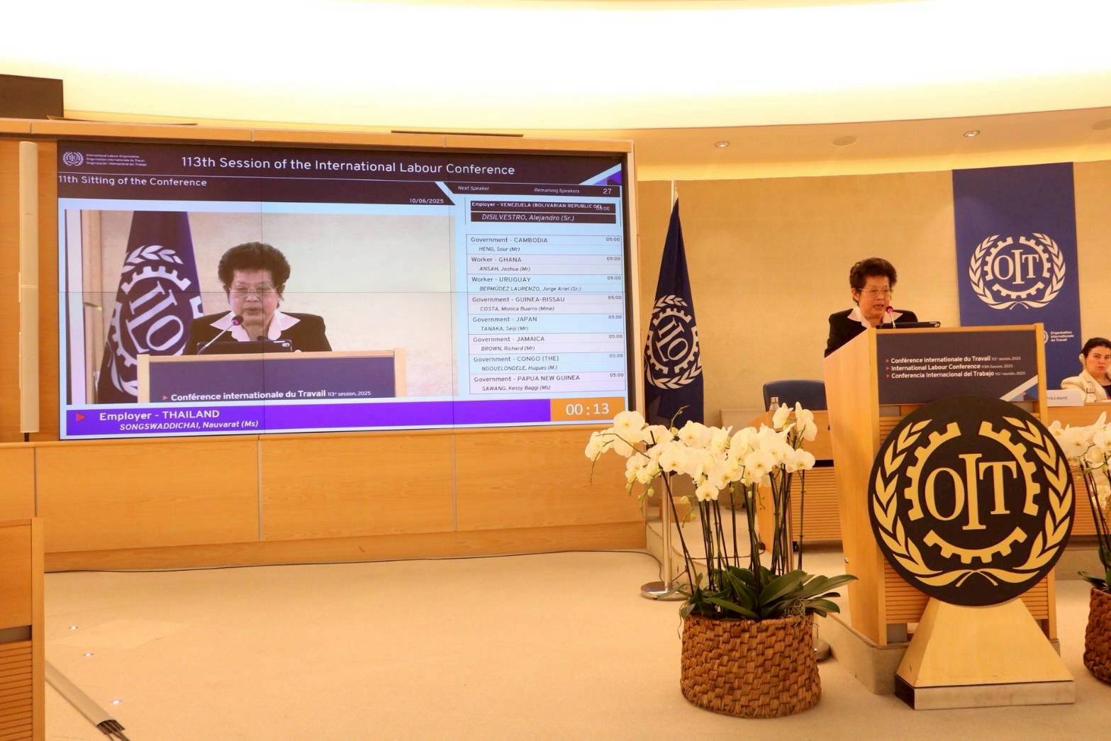 พร้อมกันนี้ ฝ่ายนายจ้าง นางเนาวรัตน์ ทรงสวัสดิ์ชัย ผู้แทนจากประเทศไทย ได้สะท้อนมุมมองของภาคธุรกิจต่อความท้าทายของเศรษฐกิจโลก โดยเสนอให้รัฐบาลประเทศสมาชิก ILO เดินหน้านโยบาย Reskill–Upskill แรงงานอย่างต่อเนื่อง พัฒนาทักษะรับอนาคต และส่งเสริมการจ้างงานอย่างยั่งยืน โดยเฉพาะในกลุ่มแรงงานสูงวัย รวมถึงร่วมกันวางแนวทางการเปลี่ยนผ่านสู่เศรษฐกิจสีเขียวและอุตสาหกรรมที่ใช้เทคโนโลยีขั้นสูง