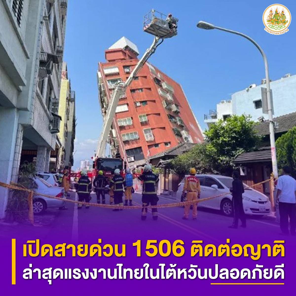 “Due to the disaster that occurred in Taiwan, I ask that the families of Thai workers working in Taiwan be assured that the Ministry of Labour cares and is ready to assist affected Thai workers. I ask that the Thai workers living in the vicinity of the said area take care of themselves, monitor the situation closely, follow government news, and follow any government recommendations.”