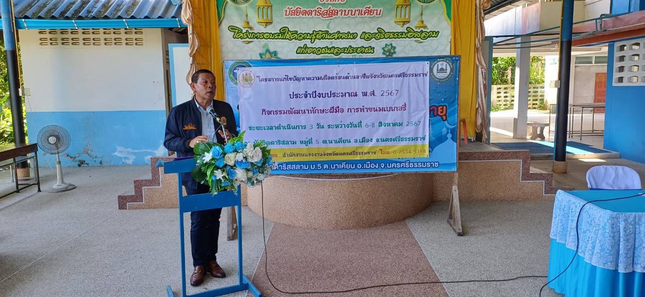 นายภูมิพัฒน์ เหมือนจันทร์ โฆษกกระทรวงแรงงาน เปิดเผยว่า ท่านพิพัฒน์ รัชกิจประการ รัฐมนตรีว่าการกระทรวงแรงงาน มีนโยบายสำคัญที่จะยกระดับการส่งเสริม คุ้มครอง และพัฒนาคุณภาพชีวิตแรงงานนอกระบบให้ดียิ่งขึ้น จึงได้มอบหมายให้ผมมาเป็นประธานในพิธีเปิดโครงการแก้ไขปัญหาความเดือนด้านอาชีพ ประจำปีงบประมาณ พ.ศ. 2567 กิจกรรมพัฒนาทักษะฝีมือ การทำขนมเบเกอรี่ ระยะเวลาฝึก 3 วัน โดยมี นางสาวนราภรณ์ สุวรรณประเสริฐ แรงงานจังหวัดนครศรีธรรมราช ผู้ใหญ่บ้าน หมู่ที่ 5 ตำบลนาเคียน โต๊ะอิหม่ามมัสยิดดาริสลาม อาสาสมัครแรงงาน และผู้เข้าร่วมกิจกรรมพัฒนาทักษะฝีมือ ร่วมให้การต้อนรับ ณ มัสยิดดาริสลาม หมู่ที่ 5 ตำบลนาเคียน อำเภอเมืองนครศรีธรรมราช จังหวัดนครศรีธรรมราช