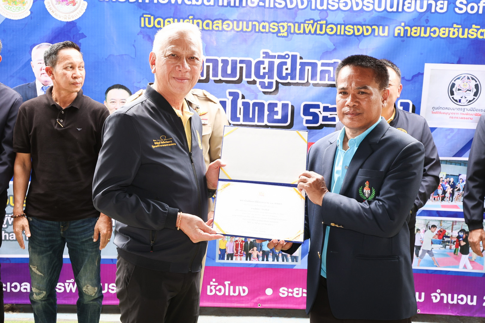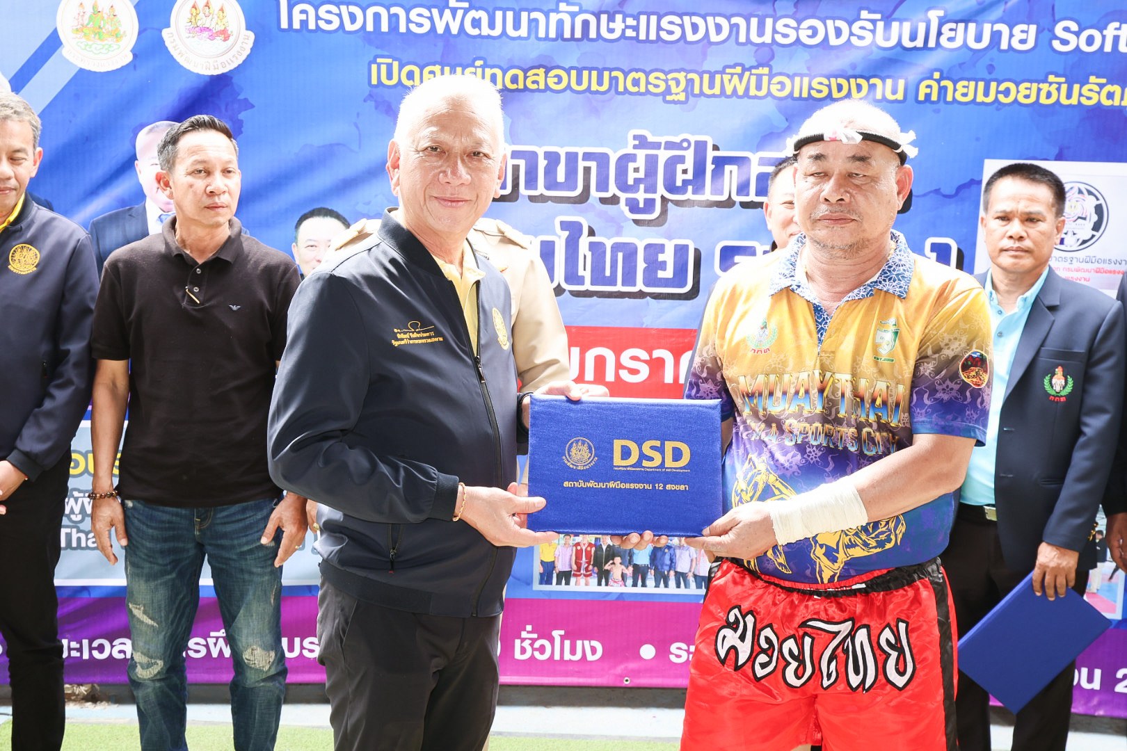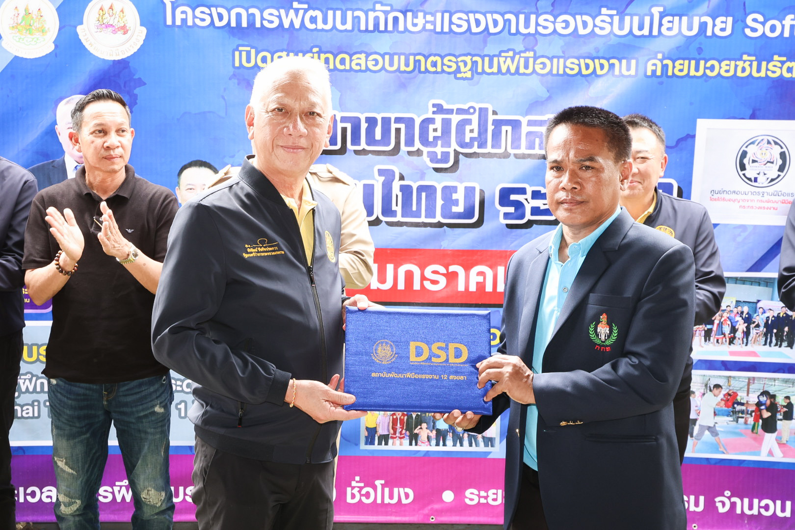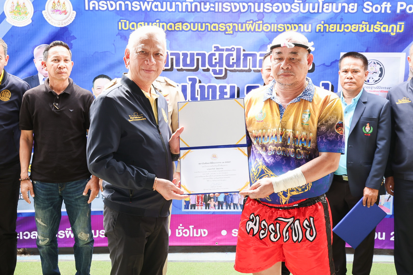 วันที่ 27 มกราคม 2568 นายพิพัฒน์ รัชกิจประการ รัฐมนตรีว่าการกระทรวงแรงงาน เป็นประธานพิธีมอบป้ายศูนย์ทดสอบมาตรฐานฝีมือแรงงาน สาขา ผู้ฝึกสอนมวยไทย ระดับ 1 และมอบวุฒิบัตรให้ผู้ผ่านการฝึกอบรม จำนวน 60 คน พร้อมปิดการฝึกอบรม โดยมี นายสังคม เกิดก่อ รองผู้ว่าราชการจังหวัดสงขลา กล่าวต้อนรับ นายเดชา พฤกษ์พัฒนรักษ์ อธิบดีกรมพัฒนาฝีมือแรงงาน กล่าวรายงาน พร้อมด้วย นายภุชงค์ วรศรี ประจำสำนักเลขาธิการนายกรัฐมนตรี ปฏิบัติหน้าที่ประจำกระทรวงแรงงาน นายพิเชษฐ์ ทองพันธ์ ผู้ตรวจราชการกระทรวงแรงงาน ผู้บริหารกระทรวงแรงงาน นายพิทยา รัตนพันธ์ นายกสมาคมกีฬามวยอาชีพภาคใต้ นาวาอากาศเอก อธิคุณ คงมี อดีตผู้อำนวยการ องค์การบริหารการพัฒนาพื้นที่พิเศษเพื่อการท่องเที่ยวอย่างยั่งยืน และหัวหน้าส่วนราชการสังกัดกระทรวงแรงงานร่วมเป็นเกียรติ ณ ค่ายมวยซันรัตภูมิ อำเภอรัตภูมิ จังหวัดสงขลา