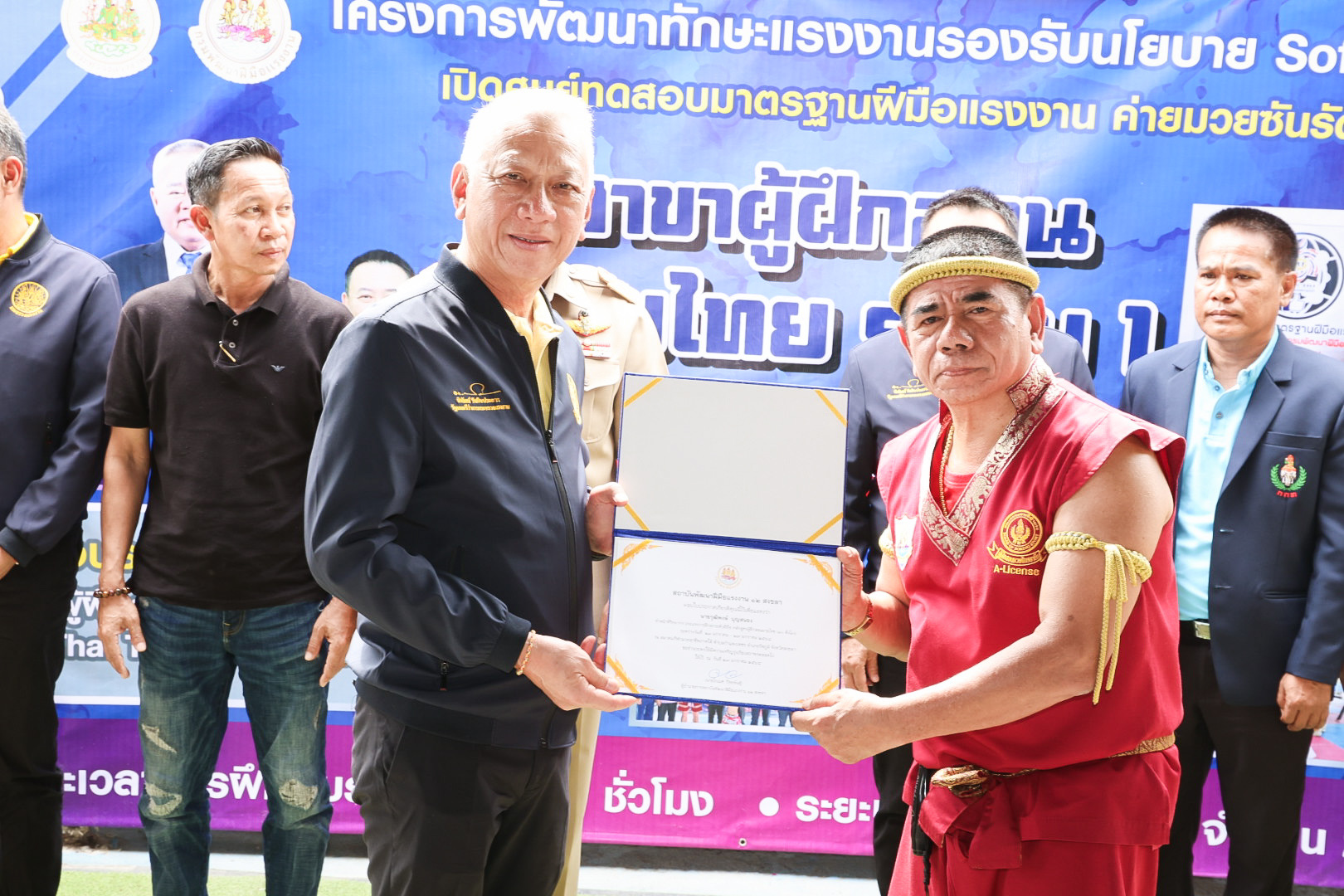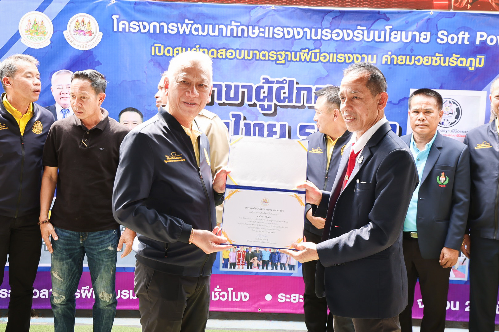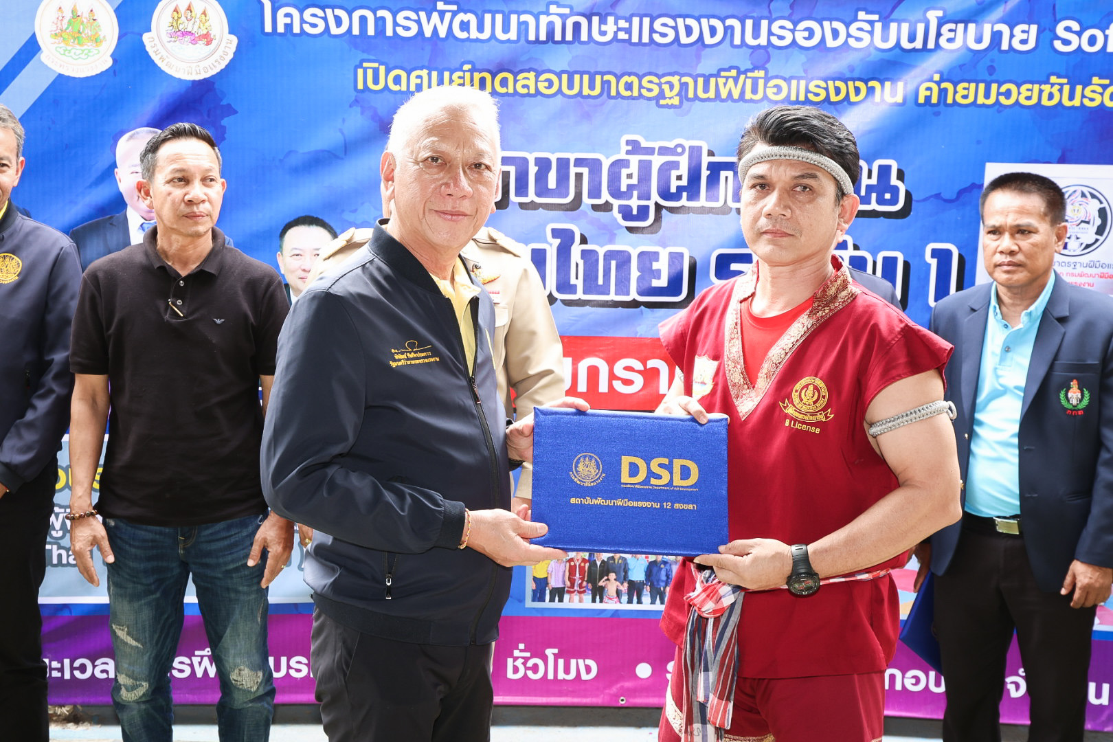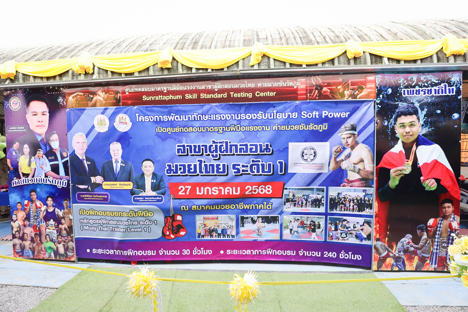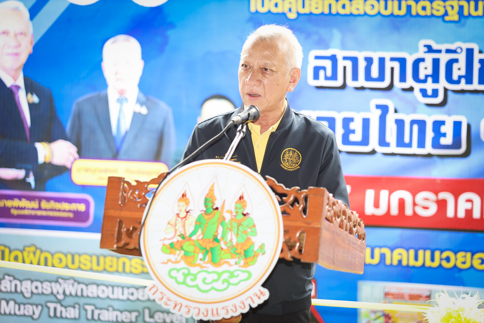 วันที่ 27 มกราคม 2568 นายพิพัฒน์ รัชกิจประการ รัฐมนตรีว่าการกระทรวงแรงงาน เป็นประธานพิธีมอบป้ายศูนย์ทดสอบมาตรฐานฝีมือแรงงาน สาขา ผู้ฝึกสอนมวยไทย ระดับ 1 และมอบวุฒิบัตรให้ผู้ผ่านการฝึกอบรม จำนวน 60 คน พร้อมปิดการฝึกอบรม โดยมี นายสังคม เกิดก่อ รองผู้ว่าราชการจังหวัดสงขลา กล่าวต้อนรับ นายเดชา พฤกษ์พัฒนรักษ์ อธิบดีกรมพัฒนาฝีมือแรงงาน กล่าวรายงาน พร้อมด้วย นายภุชงค์ วรศรี ประจำสำนักเลขาธิการนายกรัฐมนตรี ปฏิบัติหน้าที่ประจำกระทรวงแรงงาน นายพิเชษฐ์ ทองพันธ์ ผู้ตรวจราชการกระทรวงแรงงาน ผู้บริหารกระทรวงแรงงาน นายพิทยา รัตนพันธ์ นายกสมาคมกีฬามวยอาชีพภาคใต้ นาวาอากาศเอก อธิคุณ คงมี อดีตผู้อำนวยการ องค์การบริหารการพัฒนาพื้นที่พิเศษเพื่อการท่องเที่ยวอย่างยั่งยืน และหัวหน้าส่วนราชการสังกัดกระทรวงแรงงานร่วมเป็นเกียรติ ณ ค่ายมวยซันรัตภูมิ อำเภอรัตภูมิ จังหวัดสงขลา