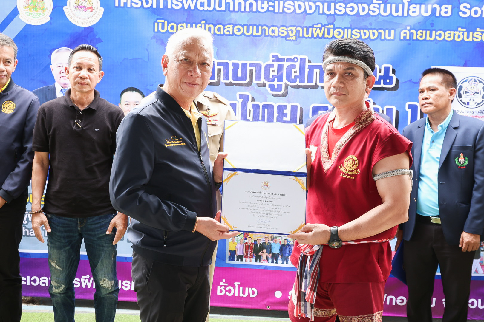 นายเดชา พฤกษ์พัฒนรักษ์ อธิบดีกรมพัฒนาฝีมือแรงงาน กล่าวเสริมว่า ผู้ที่จะเป็นครูมวยไทย ระดับ 1 ต้องเข้ารับการทดสอบภาคความรู้ 20% และทดสอบภาคความสามารถ ได้แก่ การใช้หมัด เท้า เข่า ศอก และการไหว้ครู 80% ปัจจุบันมีศูนย์ทดสอบผู้ฝึกสอนมวยไทยที่ได้รับอนุญาตแล้ว จำนวน 29 หน่วย เช่น กำปั้นมวยไทยยิม ขอนแก่น ค่ายมวย ช.ชนะชัย พัทลุง โรงเรียนไทเกอร์ มวยไทย แอนด์ มิกซ์มาร์เชี่ยล อาร์ต กรุงเทพมหานคร เป็นต้น รวมทั้งยังมีศูนย์ทดสอบของสถาบันพัฒนาฝีมือแรงงาน และสำนักงานพัฒนาฝีมือแรงงาน อีก 77 แห่งทั่วประเทศ สำหรับผู้ที่สนใจเข้ารับการทดสอบ สามารถติดต่อได้ที่ศูนย์ทดสอบดังกล่าว หรือดูเพิ่มเติมได้ที่เว็บไซต์ กรมพัฒนาฝีมือแรงงาน ทะเบียนศูนย์ทดสอบมาตรฐานฝีมือแรงงาน http://gcloud.dsd.go.th/tc/ ทั้งนี้ มีค่าดำเนินการทดสอบ 1,600 บาท ต่อคน สำหรับผู้สนใจเข้ารับการทดสอบในต่างประเทศ เมื่อปลายปี 2567 กรมพัฒนาฝีมือแรงงานได้ดำเนินการทดสอบที่ไต้หวัน รวมถึงในปีนี้ช่วงเดือนพฤษภาคม 2568 มีแผนจะดำเนินการทดสอบที่ประเทศญี่ปุ่นอีกด้วย