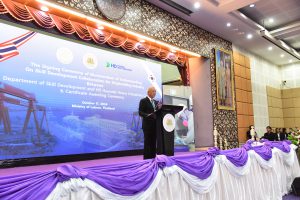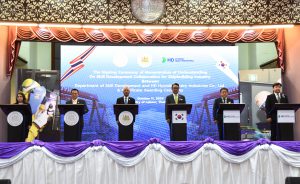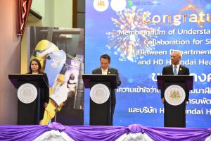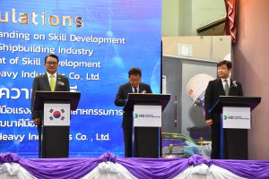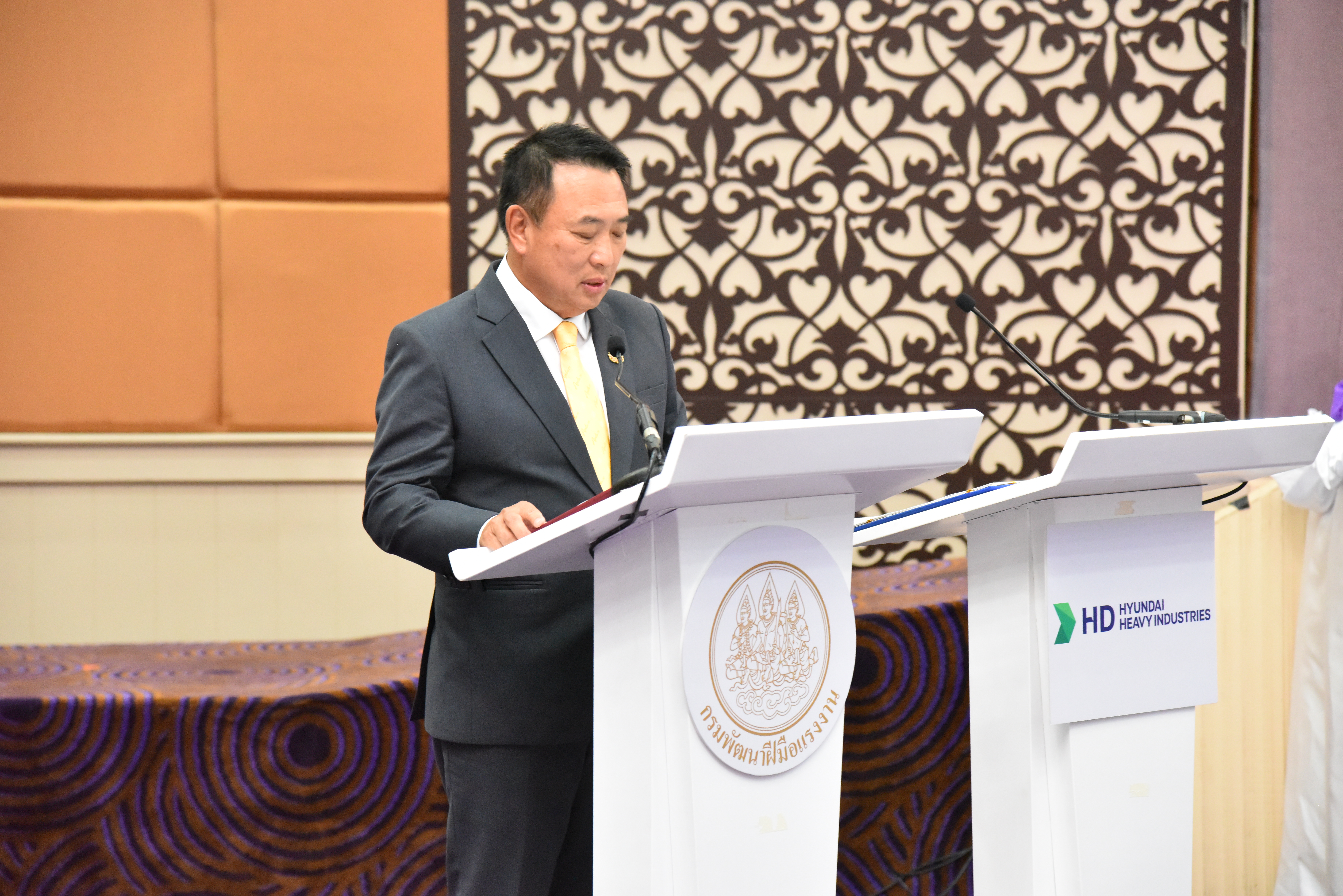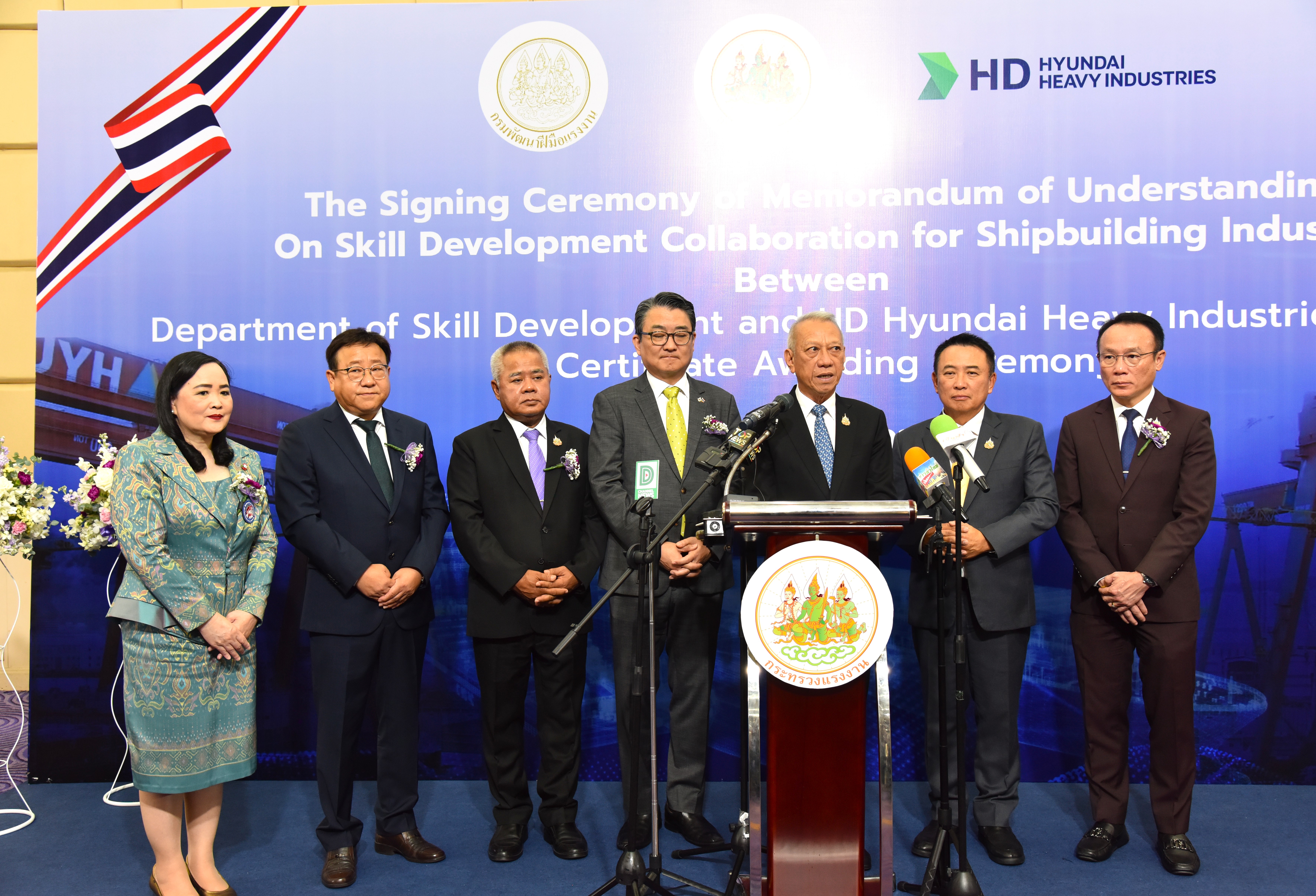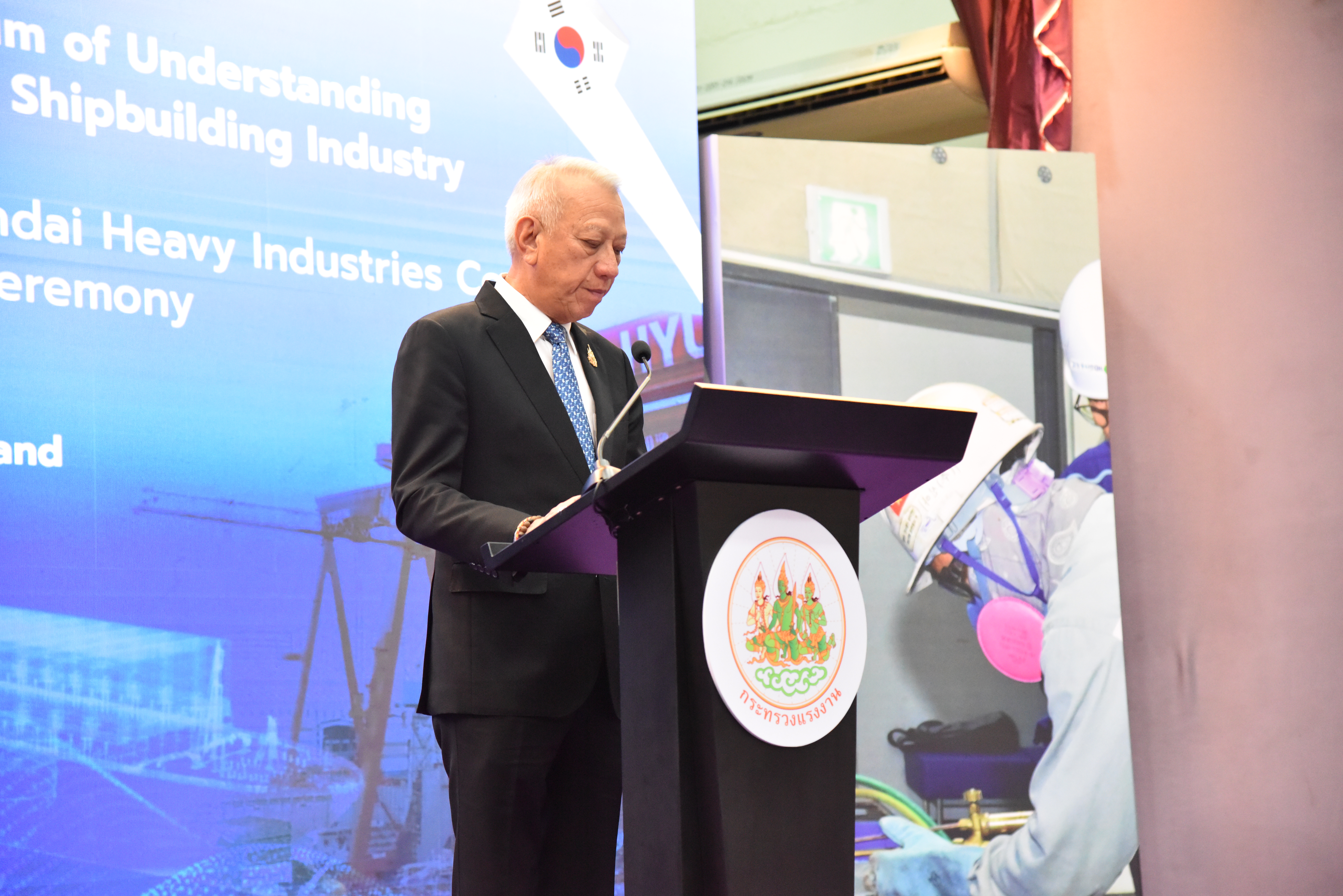 นายพิพัฒน์ รัชกิจประการ รัฐมนตรีว่าการกระทรวงแรงงาน กล่าวว่าเมื่อเดือนมีนาคมที่ผ่านมา ได้มีโอกาสเดินทางไปราชการ ณ สาธารณรัฐเกาหลี เพื่อพบปะหารือกับผู้แทนบริษัท HD Hyundai Heavy Industries ซึ่งเป็นสถานประกอบการที่ดำเนินธุรกิจด้านอู่ต่อเรือ พบว่าในปัจจุบันบริษัทมีความต้องการแรงงานไทยที่มีทักษะฝีมือจำนวนมาก โดยเฉพาะช่างเชื่อม เนื่องจากกระบวนการต่อเรือ 1 ลำ ใช้ทักษะเฉพาะที่อาศัยความประณีต ถูกต้องและแม่นยำสูง นอกจากนี้ต้องใช้เทคโนโลยีชั้นสูงหลายด้านในการต่อเรือ จึงมอบหมายให้กรมพัฒนาฝีมือแรงงานเร่งยกระดับช่างเชื่อมไทยให้มีมาตรฐานและมีประสิทธิภาพ เพื่อรองรับอุตสาหกรรมต่อเรือ และการจ้างงานทั้งในประเทศและต่างประเทศ จึงได้เกิดความร่วมมือในวันนี้ขึ้น ต้องขอบคุณนายปาร์คยองมิน (Yong-min Park) เอกอัครราชทูตสาธารณรัฐเกาหลี ประจำประเทศไทย ในการสนับสนุนแรงงานไทยและผู้ประกอบการในสาธารณรัฐเกาหลี เพื่อบูรณาการร่วมกันจัดทำแผนพัฒนาฝีมือแรงงาน การพัฒนาหลักสูตร การพัฒนามาตรฐานฝีมือแรงงาน เพื่อรองรับอุตสาหกรรมการต่อเรือ