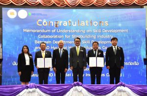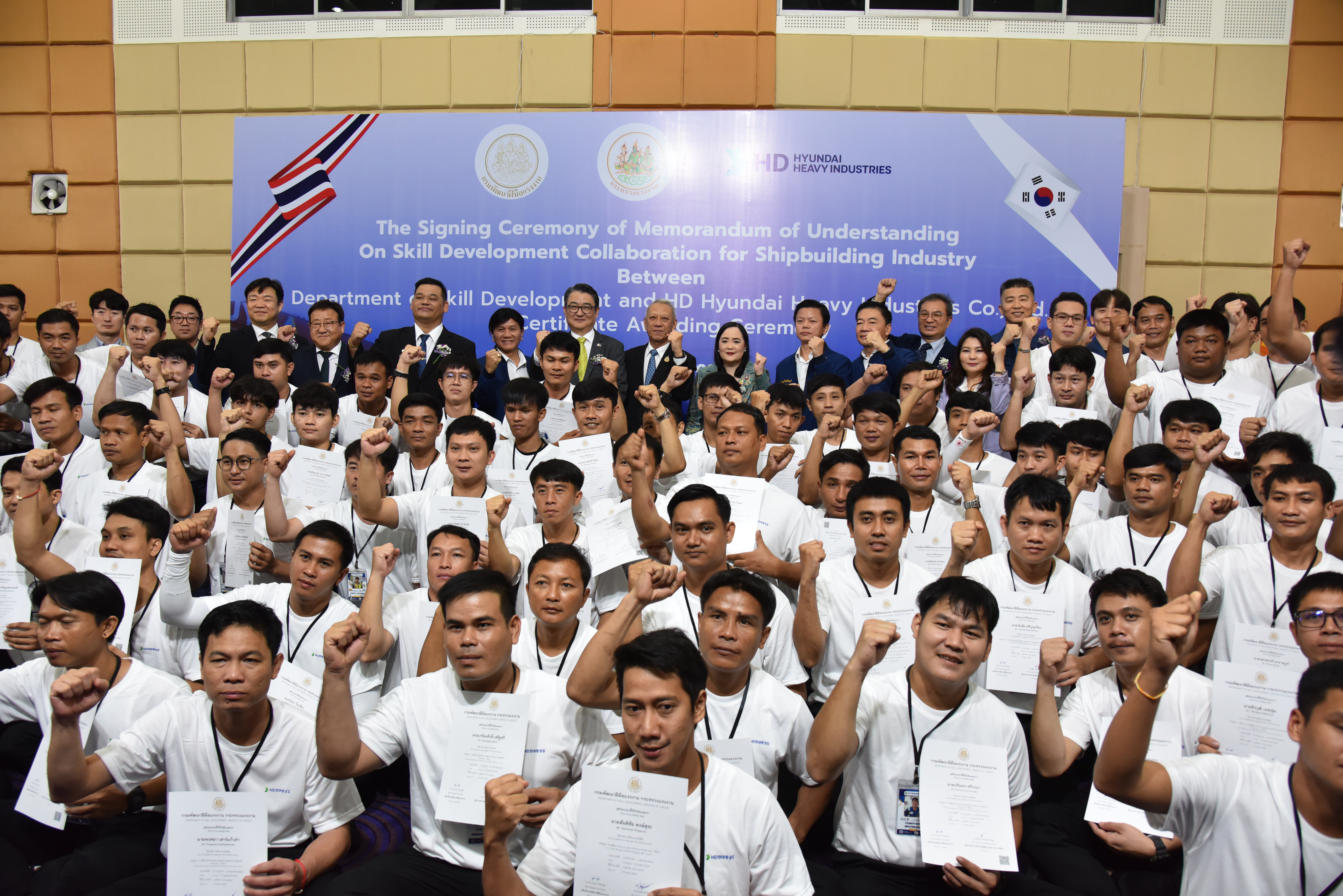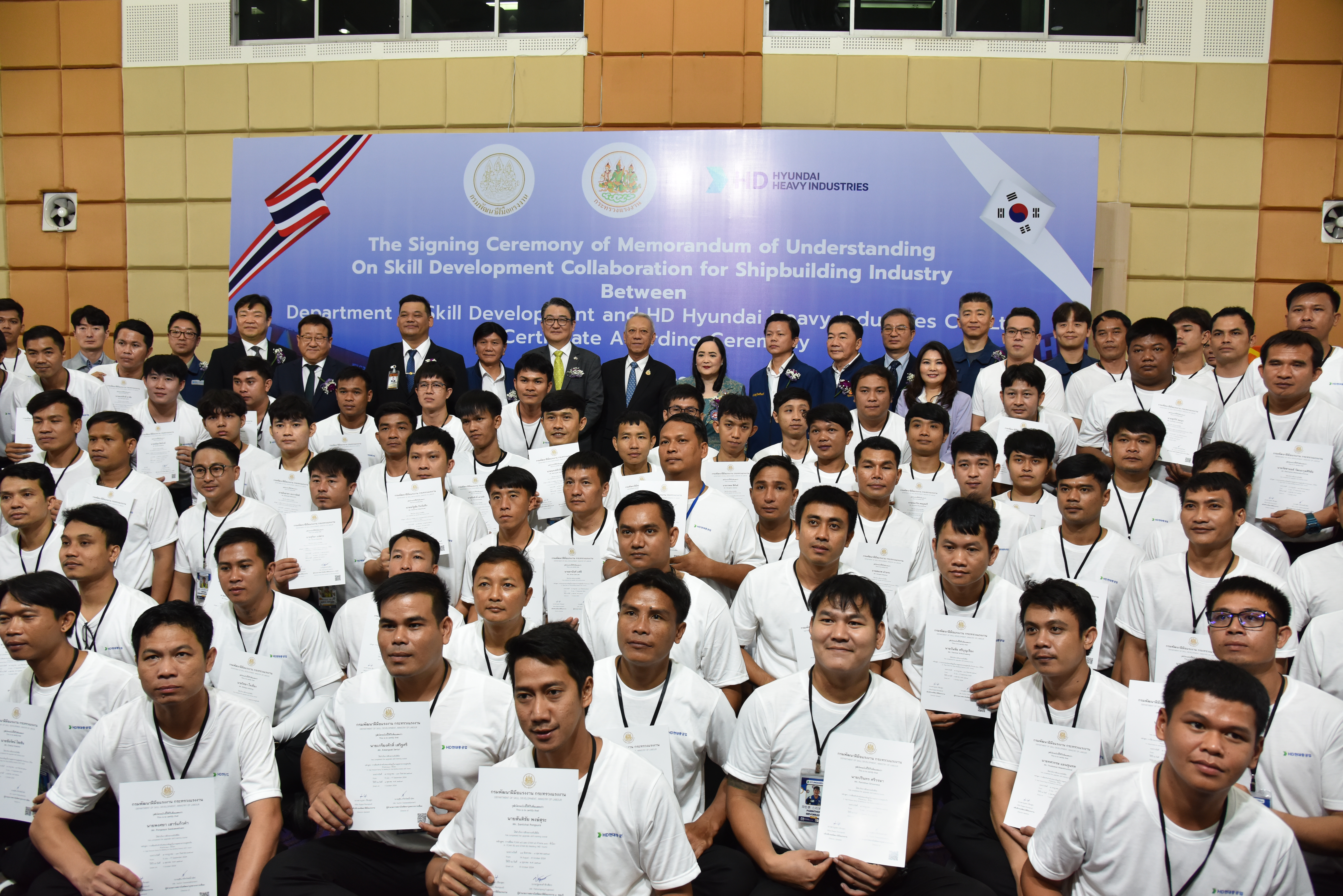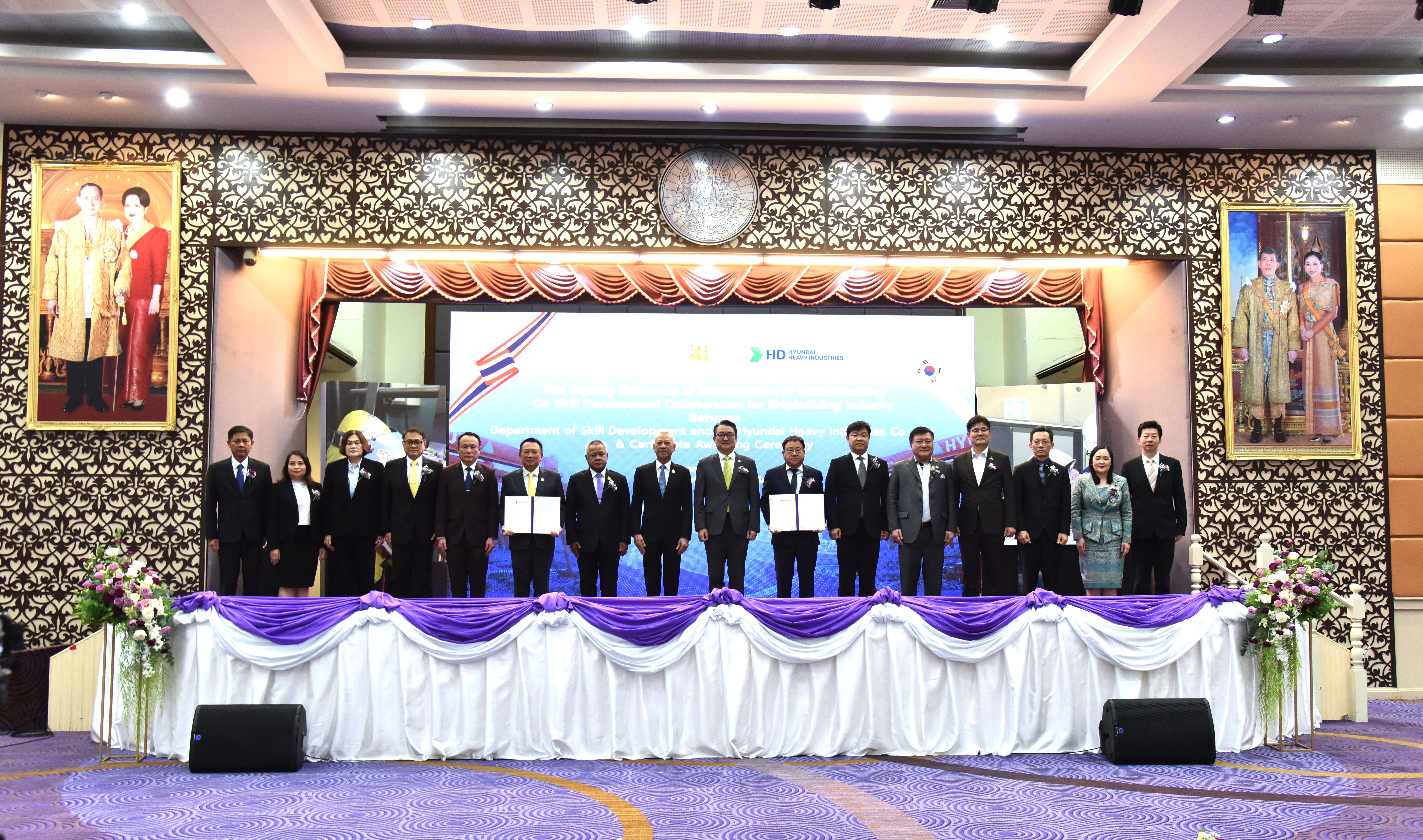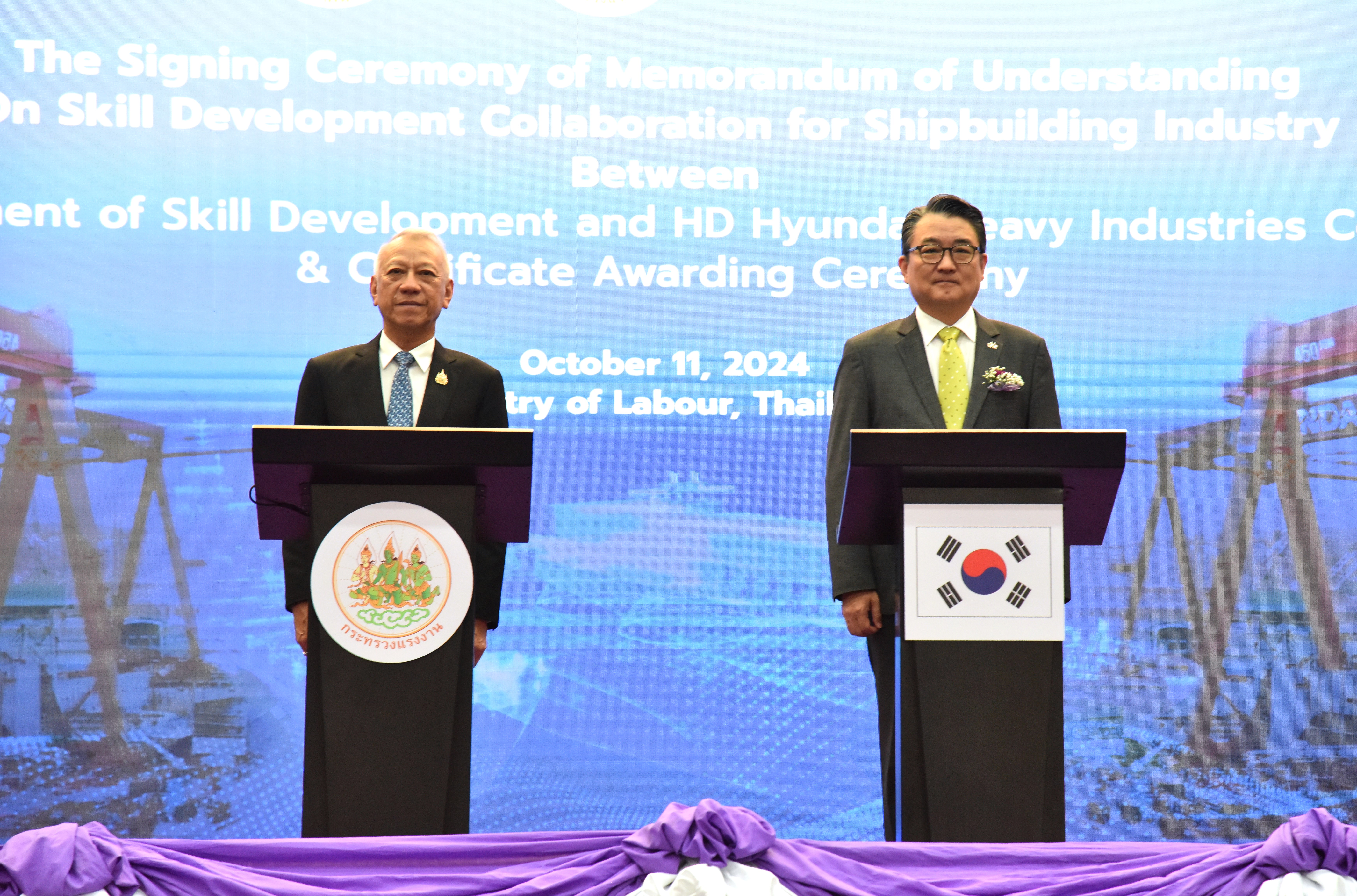 วันที่ 11 ตุลาคม 2567 นายพิพัฒน์ รัชกิจประการ รัฐมนตรีว่าการกระทรวงแรงงาน เป็นประธานการลงนามบันทึกความเข้าใจว่าด้วยการพัฒนาฝีมือแรงงานด้านอุตสาหกรรมการต่อเรือ ระหว่างกรมพัฒนาฝีมือแรงงาน และบริษัท HD Hyundai Heavy Industries C0. , Ltd. โดยมีนายบุญสงค์ ทัพชัยยุทธ ปลัดกระทรวงแรงงาน นายเดชา พฤกษ์พัฒนรักษ์ รองปลัดกระทรวงแรงงาน รักษาราชการแทนอธิบดีกรมพัฒนาฝีมือแรงงาน และคุณ คิม ดอง อิล รองประธานบริษัท HD Hyundai Heavy Industries ร่วมลงนาม นางสาวบุณยวีร์ ไขว้พันธุ์ ผู้ตรวจราชการกระทรวงแรงงาน นายพิเชษฐ์ ทองพันธ์ รองอธิบดีกรมพัฒนาฝีมือแรงงาน รักษาการในตำแหน่งผู้ตรวจราชการกระทรวงแรงงาน นายปาร์คยองมิน (Yong-min Park) เอกอัครราชทูตสาธารณรัฐเกาหลี ประจำประเทศไทย ผู้บริหารสังกัดกระทรวงแรงงาน ผู้บริหารบริษัท HD Hyundai Heavy Industries และ นางสาวอรัญญา สกุลโกศล ประธานสมาคมนายจ้างส่งเสริมแรงงานไทย ร่วมพิธีด้วย ณ ห้องประชุม ชั้น 5 อาคารกระทรวง