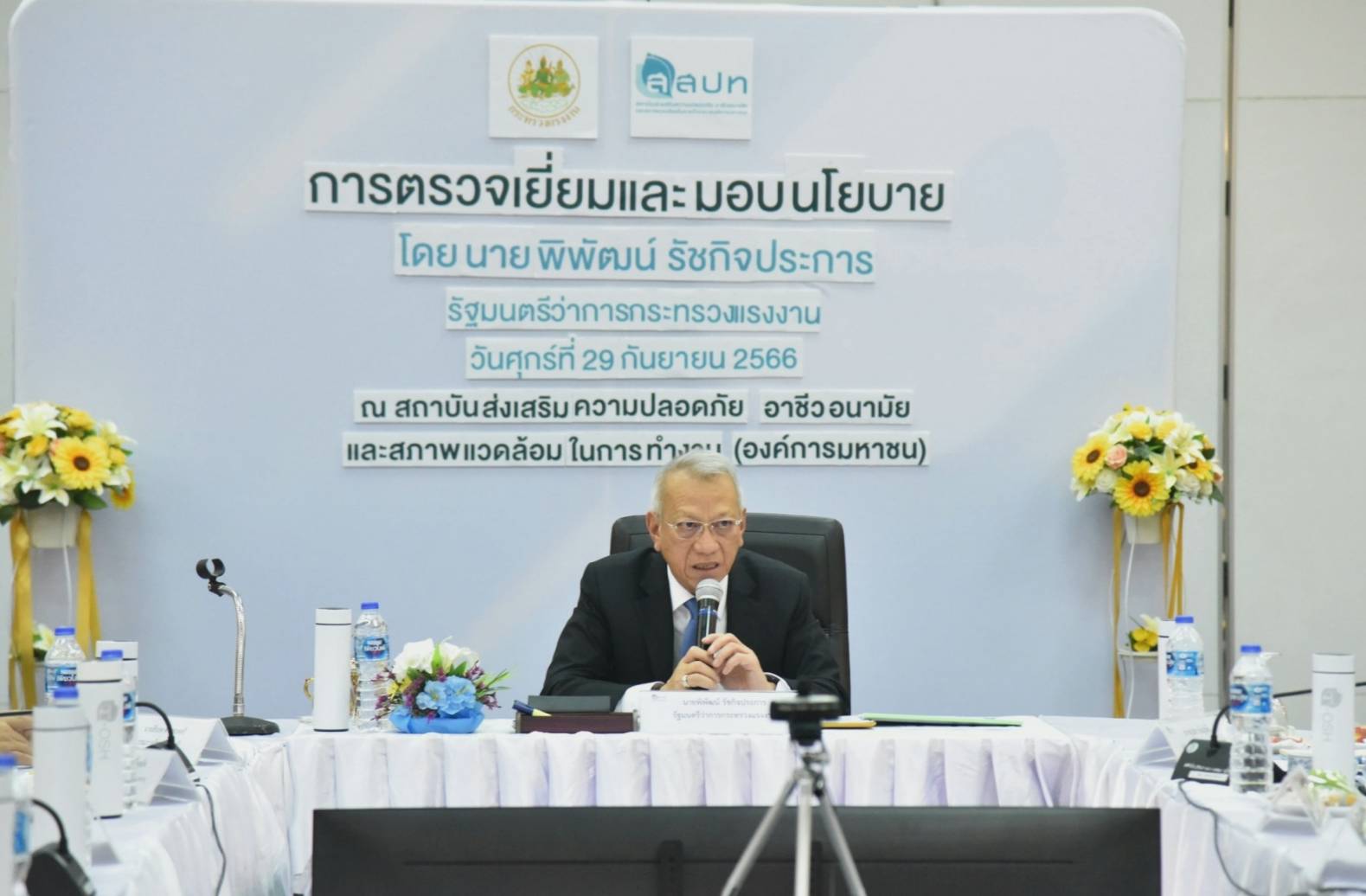 On September 28, 2023, at 14.00 hours, the Labour Minister, Mr. Phiphat Ratchakitprakarn, chaired the meeting to present policies to executives and officials of the Thailand Institute Of Occupational Safety and Health (Public Organization), 4th floor, Department of Labour Protection and Welfare building, Taling Chan Intersection.