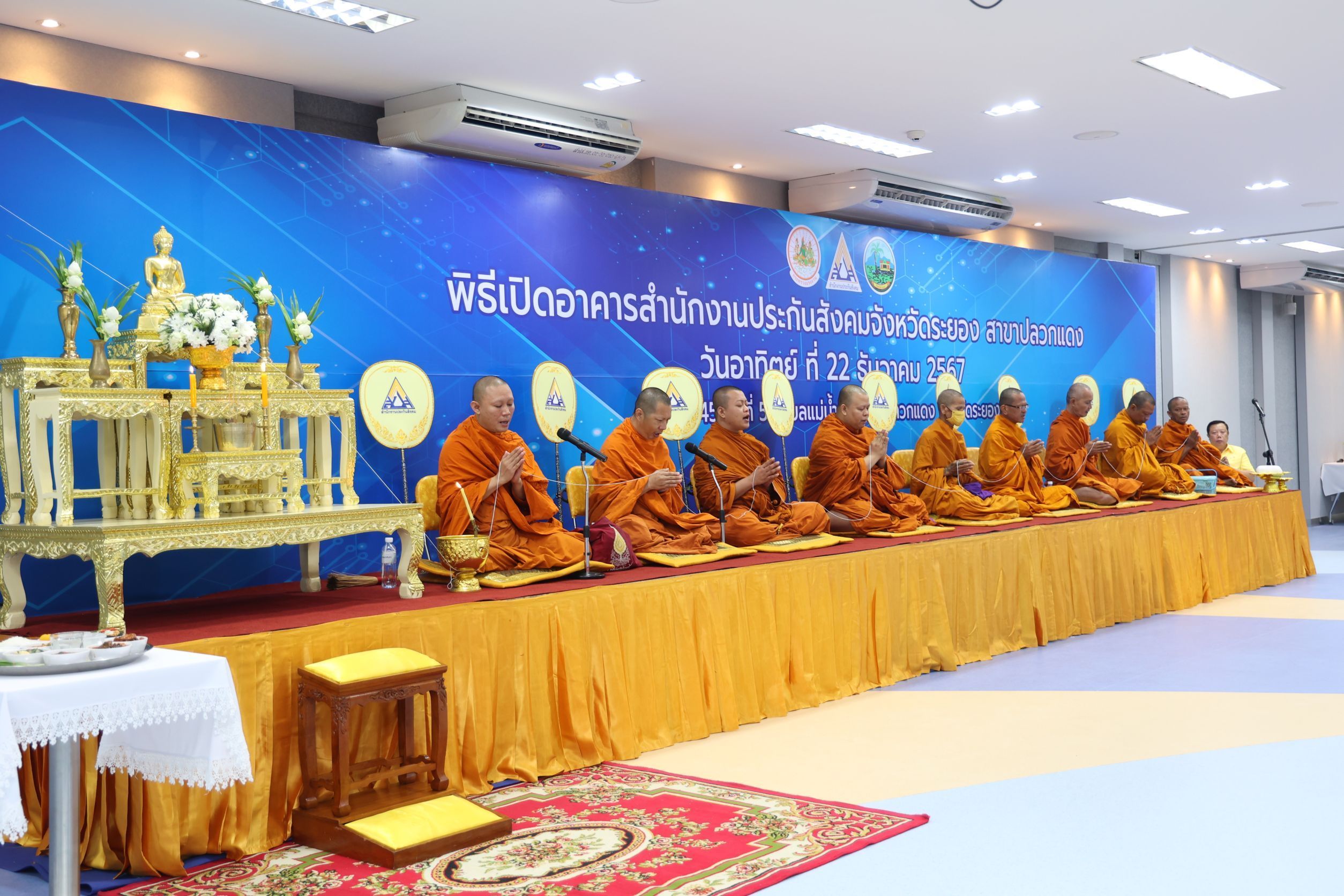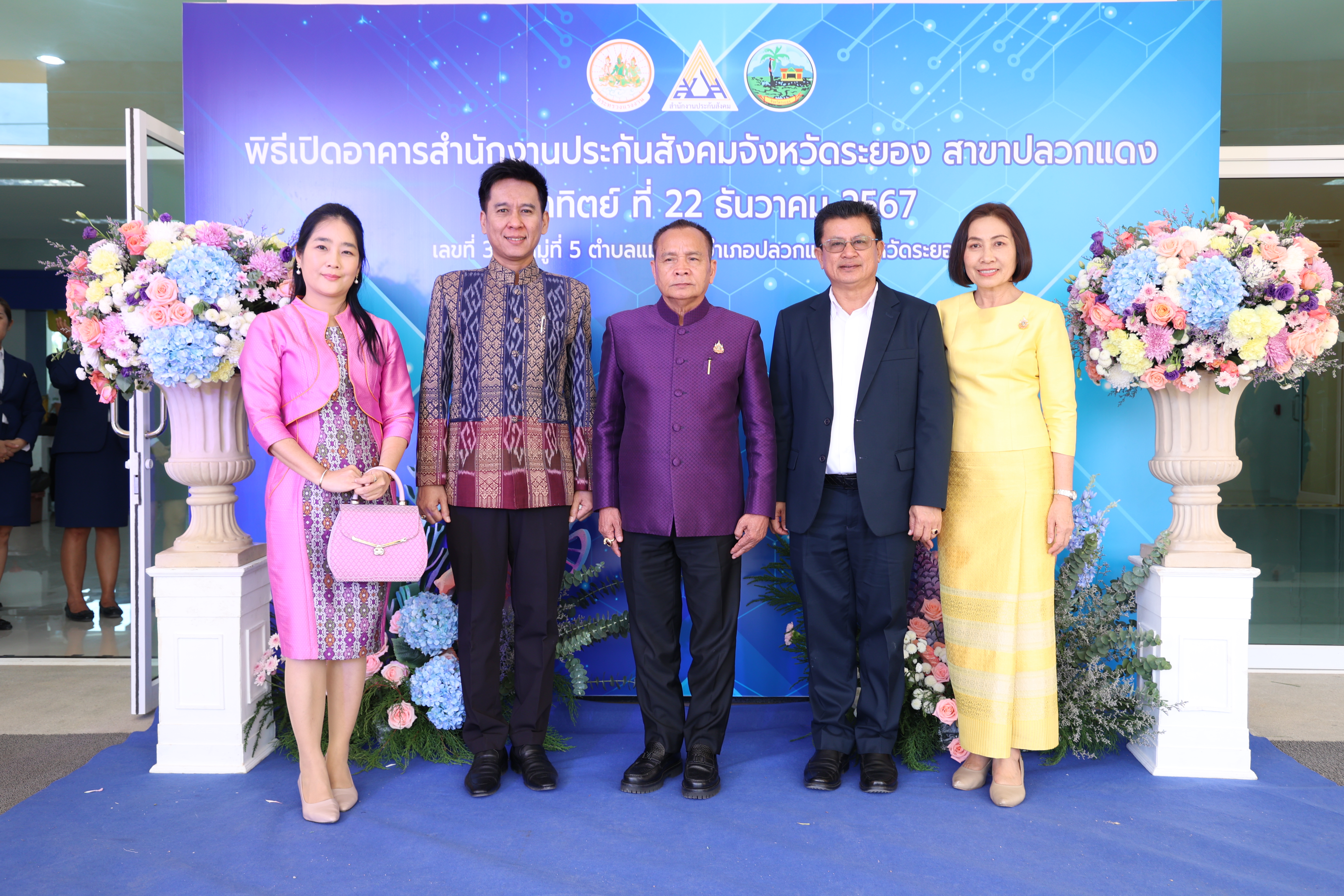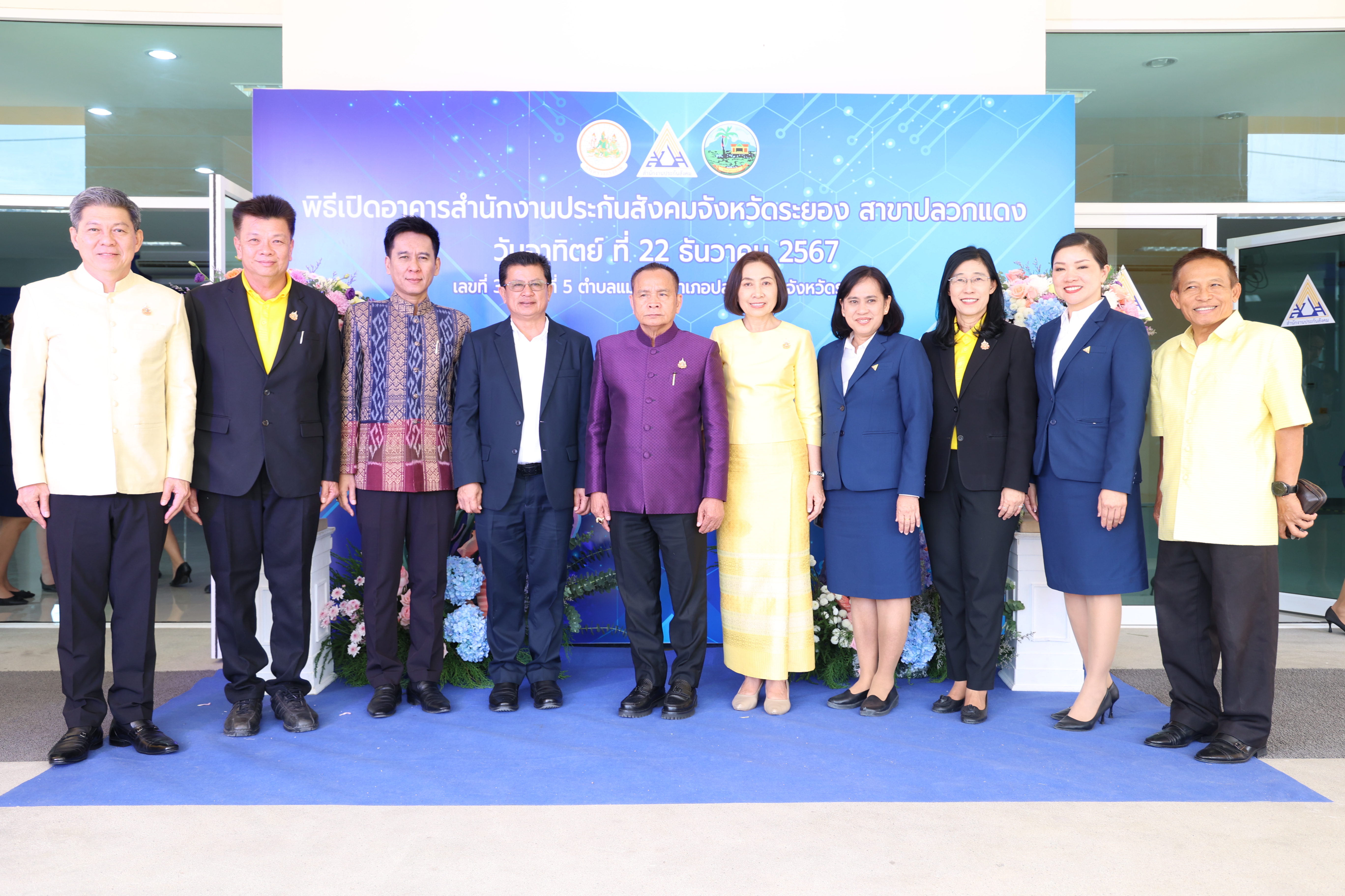 ด้าน นางมารศรี ใจรังษี เลขาธิการสำนักงานประกันสังคม กล่าวว่า สำนักงานประกันสังคมได้รับจัดสรรที่ดินจากกรมชลประทาน โดยตั้งอยู่บริเวณอ่างเก็บน้ำหนองปลาไหล ตำบลแม่น้ำคู้ อำเภอปลวกแดง จังหวัดระยอง เป็นเนื้อที่ 6 ไร่ 2 งาน 75 ตารางวา ในการก่อสร้างสำนักงานประกันสังคมจังหวัดระยอง สาขาปลวกแดง เพื่อให้บริการและอำนวยความสะดวกแก่ผู้รับบริการด้านต่างๆ โดยได้เปิดให้บริการตั้งแต่วันที่ 26 พฤศจิกายน 2567 ซึ่งพิธีเปิดอาคารสำนักงานประกันสังคมจังหวัดระยอง สาขาปลวกแดง ในวันนี้ได้รับเกียรติจากคณะผู้บริหารในสังกัดกระทรวงแรงงาน คณะผู้บริหารสำนักงานประกันสังคม หัวหน้าส่วนราชการจังหวัดระยอง หัวหน้าส่วนราชการในสังกัดกระทรวงแรงงานทั้งส่วนกลางและส่วนภูมิภาค รวมถึงผู้บริหารสถานประกอบการ สถานพยาบาล เครือข่ายอาสาสมัครแรงงาน เครือข่ายประกันสังคม และผู้ประกันตนในพื้นที่ เข้าร่วมงาน ในโอกาสนี้ ขอขอบคุณแขกผู้มีเกียรติทุกท่านที่มาร่วมงาน เพื่อความเป็นสิริมงคลให้กับสำนักงานประกันสังคม ที่มีเป้าหมาย ร่วมการขับเคลื่อนนโยบายกระทรวงแรงงาน “สร้างหลักประกันทางสังคม เน้นทักษะทันสมัย ให้คนไทยมีงานทำ สร้างวัฒนธรรมความปลอดภัย เศรษฐกิจ และแรงงานไทยที่มั่นคง”