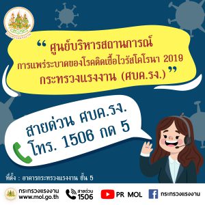 “นายจ้าง ลูกจ้าง พี่น้องผู้ใช้แรงงานที่ได้รับผลกระทบจากโควิด-19 สามารถประสานความช่วยเหลือมายังกระทรวงแรงงานได้ที่สายด่วน 1506 กด 5 โดยกระทรวงแรงงานจะมีเจ้าหน้าที่ผู้เชี่ยวชาญในแต่ละด้านคอยบริการให้ความช่วยเหลือเป็นการเร่งด่วนต่อไป” รมว.แรงงาน กล่าวในท้ายสุด