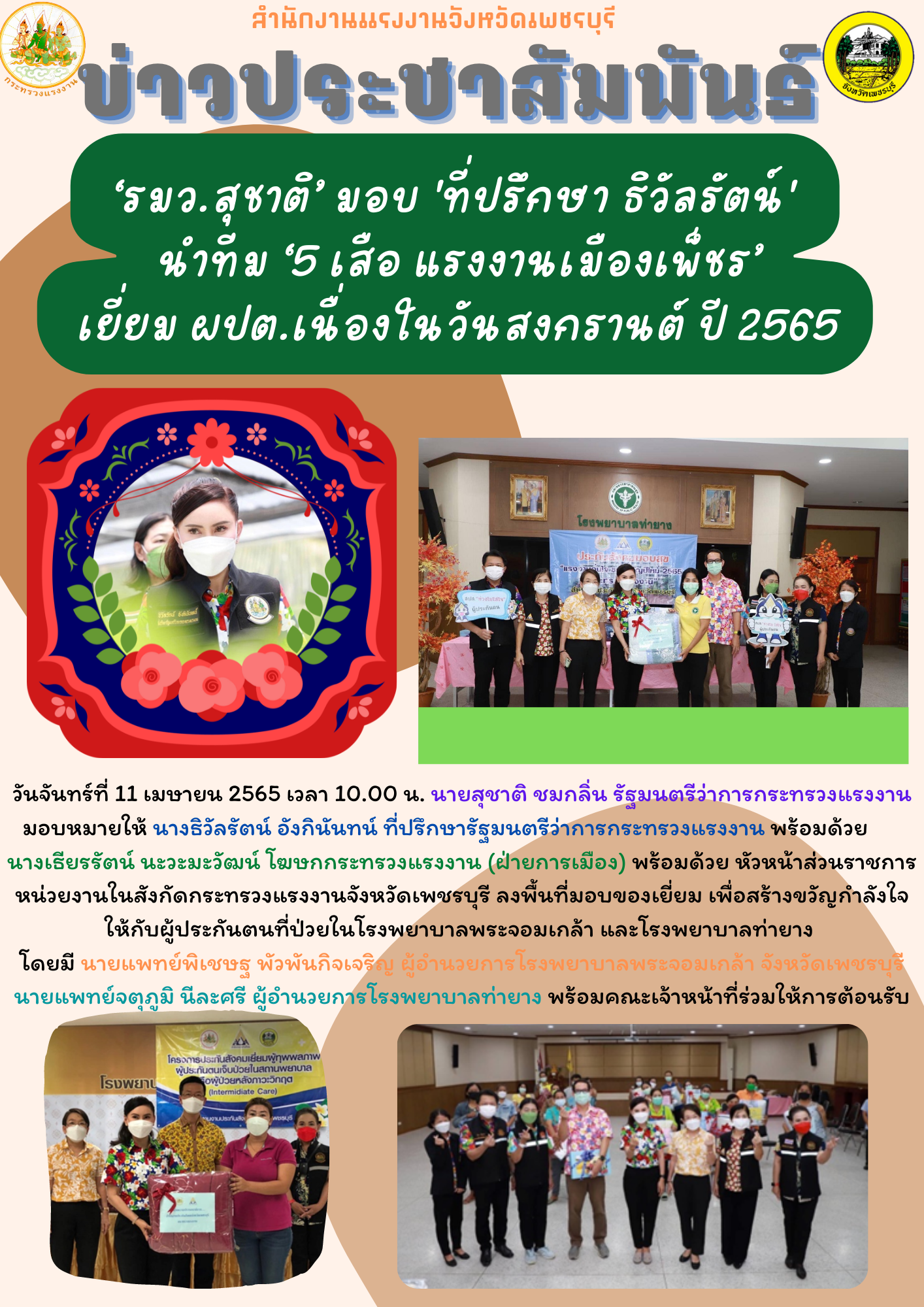 วันจันทร์ที่ 11 เมษายน 2565 เวลา 10.00 น. นายสุชาติ ชมกลิ่น รัฐมนตรีว่าการกระทรวงแรงงาน มอบหมายให้ นางธิวัลรัตน์ อังกินันทน์ ที่ปรึกษารัฐมนตรีว่าการกระทรวงแรงงาน พร้อมด้วย นางเธียรรัตน์ นะวะมะวัฒน์ โฆษกกระทรวงแรงงาน (ฝ่ายการเมือง) พร้อมด้วย หัวหน้าส่วนราชการหน่วยงานในสังกัดกระทรวงแรงงานจังหวัดเพชรบุรี ลงพื้นที่มอบของเยี่ยม เพื่อสร้างขวัญกำลังใจให้กับผู้ประกันตนที่ป่วยในโรงพยาบาลพระจอมเกล้า และโรงพยาบาลท่ายาง โดยมี นายแพทย์พิเชษฐ พัวพันกิจเจริญ ผู้อำนวยการโรงพยาบาลพระจอมเกล้า จังหวัดเพชรบุรี นายแพทย์จตุภูมิ นีละศรี ผู้อำนวยการโรงพยาบาลท่ายาง พร้อมคณะเจ้าหน้าที่ร่วมให้การต้อนรับ