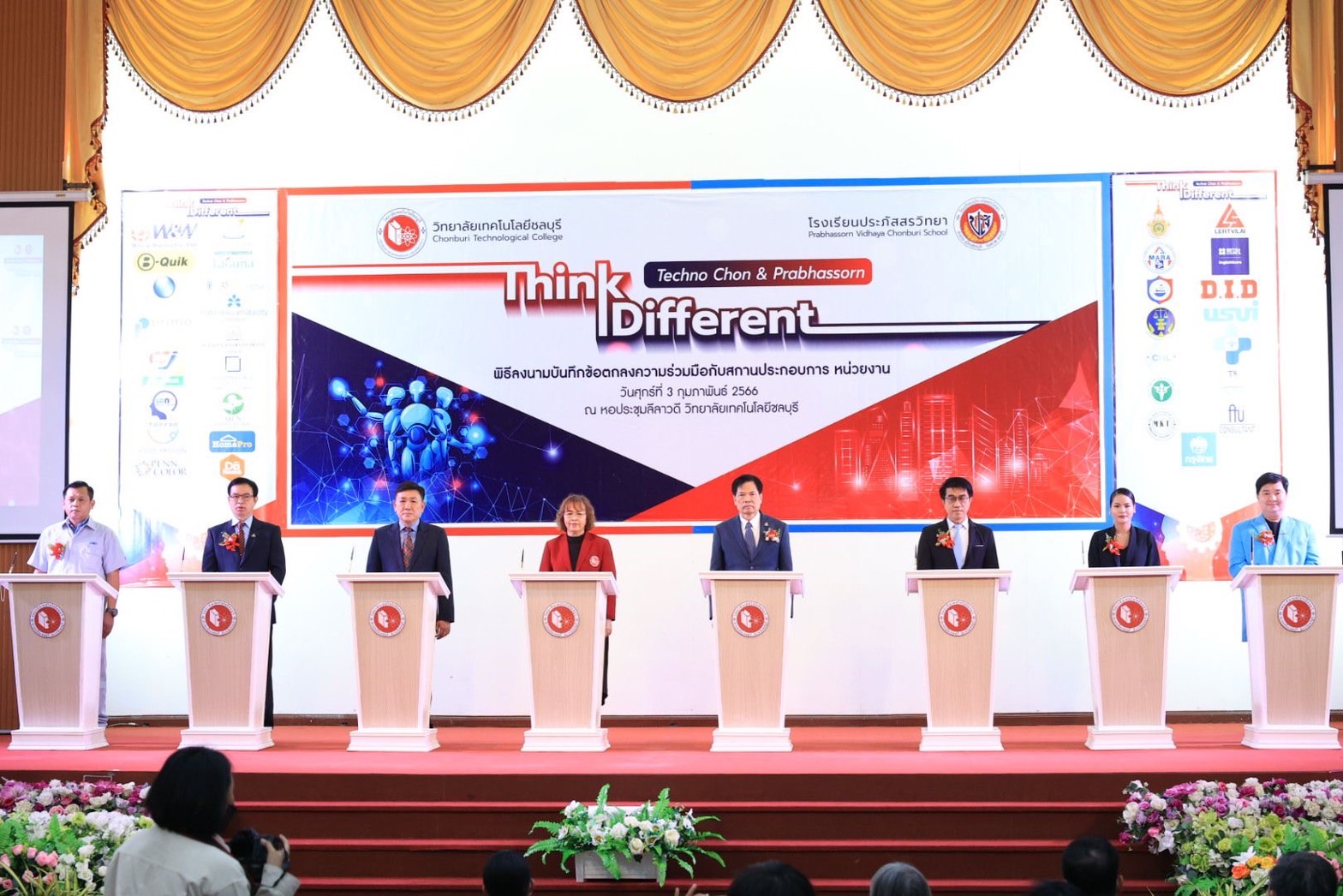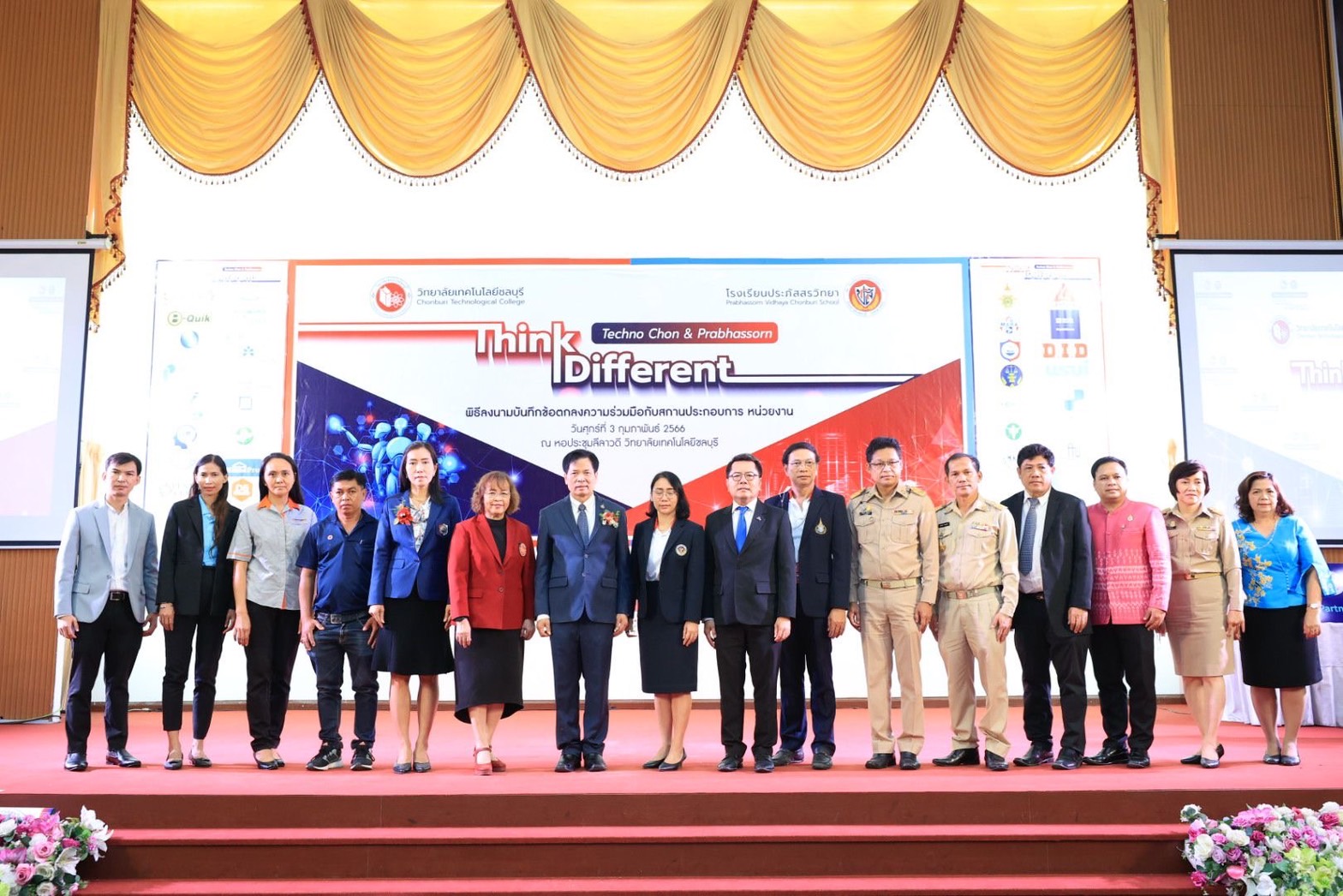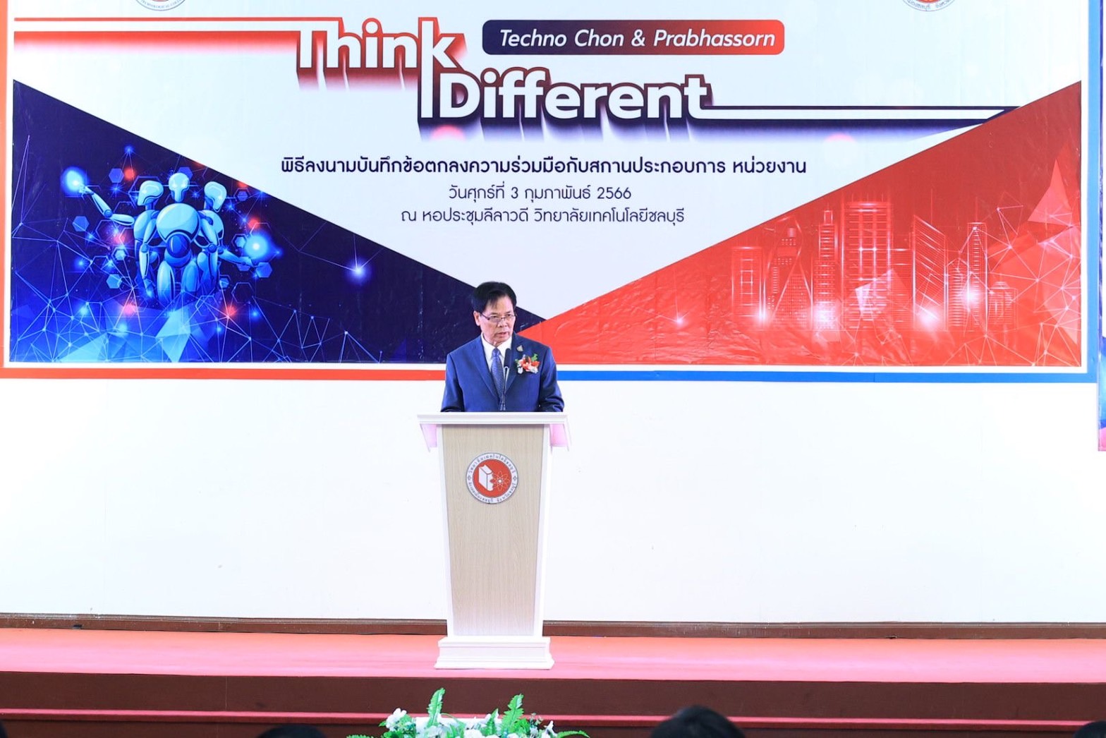 วันที่ 3 กุมภาพันธ์ 2566 เวลา 10.00 น.นายสุชาติ ชมกลิ่น รัฐมนตรีว่าการกระทรวงแรงงาน มอบหมายให้ นายสุเทพ ชิตยวงษ์ เลขานุการรัฐมนตรีว่าการกระทรวงแรงงาน เป็นประธานพิธีเปิดงาน Techno Chon & Prabhassorn “Think Different” และร่วมเป็นสักขีพยานการลงนามความร่วมมือกับสถานประกอบการ 30 แห่ง พร้อมมอบโล่-เกียรติบัตรให้กับหน่วยงานที่ให้การสนับสนุน และร่วมพัฒนาการจัดการเรียนการสอนกับทางวิทยาลัยฯ 19 แห่ง โดยมี ดร.อุไรวรรณ ตันประภัสร์ ประธานกรรมการบริหารวิทยาลัยเทคโนโลยีชลบุรี ผู้บริหารสถานศึกษา ผู้บริหารระดับสูงกระทรวงแรงงานและกระทรวงศึกษาธิการ ผู้แทนภาครัฐและเอกชน หัวหน้าส่วนราชการหน่วยงานกระทรวงแรงงานจังหวัดชลบุรี ร่วมให้การต้อนรับ ณ หอประชุมลีลาวดี วิทยาลัยเทคโนโลยีชลบุรี