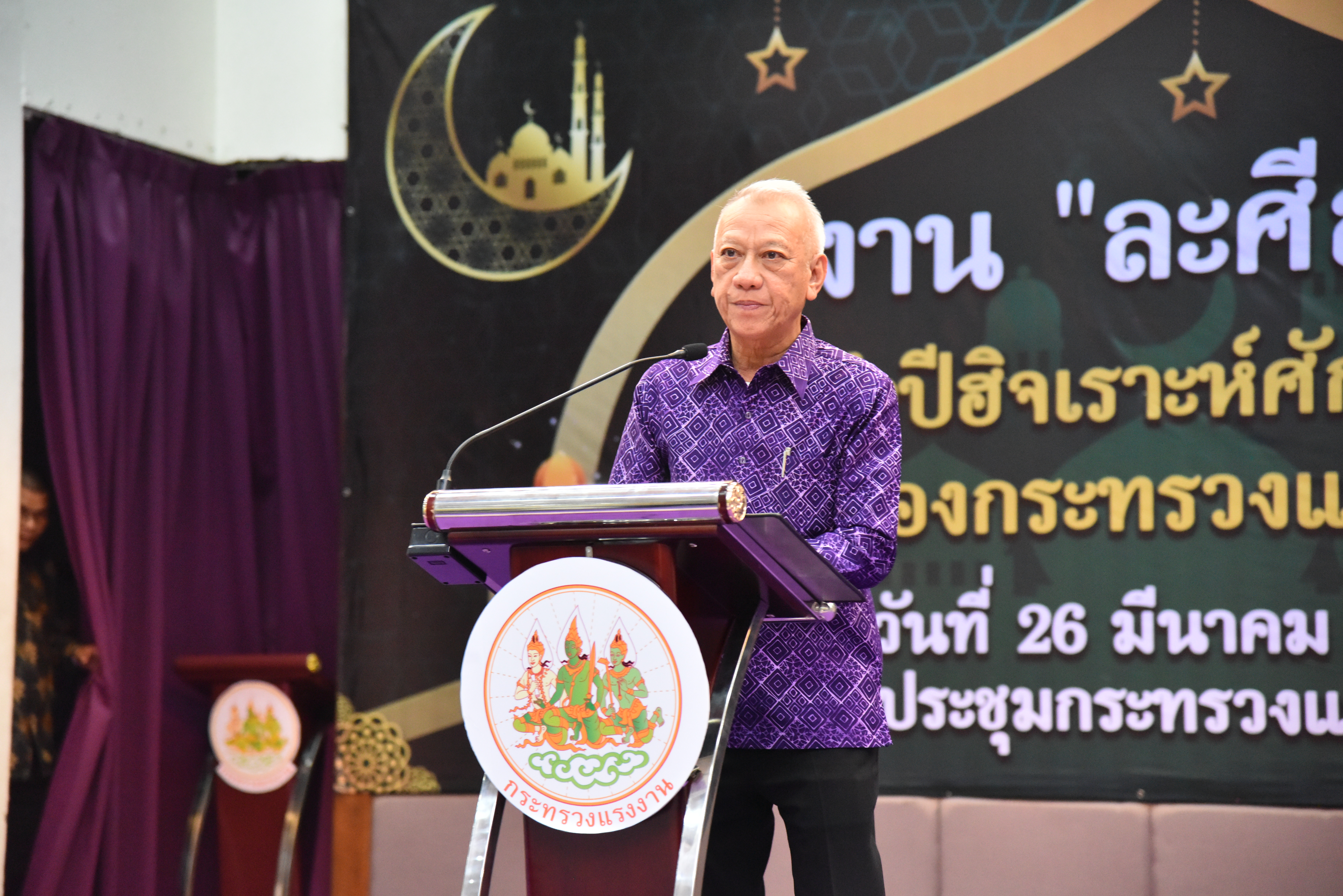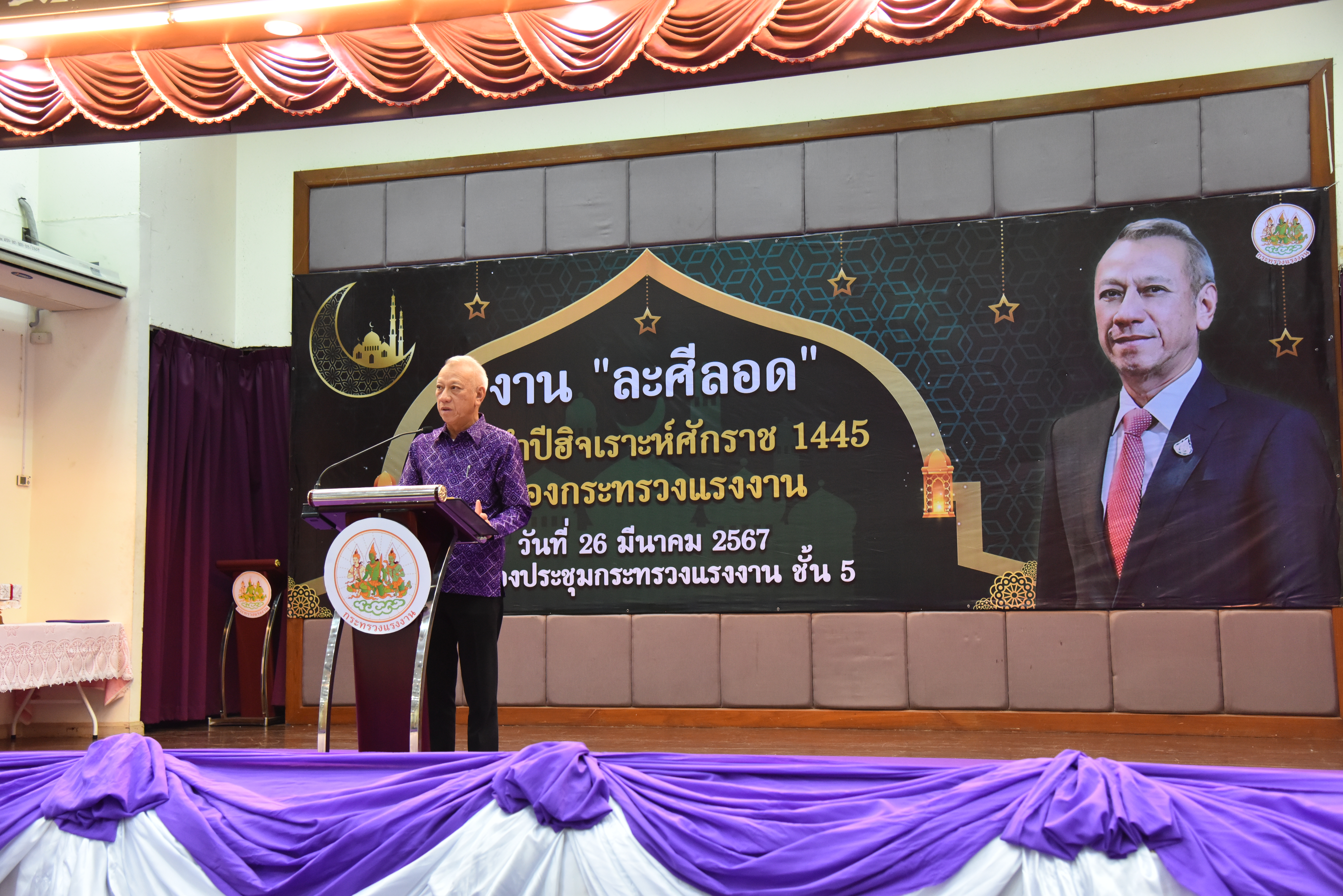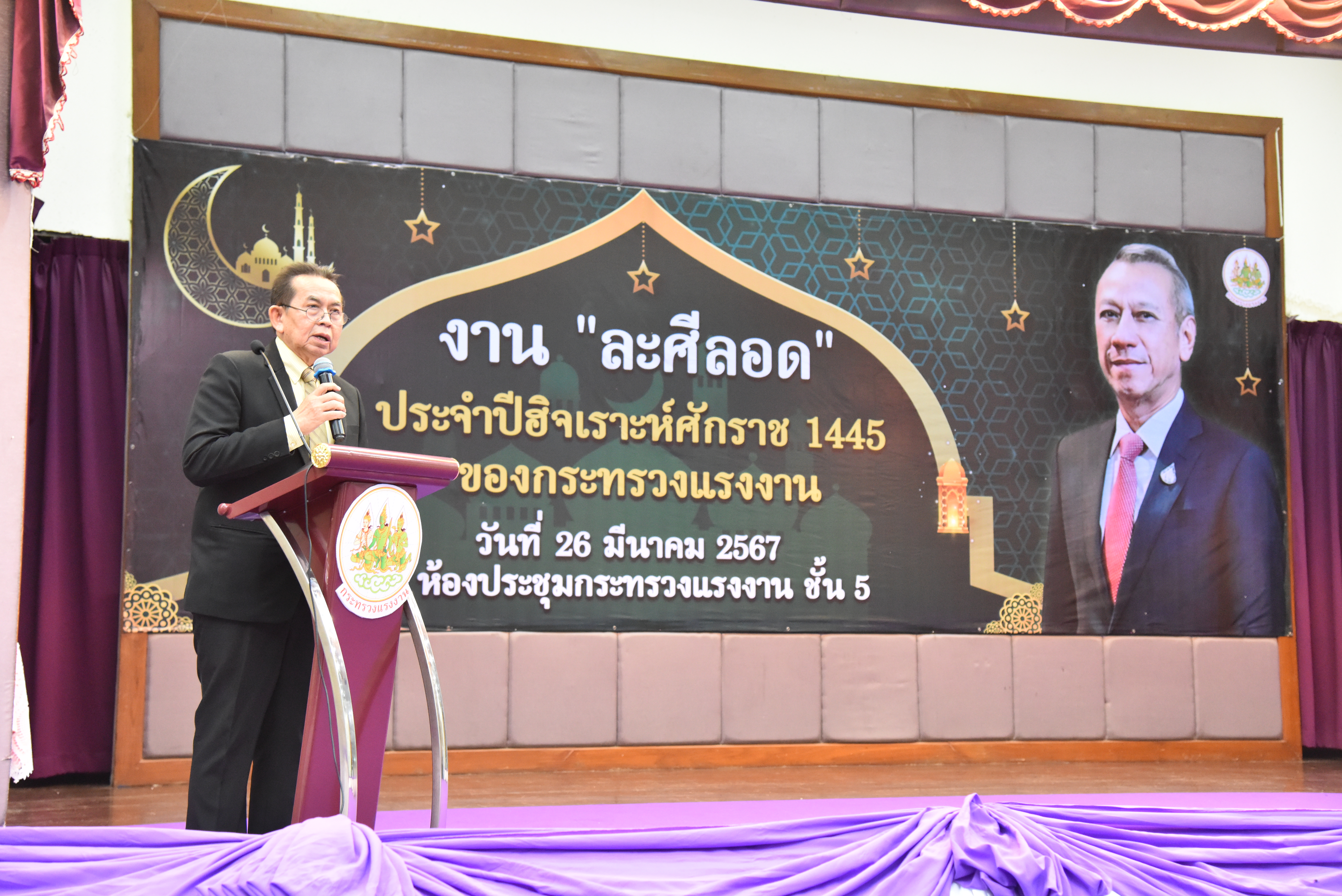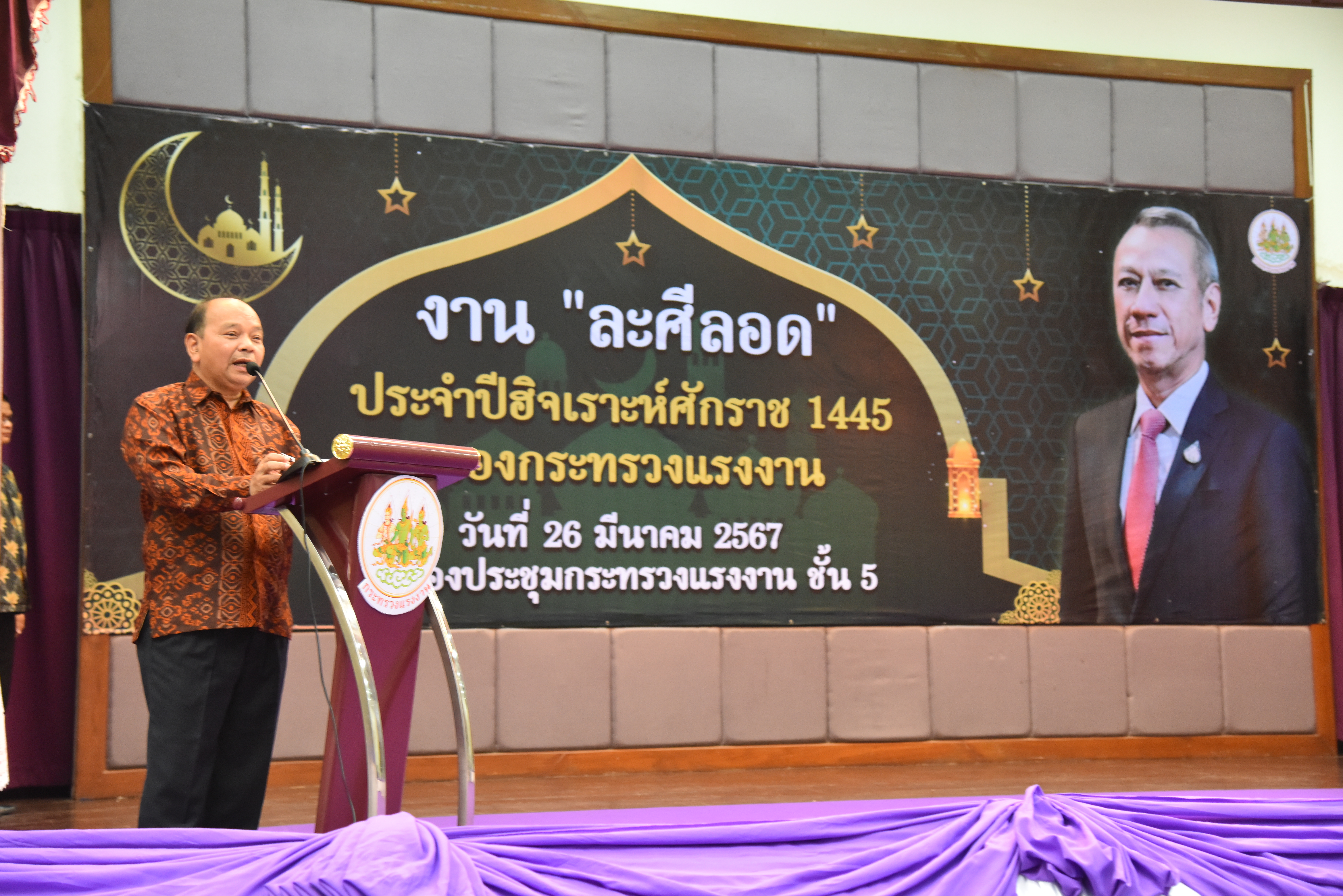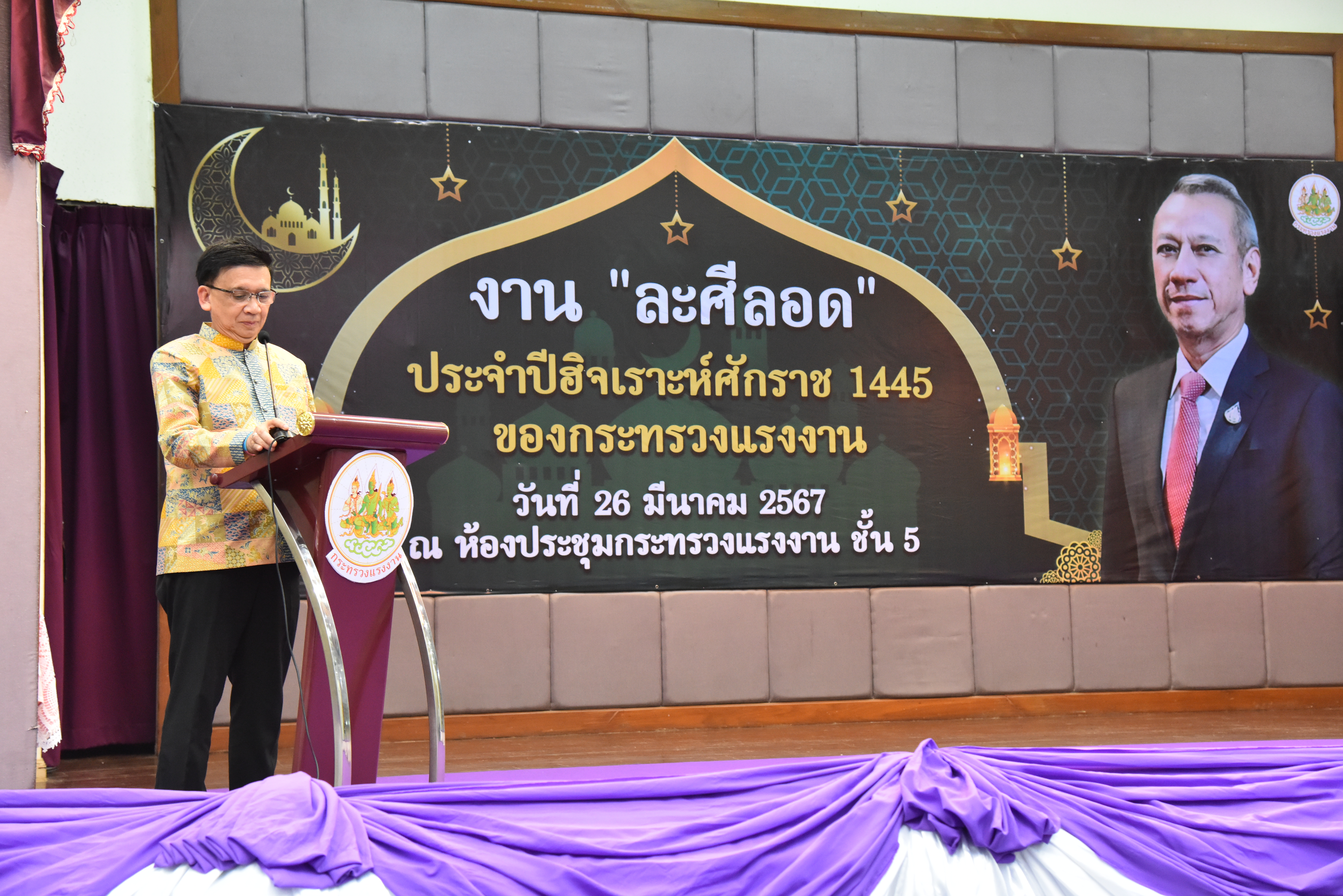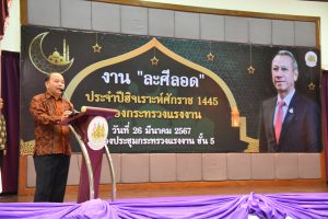 วันที่ 26 มีนาคม 2567 เวลา 17.30 น. นายพิพัฒน์ รัชกิจประการ รัฐมนตรีว่าการกระทรวงแรงงาน เป็นประธานกล่าวเปิดงาน “ละศีลอด” ของกระทรวงแรงงาน โดยมี นายไพโรจน์ โชติกเสถียร ปลัดกระทรวงแรงงาน กล่าวต้อนรับ นายนัจมุดดีน อูมา ประธานคณะทำงานรัฐมนตรีว่าการกระทรวงแรงงาน กล่าวรายงานวัตถุประสงค์การจัดงาน นายสิรภพ ดวงสอดศรี ผู้ช่วยรัฐมนตรีประจำกระทรวงแรงงานอาจารย์ประสาน ศรีเจริญ ประธานที่ปรึกษาผู้ทรงคุณวุฒิ สำนักจุฬาราชมนตรี นายไพโรจน์ มินเด็น ตุลาการศาลปกครองสูงสุด สมาชิกวุฒิสภา สมาชิกสภาผู้แทนราษฎร ประธานคณะทำงานรัฐมนตรีว่าการกระทรวงแรงงาน อัครราชทูต สถานเอกอัครราชทูตอินโดนีเซีย อัครราชทูตที่ปรึกษา สถานเอกอัครราชทูตมาเลเซีย ผู้บริหาร ข้าราชการ พนักงาน เจ้าหน้าที่กระทรวงแรงงาน สื่อมวลชน และแขกผู้มีเกียรติ เข้าร่วมงานกว่า 200 คน ณ ห้องประชุมกระทรวงแรงงาน ชั้น 5 อาคารกระทรวงแรงงาน