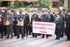 วันที่ 18 มกราคม 2567 เวลา 08.30 น.นายพิพัฒน์ รัชกิจประการ รัฐมนตรีว่าการกระทรวงแรงงาน มอบหมายให้ นายอารี ไกรนรา เลขานุการรัฐมนตรีว่าการกระทรวงแรงงาน เป็นประธานการประชุมหารือพร้อมรับยื่นหนังสือจาก นายไพทูรย์ โพธิ์ทอง ตัวแทนพนักงานรักษาความปลอดภัย (รปภ.) และคณะ ที่ได้นำตัวแทนพนักงานอาชีพ รปภ.จำนวนประมาณ 100 คน รวมตัวกันเพื่อขอให้ช่วยพิจารณาร่างกฎหมายการจ่ายค่าล่วงเวลาพนักงานรักษาความปลอดภัยในส่วนที่เกิน 8 ชั่วโมงหรือการทำงานในวันหยุด ให้ได้รับเท่ากันกับลูกจ้างอื่นทั่วไปนั้น ซึ่งพนักงาน รปภ.มีความประสงค์ไม่ขอรับโอที 1.5 เท่า เนื่องจากหากนายจ้างให้ทำงานเพียง 8 ชั่วโมง ทำให้รายได้ไม่เพียงพอต่อค่าใช้จ่ายเลี้ยงดูครอบครัว โดยมี นายวรรณรัตน์ ศรีสุขใส รองปลัดกระทรวงแรงงาน นางสาวกาญจนา พูลแก้ว รองอธิบดีกรมสวัสดิการและคุ้มครองแรงงาน พร้อมด้วย คณะที่ปรึกษารัฐมนตรีว่าการกระทรวงแรงงาน และเจ้าหน้าที่ฝ่ายกฎหมายกรมสวัสดิการและคุ้มครองแรงงาน เข้าร่วม ณ บริเวณลานด้านหน้าอาคารกระทรวงแรงงาน